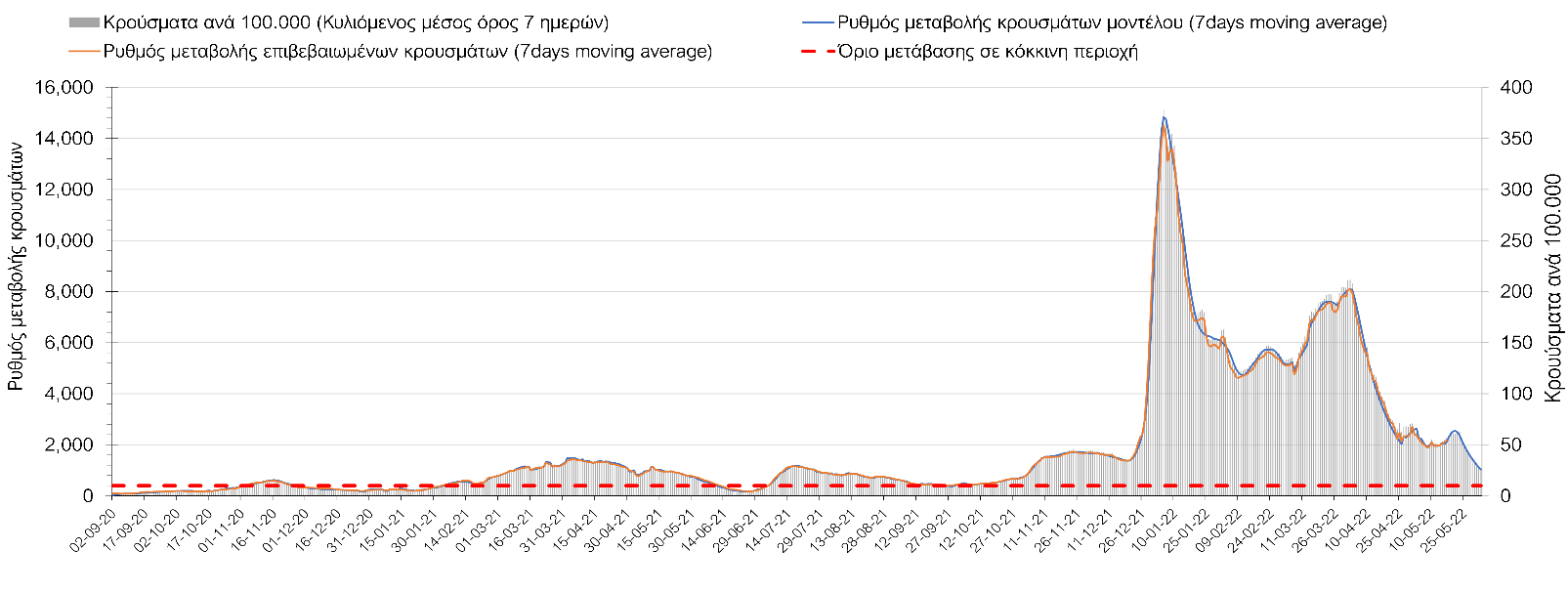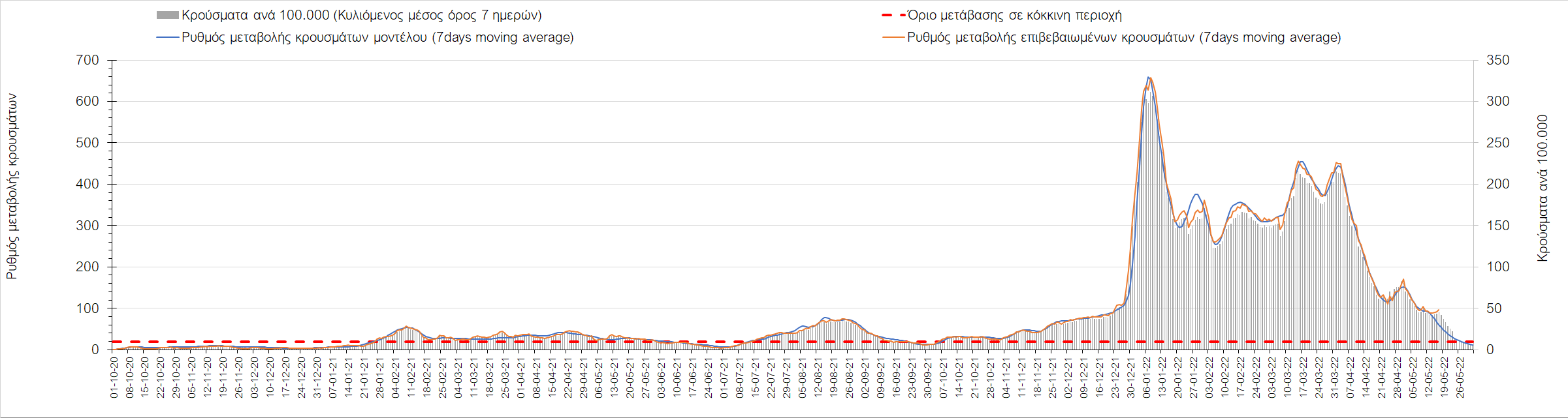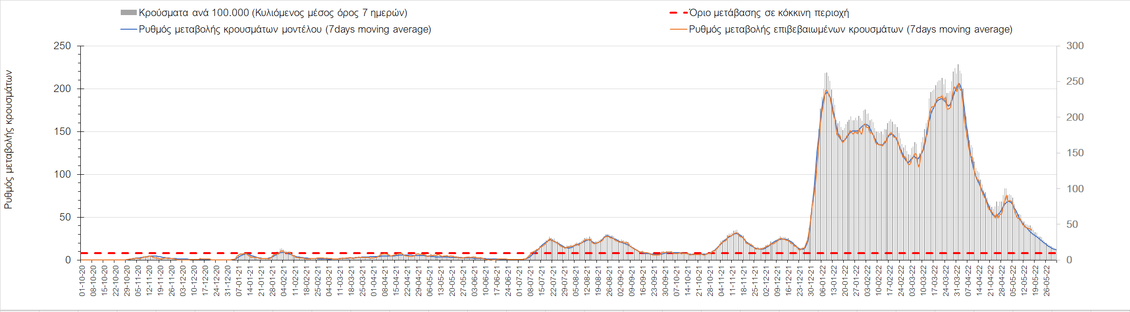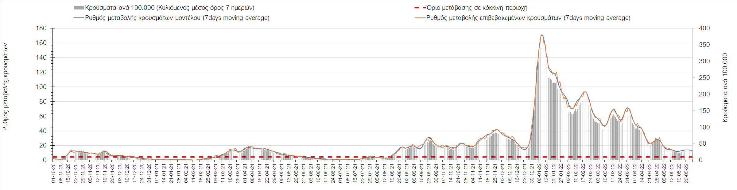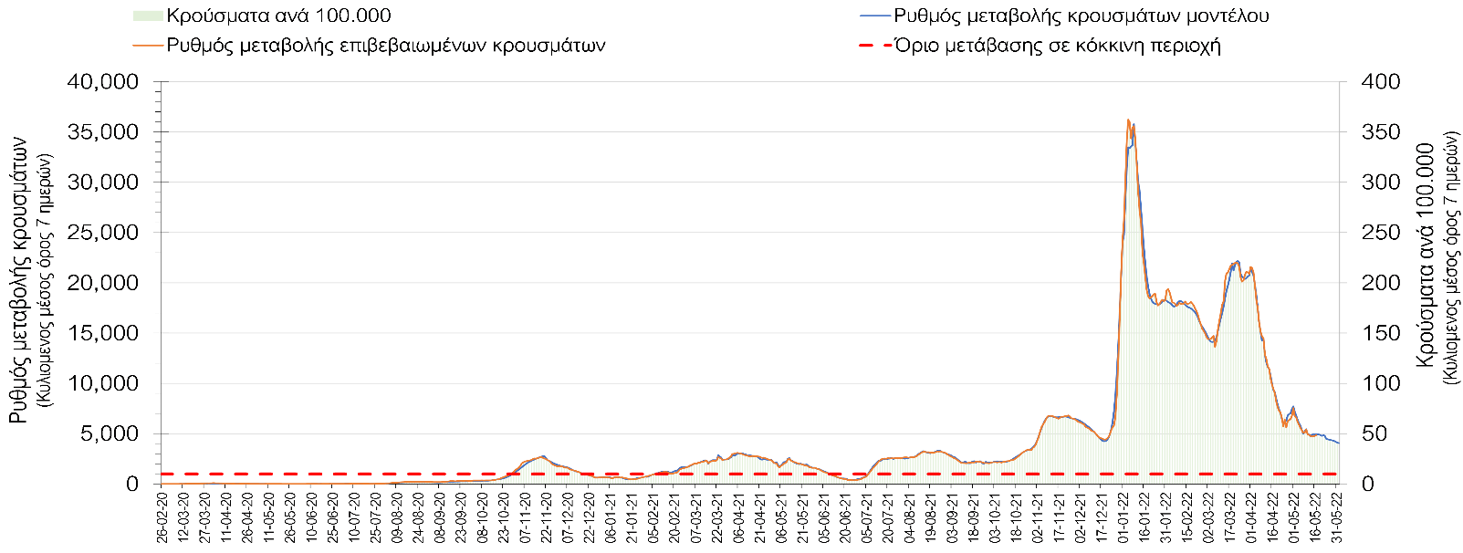 Παρατηρείται αναστροφή στην Αττική και σε έντονα τουριστικές περιοχές, η οποία αν και δεν αναμένουμε να έχει διάρκεια, αντικατοπτρίζεται και στον ημερήσιο αριθμό των κρουσμάτων (κυλιόμενος μέσος όρος 7 ημερών), ο οποίος και εμφανίζει οριακή άνοδο σε σχέση με τη Δευτέρα, και πλέον πλησιάζει ξανά τις 5000 (4.844). Για να επανέλθει η συστηματική αποκλιμάκωση της πανδημίας, πέρα από την εφαρμογή των μέτρων (σε συνδυασμό με την σημαντική συνειδητοποίηση εκ μέρους του πληθυσμού ότι χρειάζεται προσοχή και σύνεση για την αντιμετώπιση της διασποράς της παραλλαγής Ο), θα πρέπει να στοχεύσουμε στη διατήρηση και την επέκταση της επίκτητης ανοσίας του πληθυσμού, αλλά και στον μεγάλο αριθμό των τεστ συνολικά (μοριακά, rapid και self-test) που πραγματοποιούνται καθημερινά. Για αυτό το λόγο και με δεδομένη τη μεγάλη διασπορά στα σχολεία θεωρούμε πρόωρη την κατάργηση των self-test στα παιδιά σχολικής ηλικίας με την επιστροφή τους μετά την Πρωτομαγιά, ειδικά σε συνδυασμό με την ανοδική διακύμανση που παρατηρήθηκε.