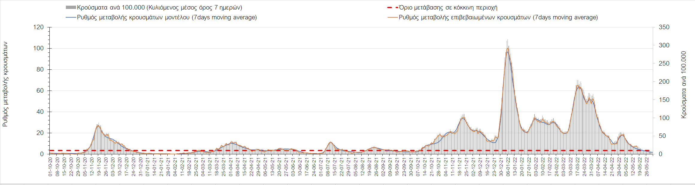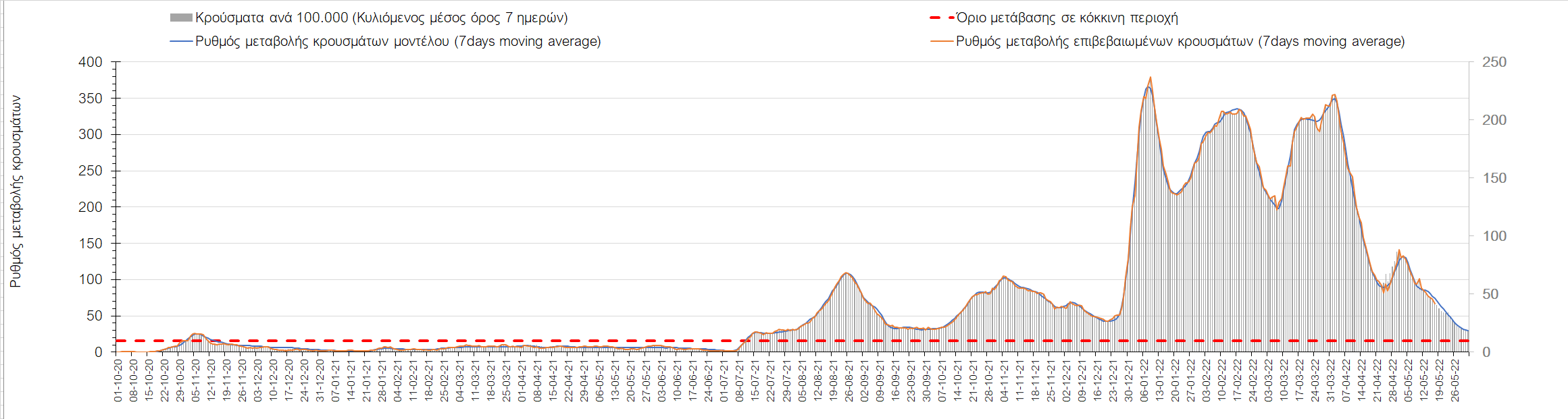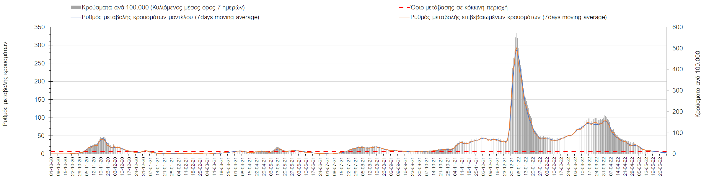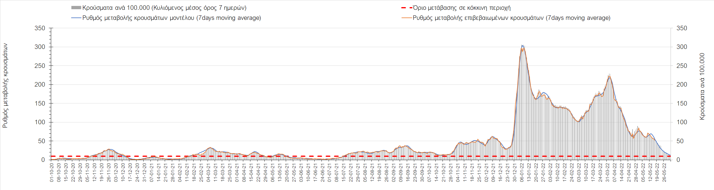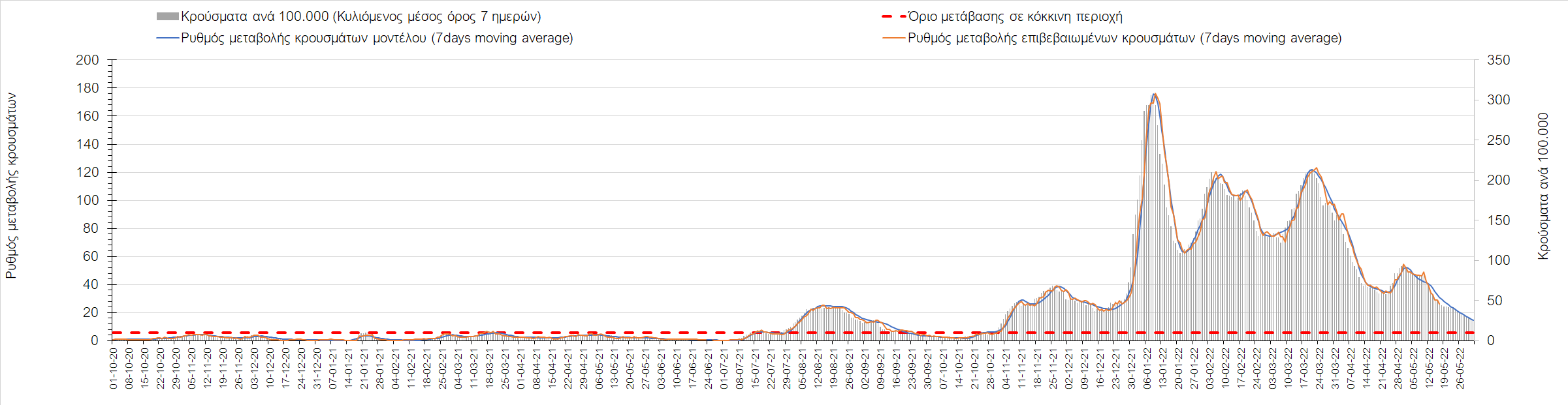 Παρατηρείται αναστροφή στην Αττική και σε έντονα τουριστικές περιοχές, η οποία αν και δεν αναμένουμε να έχει διάρκεια, αντικατοπτρίζεται και στον ημερήσιο αριθμό των κρουσμάτων (κυλιόμενος μέσος όρος 7 ημερών), ο οποίος και εμφανίζει οριακή άνοδο σε σχέση με τη Δευτέρα, και πλέον πλησιάζει ξανά τις 5000 (4.844). Για να επανέλθει η συστηματική αποκλιμάκωση της πανδημίας, πέρα από την εφαρμογή των μέτρων (σε συνδυασμό με την σημαντική συνειδητοποίηση εκ μέρους του πληθυσμού ότι χρειάζεται προσοχή και σύνεση για την αντιμετώπιση της διασποράς της παραλλαγής Ο), θα πρέπει να στοχεύσουμε στη διατήρηση και την επέκταση της επίκτητης ανοσίας του πληθυσμού, αλλά και στον μεγάλο αριθμό των τεστ συνολικά (μοριακά, rapid και self-test) που πραγματοποιούνται καθημερινά. Για αυτό το λόγο και με δεδομένη τη μεγάλη διασπορά στα σχολεία θεωρούμε πρόωρη την κατάργηση των self-test στα παιδιά σχολικής ηλικίας με την επιστροφή τους μετά την Πρωτομαγιά, ειδικά σε συνδυασμό με την ανοδική διακύμανση που παρατηρήθηκε.