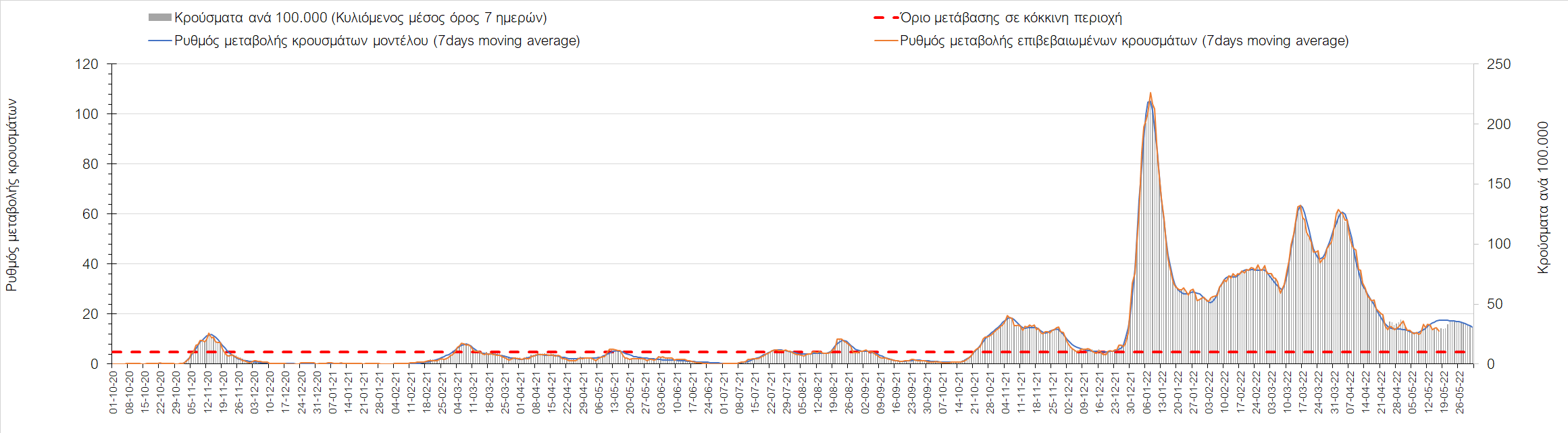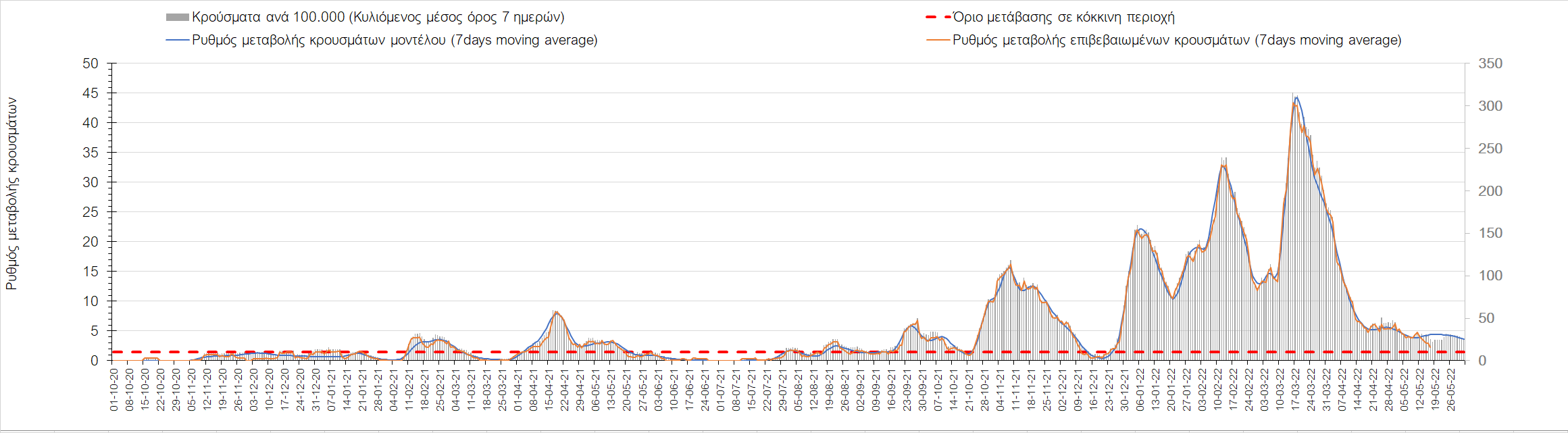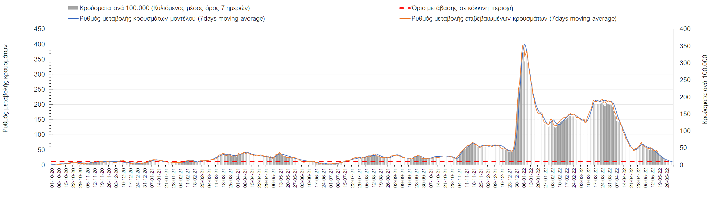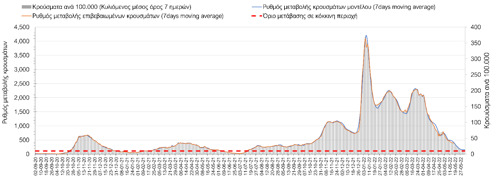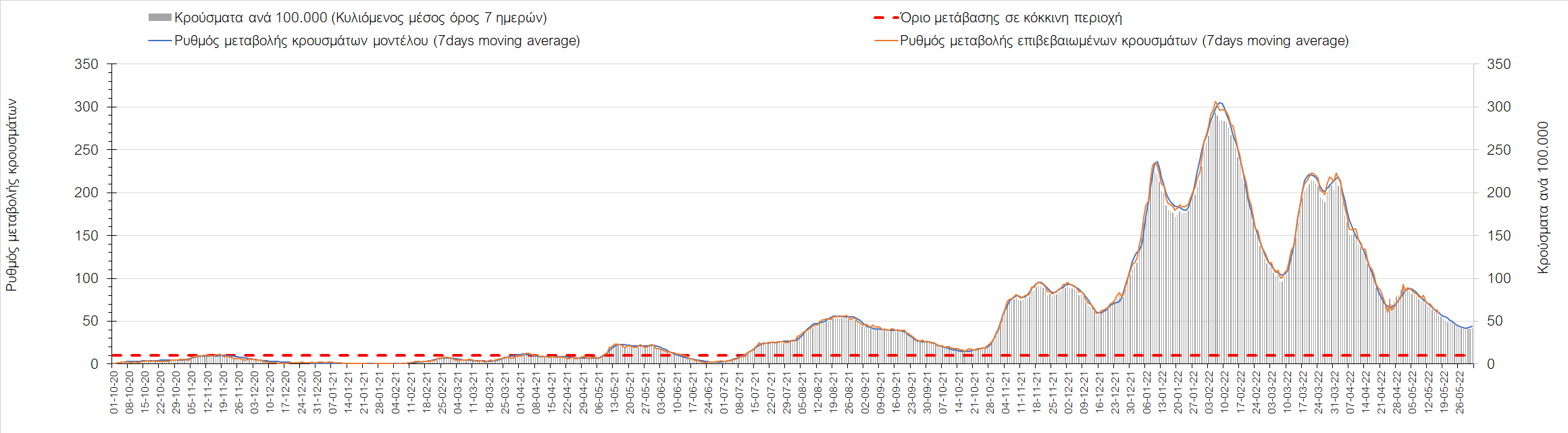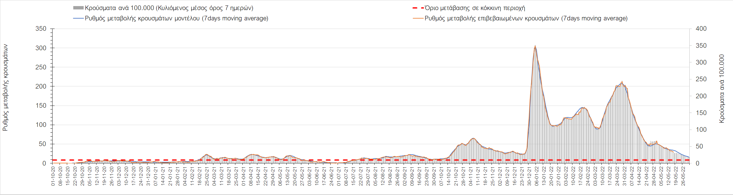 Παρατηρείται αναστροφή στην Αττική και σε έντονα τουριστικές περιοχές, η οποία αν και δεν αναμένουμε να έχει διάρκεια, αντικατοπτρίζεται και στον ημερήσιο αριθμό των κρουσμάτων (κυλιόμενος μέσος όρος 7 ημερών), ο οποίος και εμφανίζει οριακή άνοδο σε σχέση με τη Δευτέρα, και πλέον πλησιάζει ξανά τις 5000 (4.844). Για να επανέλθει η συστηματική αποκλιμάκωση της πανδημίας, πέρα από την εφαρμογή των μέτρων (σε συνδυασμό με την σημαντική συνειδητοποίηση εκ μέρους του πληθυσμού ότι χρειάζεται προσοχή και σύνεση για την αντιμετώπιση της διασποράς της παραλλαγής Ο), θα πρέπει να στοχεύσουμε στη διατήρηση και την επέκταση της επίκτητης ανοσίας του πληθυσμού, αλλά και στον μεγάλο αριθμό των τεστ συνολικά (μοριακά, rapid και self-test) που πραγματοποιούνται καθημερινά. Για αυτό το λόγο και με δεδομένη τη μεγάλη διασπορά στα σχολεία θεωρούμε πρόωρη την κατάργηση των self-test στα παιδιά σχολικής ηλικίας με την επιστροφή τους μετά την Πρωτομαγιά, ειδικά σε συνδυασμό με την ανοδική διακύμανση που παρατηρήθηκε.