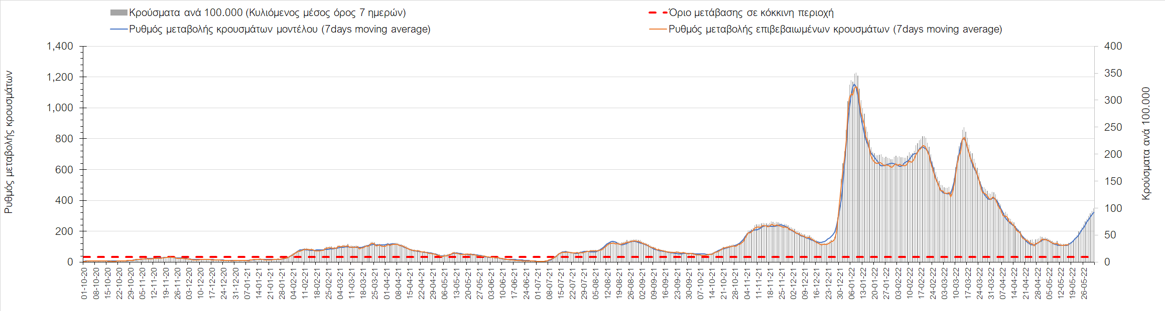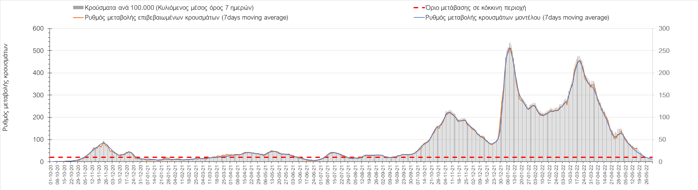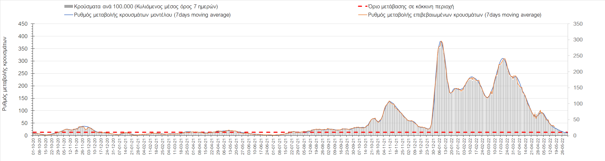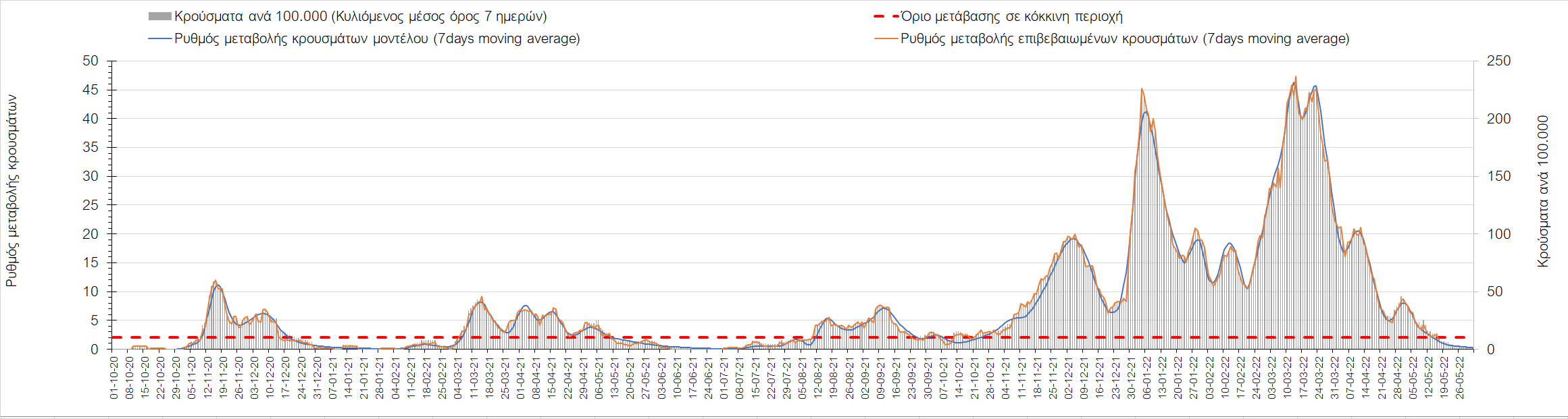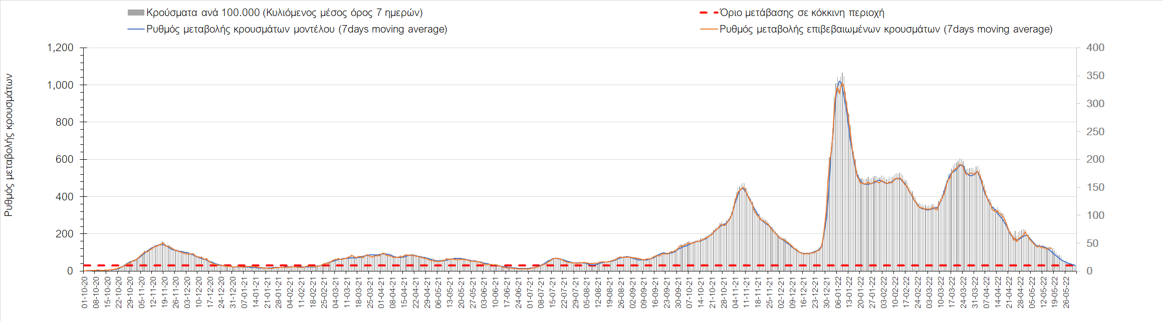 Παρατηρείται αναστροφή στην Αττική και σε έντονα τουριστικές περιοχές, η οποία αν και δεν αναμένουμε να έχει διάρκεια, αντικατοπτρίζεται και στον ημερήσιο αριθμό των κρουσμάτων (κυλιόμενος μέσος όρος 7 ημερών), ο οποίος και εμφανίζει οριακή άνοδο σε σχέση με τη Δευτέρα, και πλέον πλησιάζει ξανά τις 5000 (4.844). Για να επανέλθει η συστηματική αποκλιμάκωση της πανδημίας, πέρα από την εφαρμογή των μέτρων (σε συνδυασμό με την σημαντική συνειδητοποίηση εκ μέρους του πληθυσμού ότι χρειάζεται προσοχή και σύνεση για την αντιμετώπιση της διασποράς της παραλλαγής Ο), θα πρέπει να στοχεύσουμε στη διατήρηση και την επέκταση της επίκτητης ανοσίας του πληθυσμού, αλλά και στον μεγάλο αριθμό των τεστ συνολικά (μοριακά, rapid και self-test) που πραγματοποιούνται καθημερινά. Για αυτό το λόγο και με δεδομένη τη μεγάλη διασπορά στα σχολεία θεωρούμε πρόωρη την κατάργηση των self-test στα παιδιά σχολικής ηλικίας με την επιστροφή τους μετά την Πρωτομαγιά, ειδικά σε συνδυασμό με την ανοδική διακύμανση που παρατηρήθηκε.