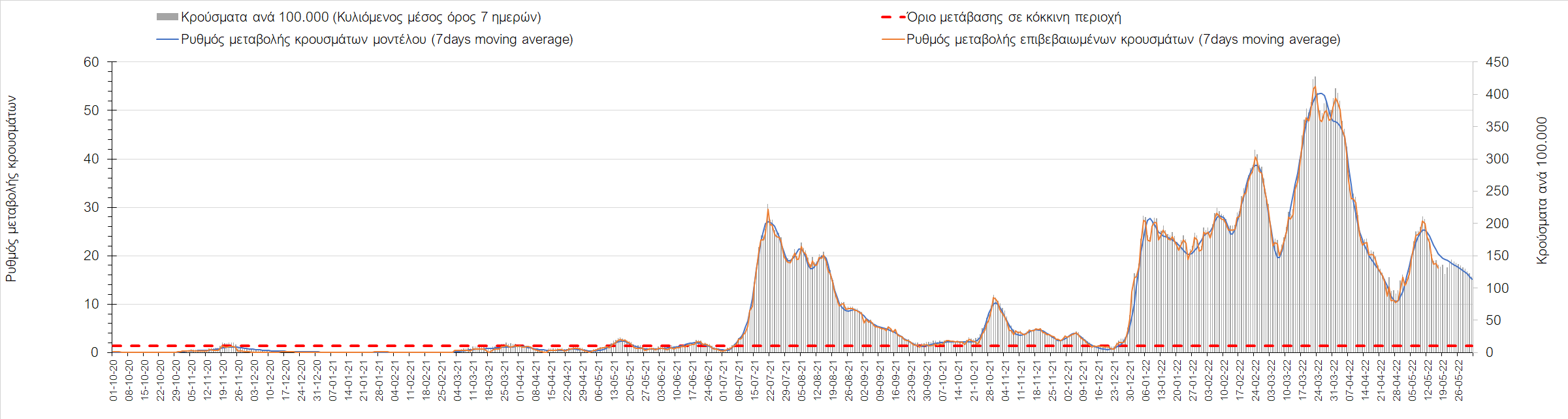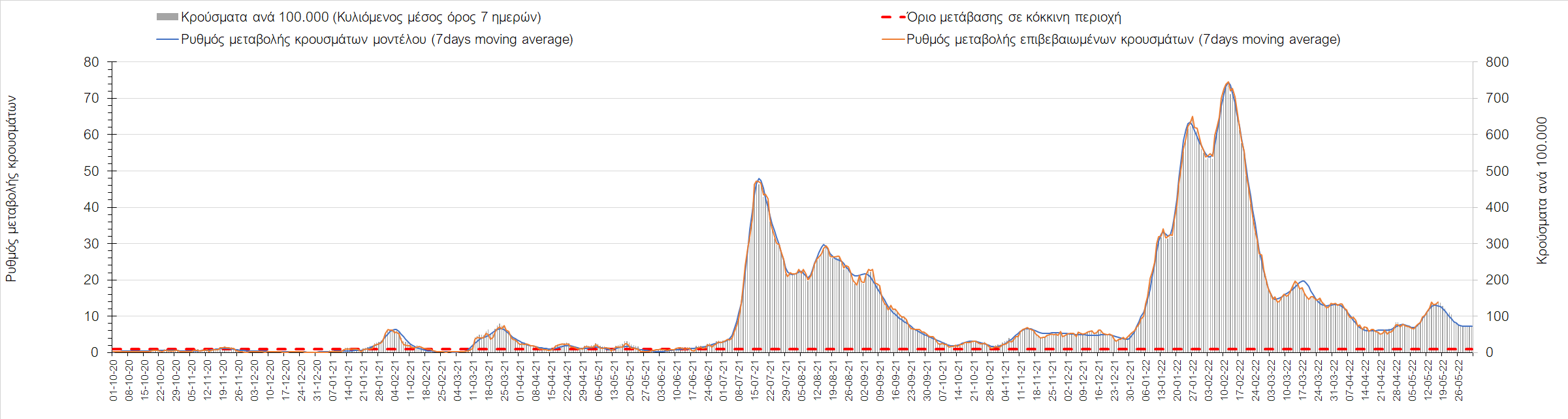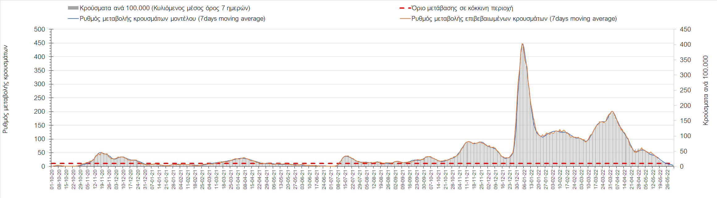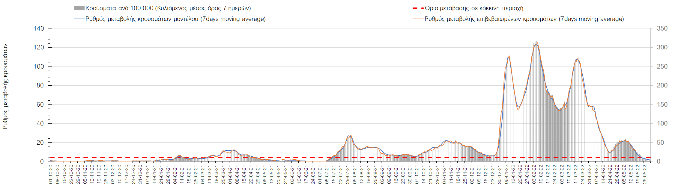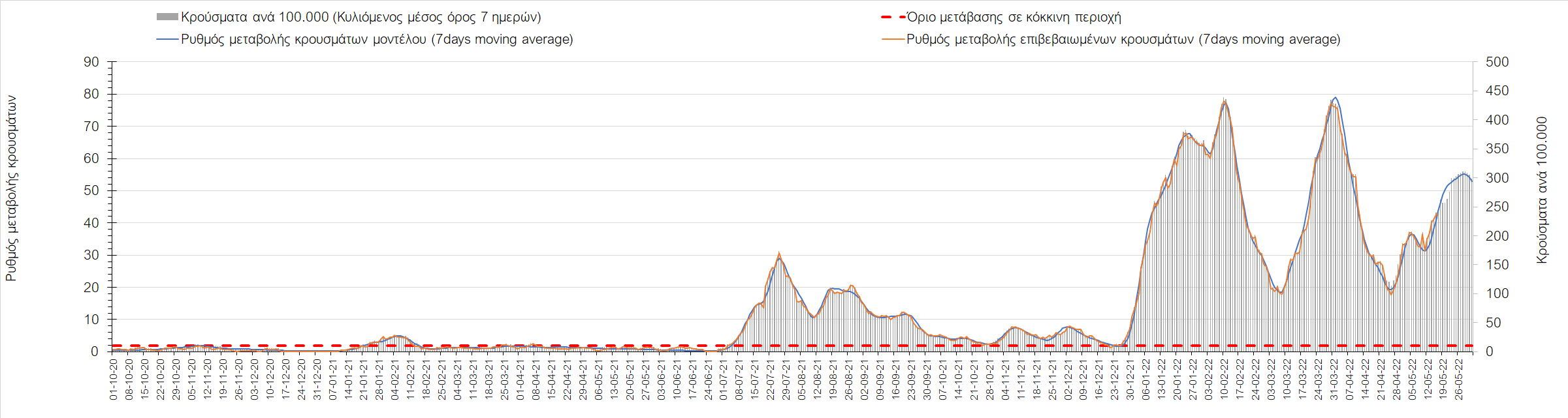 Παρατηρείται αναστροφή στην Αττική και σε έντονα τουριστικές περιοχές, η οποία αν και δεν αναμένουμε να έχει διάρκεια, αντικατοπτρίζεται και στον ημερήσιο αριθμό των κρουσμάτων (κυλιόμενος μέσος όρος 7 ημερών), ο οποίος και εμφανίζει οριακή άνοδο σε σχέση με τη Δευτέρα, και πλέον πλησιάζει ξανά τις 5000 (4.844). Για να επανέλθει η συστηματική αποκλιμάκωση της πανδημίας, πέρα από την εφαρμογή των μέτρων (σε συνδυασμό με την σημαντική συνειδητοποίηση εκ μέρους του πληθυσμού ότι χρειάζεται προσοχή και σύνεση για την αντιμετώπιση της διασποράς της παραλλαγής Ο), θα πρέπει να στοχεύσουμε στη διατήρηση και την επέκταση της επίκτητης ανοσίας του πληθυσμού, αλλά και στον μεγάλο αριθμό των τεστ συνολικά (μοριακά, rapid και self-test) που πραγματοποιούνται καθημερινά. Για αυτό το λόγο και με δεδομένη τη μεγάλη διασπορά στα σχολεία θεωρούμε πρόωρη την κατάργηση των self-test στα παιδιά σχολικής ηλικίας με την επιστροφή τους μετά την Πρωτομαγιά, ειδικά σε συνδυασμό με την ανοδική διακύμανση που παρατηρήθηκε.