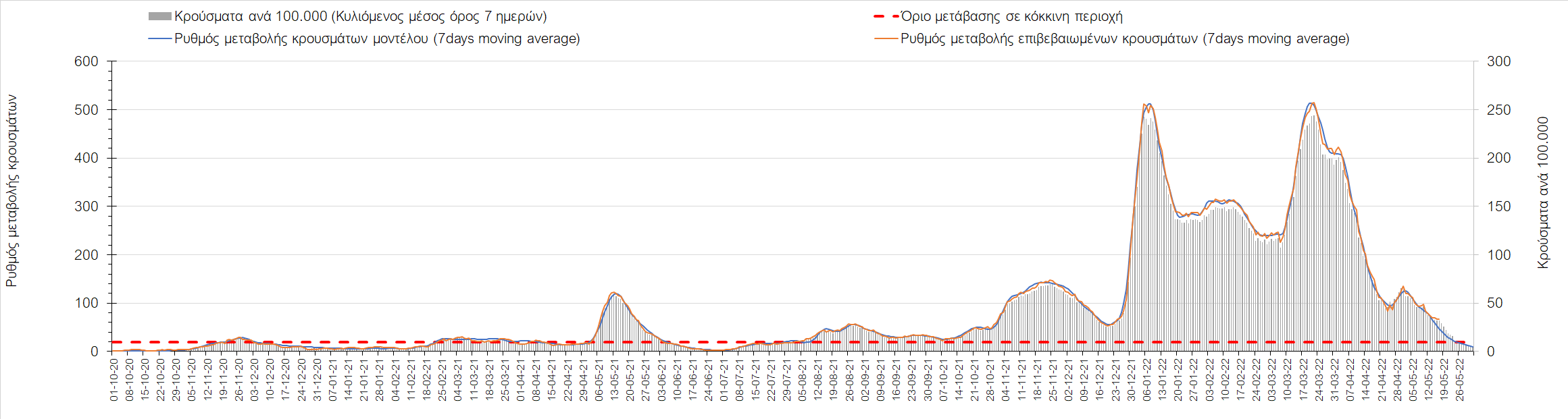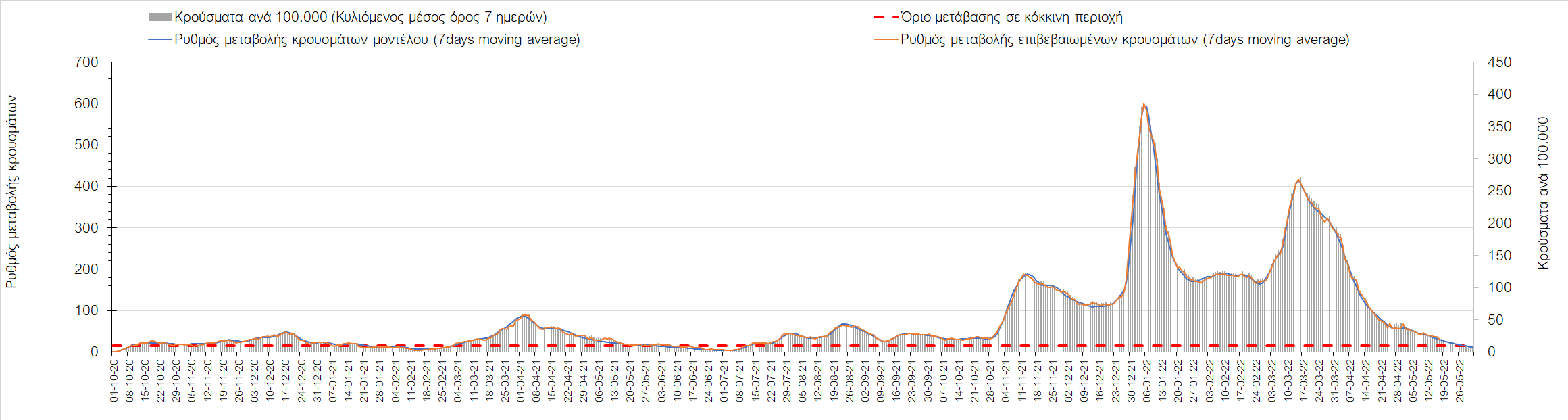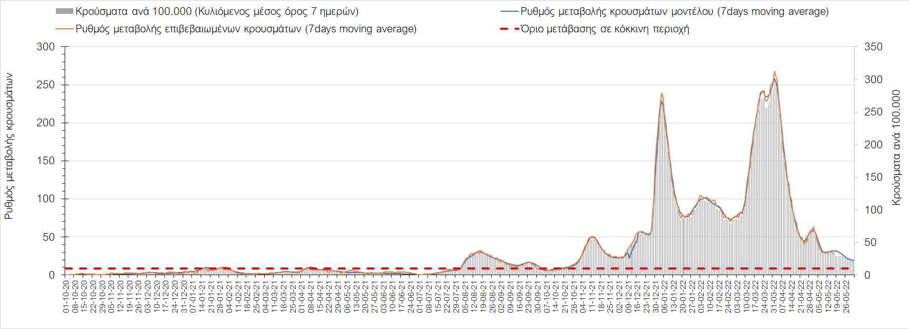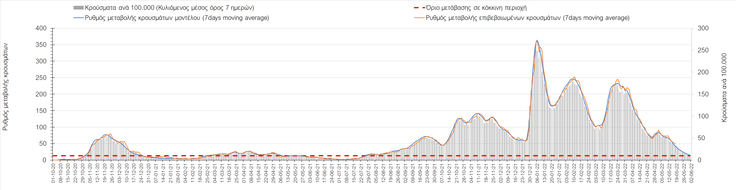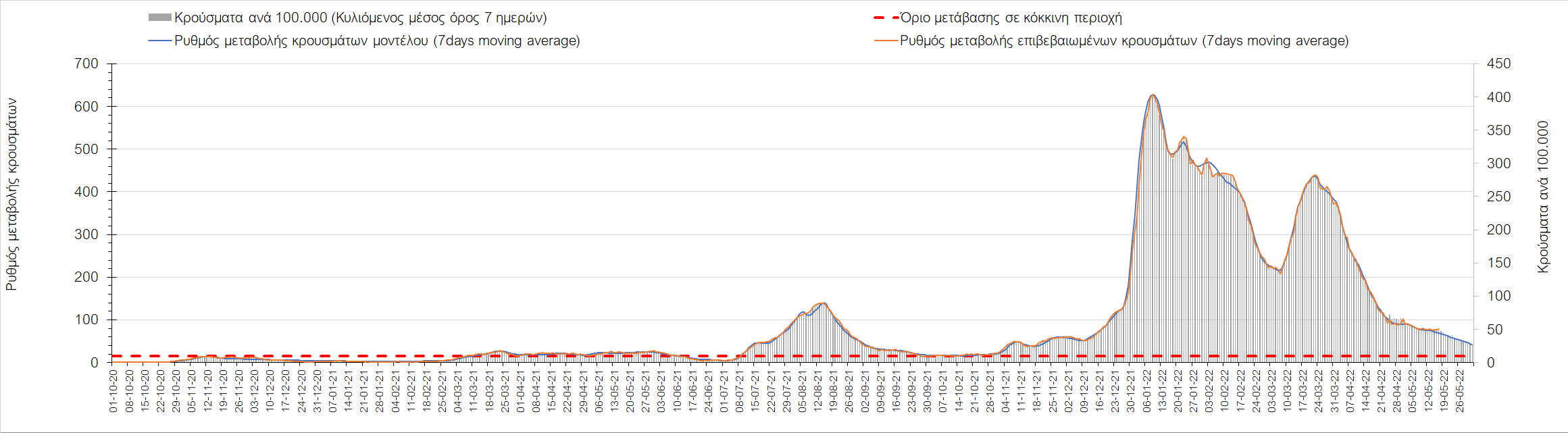 Παρατηρείται αναστροφή στην Αττική και σε έντονα τουριστικές περιοχές, η οποία αν και δεν αναμένουμε να έχει διάρκεια, αντικατοπτρίζεται και στον ημερήσιο αριθμό των κρουσμάτων (κυλιόμενος μέσος όρος 7 ημερών), ο οποίος και εμφανίζει οριακή άνοδο σε σχέση με τη Δευτέρα, και πλέον πλησιάζει ξανά τις 5000 (4.844). Για να επανέλθει η συστηματική αποκλιμάκωση της πανδημίας, πέρα από την εφαρμογή των μέτρων (σε συνδυασμό με την σημαντική συνειδητοποίηση εκ μέρους του πληθυσμού ότι χρειάζεται προσοχή και σύνεση για την αντιμετώπιση της διασποράς της παραλλαγής Ο), θα πρέπει να στοχεύσουμε στη διατήρηση και την επέκταση της επίκτητης ανοσίας του πληθυσμού, αλλά και στον μεγάλο αριθμό των τεστ συνολικά (μοριακά, rapid και self-test) που πραγματοποιούνται καθημερινά. Για αυτό το λόγο και με δεδομένη τη μεγάλη διασπορά στα σχολεία θεωρούμε πρόωρη την κατάργηση των self-test στα παιδιά σχολικής ηλικίας με την επιστροφή τους μετά την Πρωτομαγιά, ειδικά σε συνδυασμό με την ανοδική διακύμανση που παρατηρήθηκε.