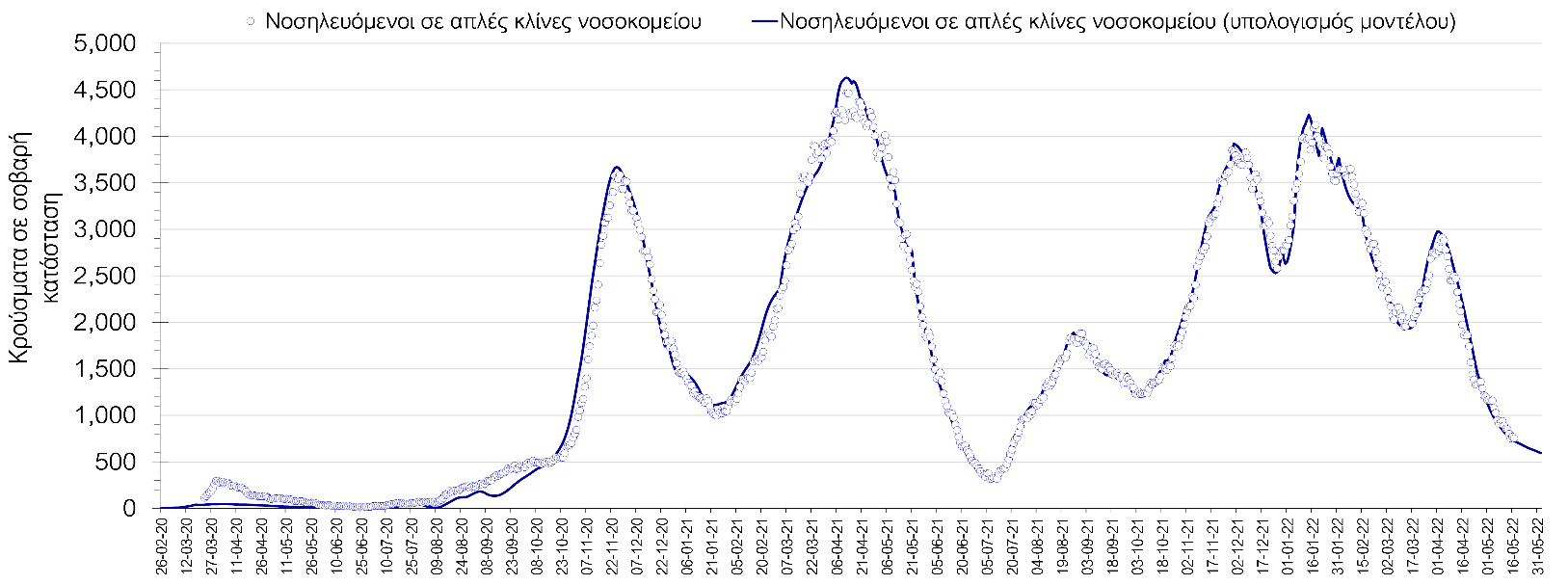 Η πορεία της μέσης εβδομαδιαίας τιμής των κρουσμάτων, καθώς και του κυλιόμενου μέσου όρου 7 ημερών του αριθμού των κρουσμάτων ανά 100.000 πληθυσμού, όπως έχουν καταγραφεί από τον ΕΟΔΥ και η αναμενόμενη πορεία τους, όπως προδιαγράφεται από την υπολογιστική πλατφόρμα CORE για την Ελληνική επικράτεια (όπως και στην Αττική και τη Θεσσαλονίκη) μέχρι τις 31 Μαΐου, αποτυπώνονται στο Σχήμα 4. Αυτή η προβλεπόμενη πορεία, που αφορά τα κρούσματα, τους νοσηλευόμενους σε απλές κλίνες, όσο και σε ΜΕΘ, καθώς επίσης και τους θανάτους, βασίζεται στις ακόλουθες παραδοχές: