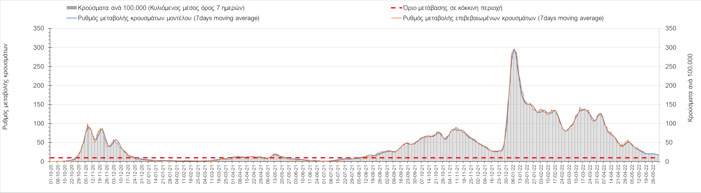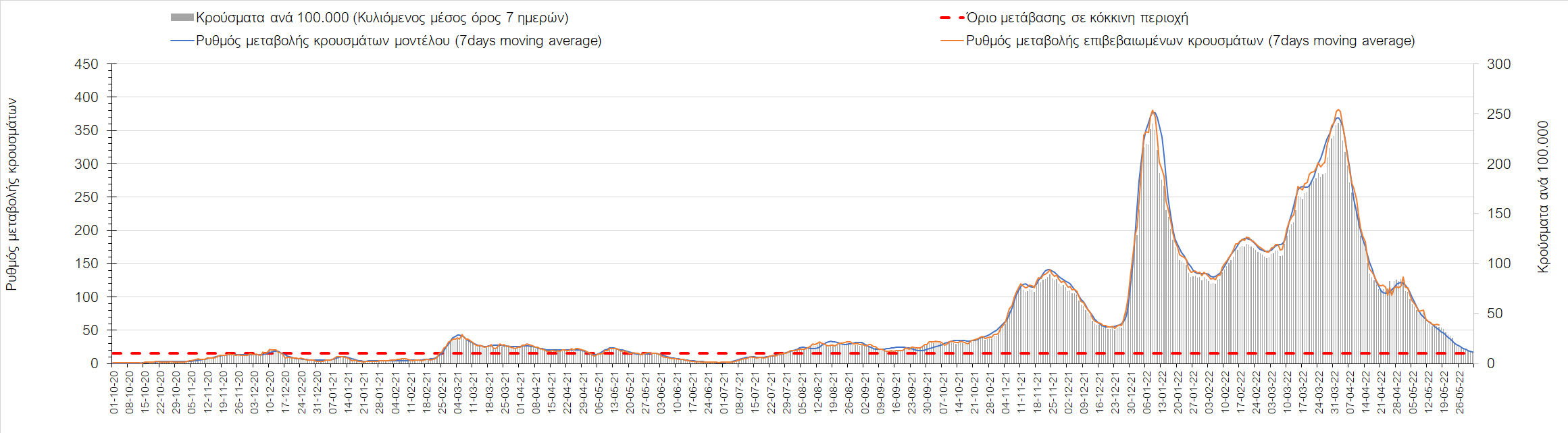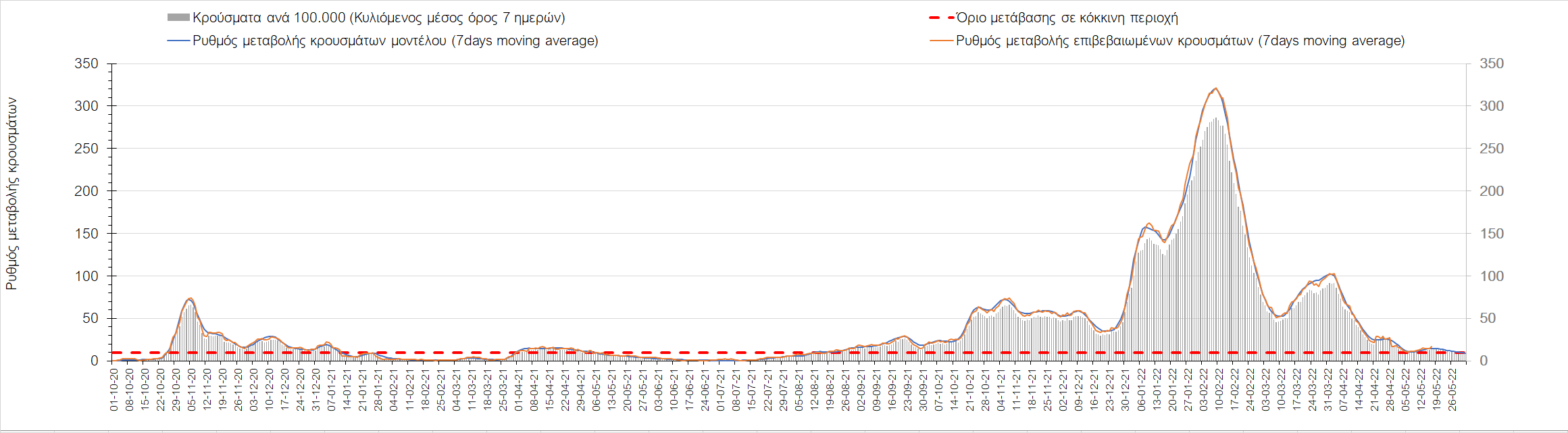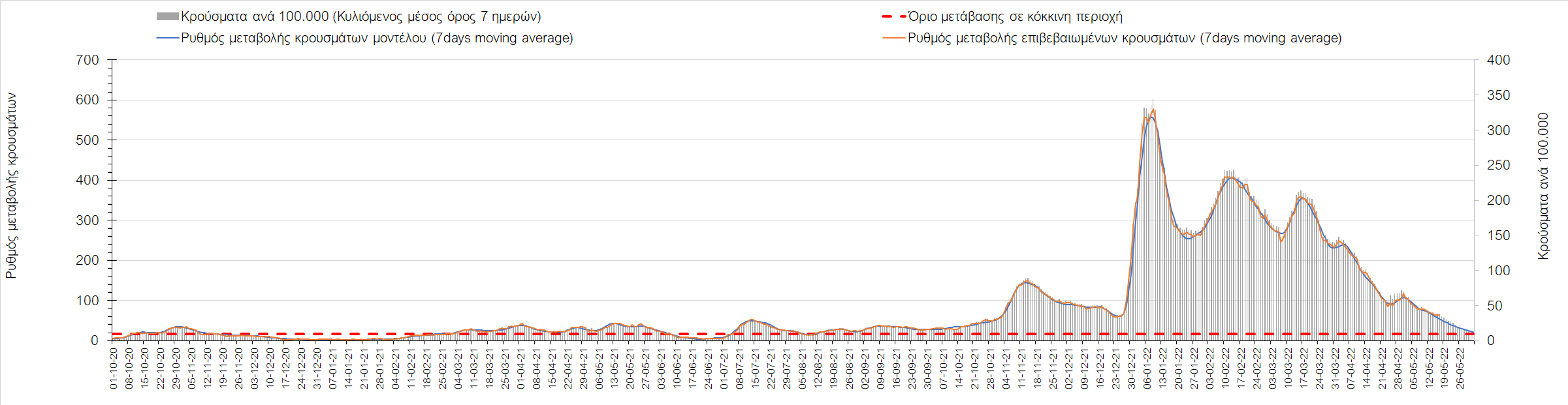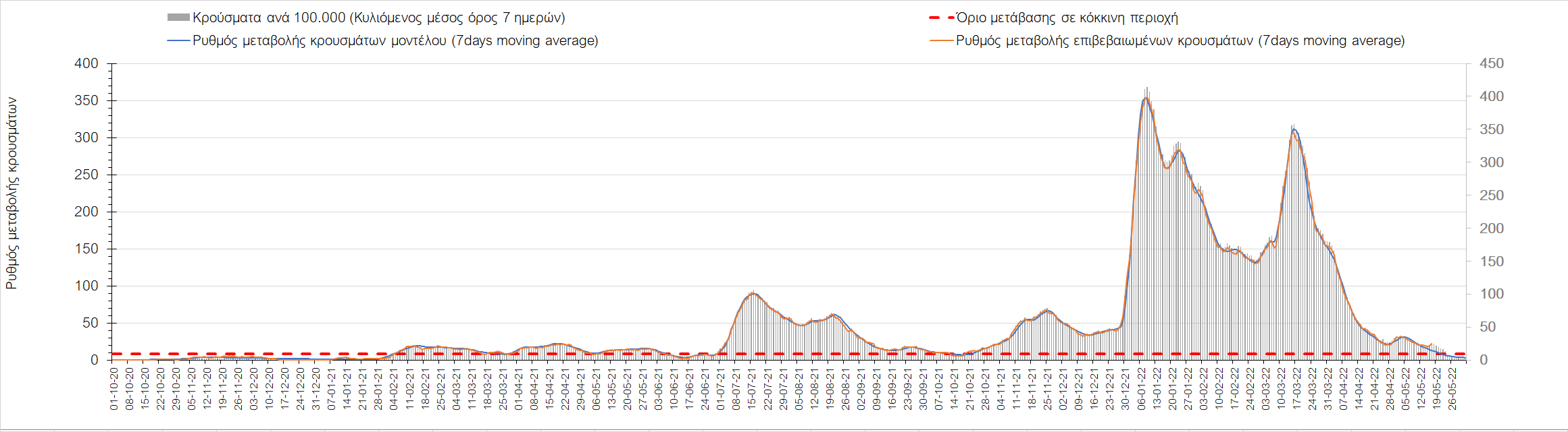 Συμπεράσματα: Με βάση τα σημερινά αποτελέσματα, σε σχέση με τη Δευτέρα, παρατηρήθηκε ίδιος αριθμός ασθενών σε κρίσιμη κατάσταση (διασωληνωμένοι σε ΜΕΘ) όπως επίσης και αριθμός θανάτων από COVID-19. Σε πανελλαδικό επίπεδο ο κυλιόμενος εβδομαδιαίος μέσος όρος του δείκτη θετικότητας διαμορφώθηκε στο 6,0% (η ημερήσια τιμή είναι 4,4%) ενώ ο κυλιόμενος εβδομαδιαίος μέσος όρος του πραγματικού αριθμού αναπαραγωγής Rt (δηλαδή ο αριθμός των ατόμων που ένας φορέας μπορεί να επιμολύνει) αυξήθηκε στο 0,94 (Rt κάτω από τη μονάδα υποδηλώνει καθαρή μείωση της διασποράς του ιού στην κοινότητα). Συνολικά, ο αριθμός των κρουσμάτων (όπως αποτυπώνεται στον κυλιόμενο μέσο όρο 7 ημερών) παραμένει υψηλός, και οφείλονταν αρχικά στις αυξημένες επαφές τις ημέρες του Πάσχα και του τριημέρου της Πρωτομαγιάς, έχοντας συντελέσει σε ανατροπή της πορείας αποκλιμάκωσης, ενώ η τωρινή προσωρινή αναστροφή, συντηρείται τόσο από την απώλεια ανοσίας λόγω της παρόδου μεγάλου χρονικού διαστήματος σε μεγάλο τμήμα του πληθυσμού τόσο από τον τελευταίο εμβολιασμό, όσο και από νόσηση, καθώς και από τη χαλάρωση των μέτρων σε συνδυασμό με την κατάργηση των self-test. Συνεπώς, ενώ πρακτικά η πτωτική πορεία έχει επανέλθει στις περισσότερες περιφερειακές ενότητες, υπάρχουν περιοχές στις οποίες παρατηρείται ξανά ανοδική πορεία, όπως η Μύκονος, η Σαντορίνη, αλλά εδώ και τρεις ημέρες και η Αττική. Σε αυτό το πλαίσιο δεν συνιστάται η άρση της υποχρεωτικής χρήσης μέτρων προσωπικής προστασίας όπως η μάσκα σε κλειστούς χώρους.