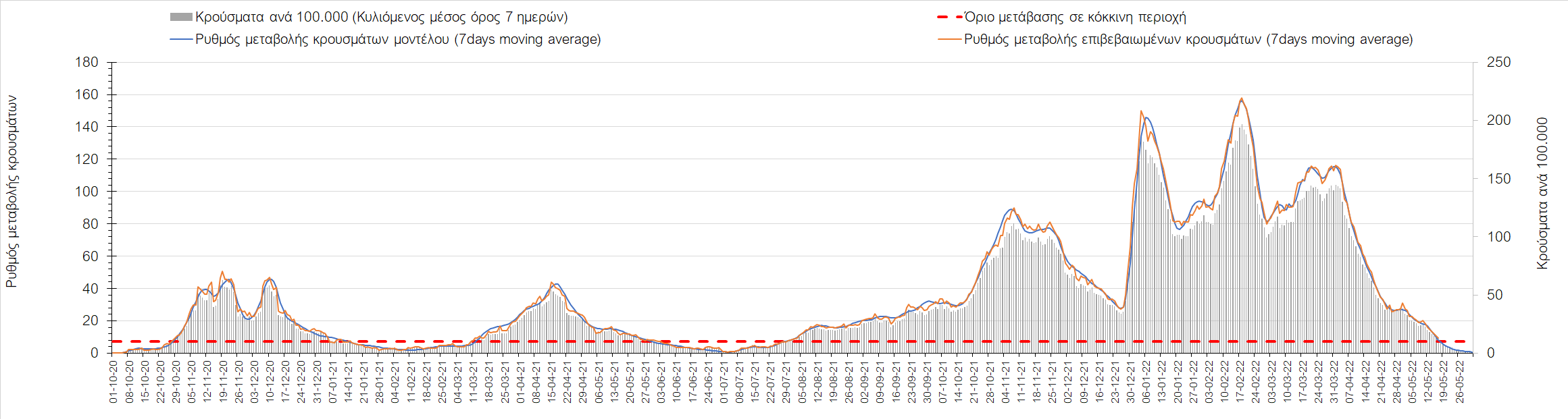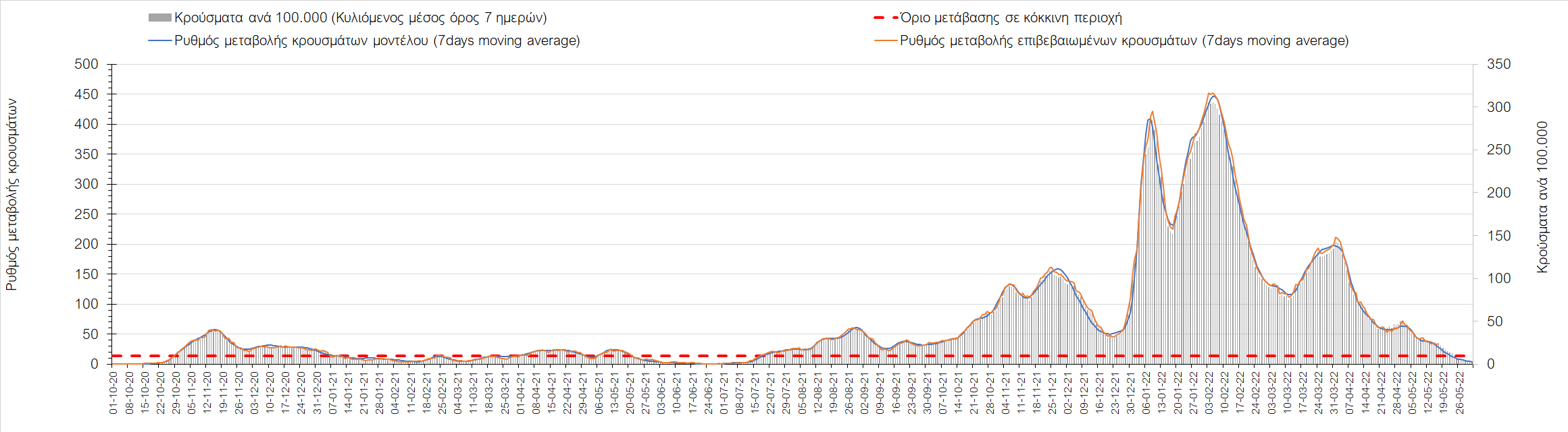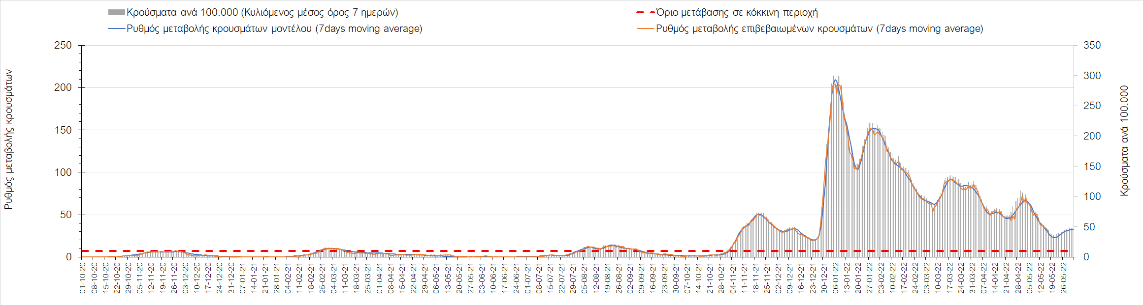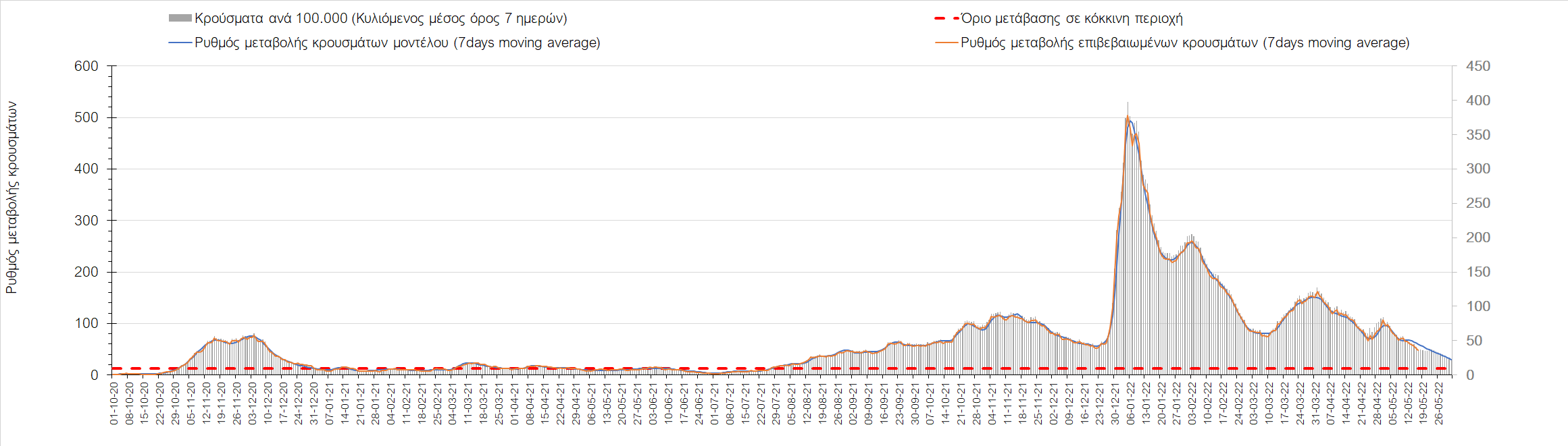 Η αποτύπωση των τάσεων στις επιμέρους περιοχές, παρουσιάζεται στο Σχήμα 61, όπου παρουσιάζεται ο ρυθμός μεταβολής των νέων κρουσμάτων ανά 100.000 κατοίκους (κυλιόμενος μέσος όρος 7 ημερών) των επιμέρους περιοχών. Θετικές τιμές του ρυθμού μεταβολής υποδηλώνουν άνοδο, ενώ αρνητικές τιμές υποδηλώνουν πτωτική πορεία.