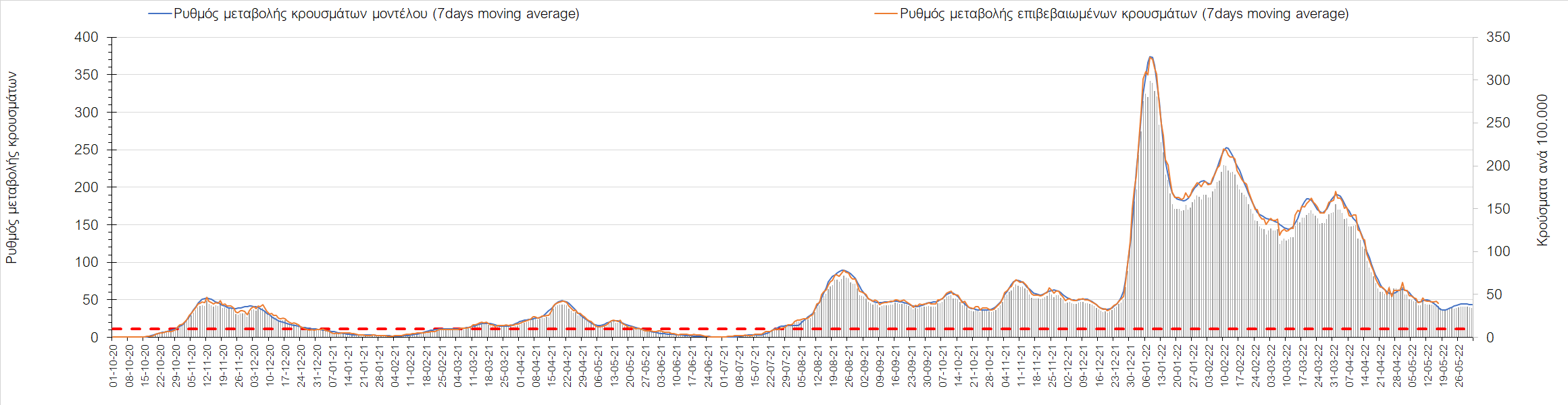 Ο αριθμός των κρουσμάτων που παρατηρείται, είναι σημαντικά υψηλότερος από αυτόν που αναμέναμε όταν ξεκίνησε η αποκλιμάκωση του 5ου κύματος και υποδηλώνει διαφυγή ανοσίας. O κυρίως λόγος που συμβαίνει αυτή η διαφυγή ανοσίας, είναι η καθυστέρηση της εφαρμογής της αναμνηστικής δόσης, με δεδομένη τη σημαντική διαφορά στην αποτελεσματικότητα προστασίας μεταξύ εμβολιασμένων με 2 δόσεις και με 3. Επίσης, σημαντική διαφυγή ανοσίας υπάρχει λόγω του αυξημένου ρυθμού επαναμολύνσεων ακόμα και σε σύντομο διάστημα από προηγούμενη μόλυνση, που αποτελεί χαρακτηριστικό του νέου υποστελέχους της Ο (Β.Α.2, ή παραλλαγή Ο-2), το οποίο εικάζεται ότι είναι ακόμη πιο μεταδοτικό από την παραλλαγή Ο κατά 33% μεσοσταθμικά. Συνεπώς, ο συνδυασμός επιβράδυνσης της 3ης δόσης και της παρουσίας του νέου στελέχους, οδήγησαν σε ένα νέο κύμα που έχει ήδη καθυστερήσει επιπλέον την ταχύτερη αποκλιμάκωση. Πλέον, ενώ συνολικά παρατηρείται πτωτική πορεία, έχοντας ξεπεράσει την ανοδική διακύμανση που παρατηρήθηκε πριν 2 εβδομάδες λόγω των αυξημένων επαφών του Πάσχα και του τριημέρου της Πρωτομαγιάς, τις τελευταίες ημέρες παρατηρείται σημαντική επιβράδυνση της πορείας αποκλιμάκωσης, με επιμέρους ανοδικές διακυμάνσεις, που διαμορφώνονται κυρίως από την ήπια ανοδική τάση στην Αττική.