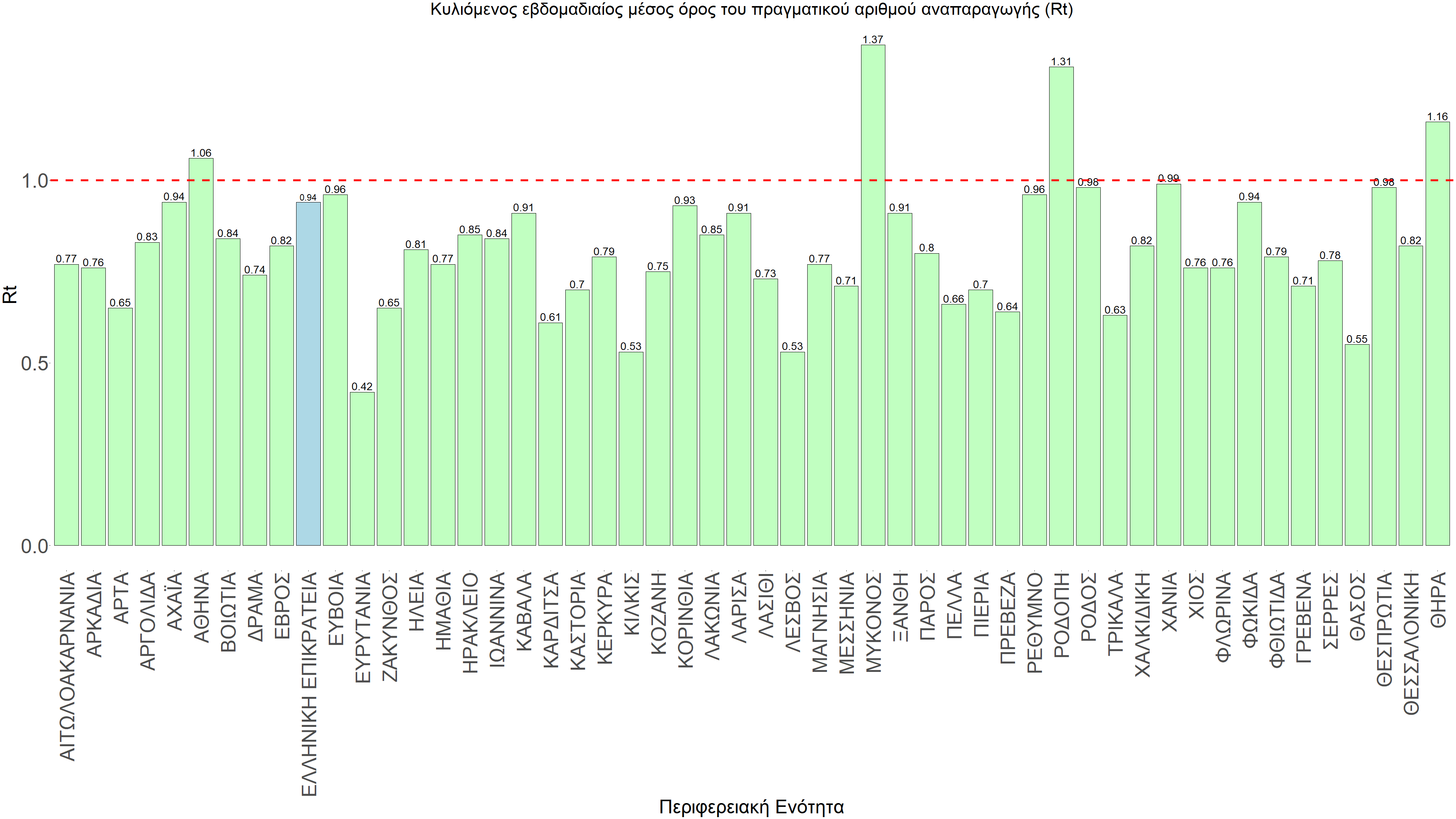 O πραγματικός αριθμός αναπαραγωγής Rt ανά περιφερειακή ενότητα της χώρας παρουσιάζεται στο Σχήμα 58.