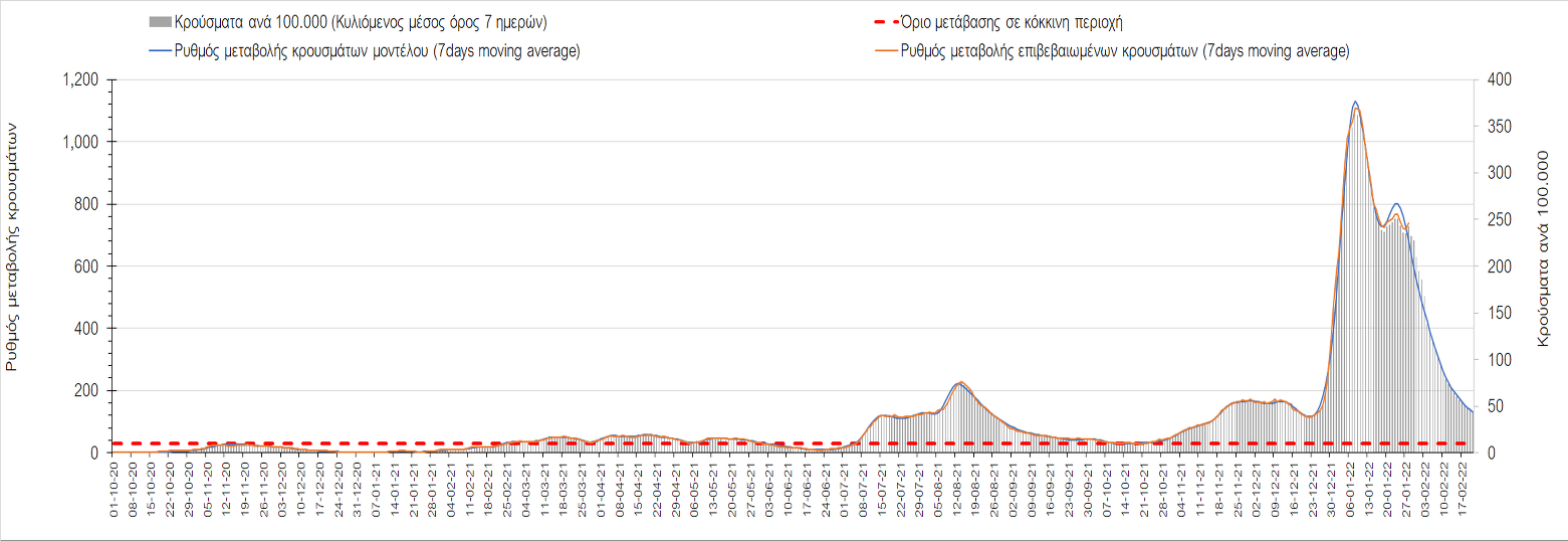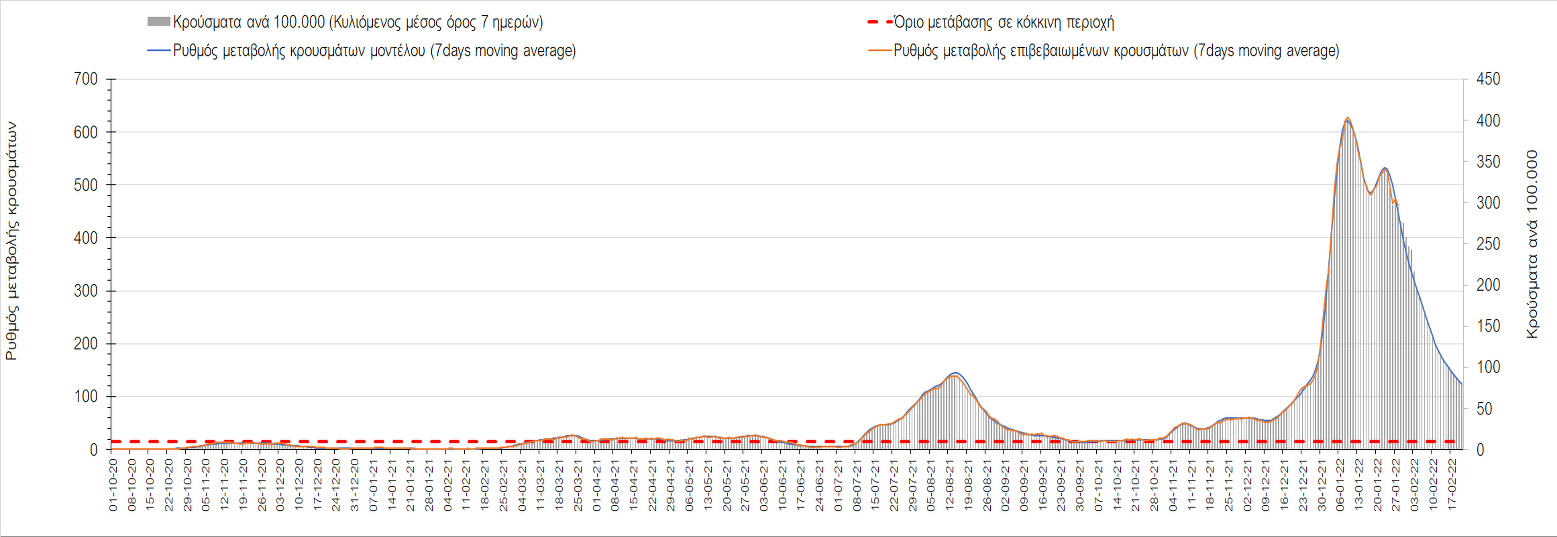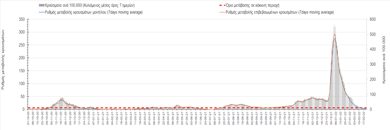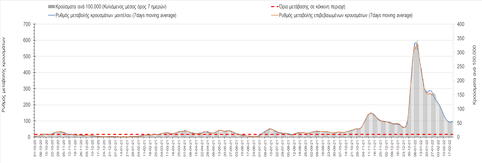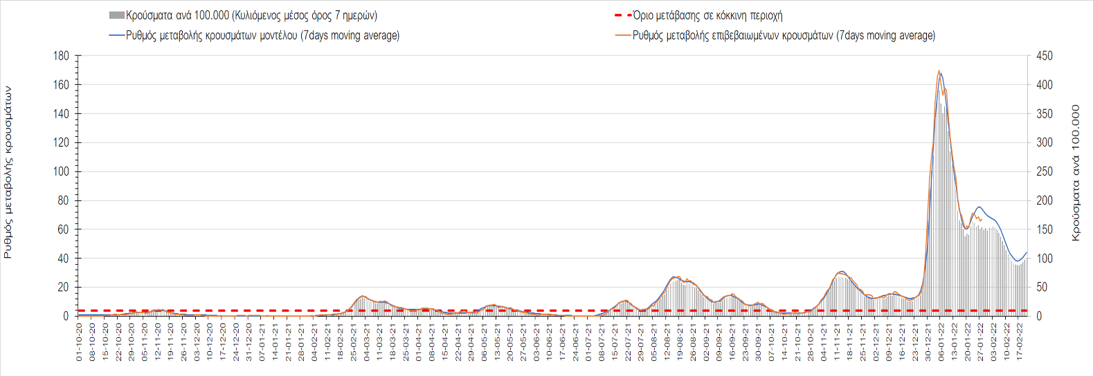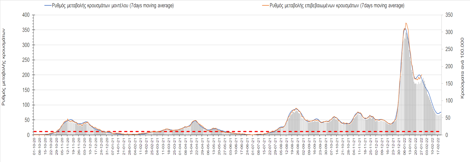Η ανοδική τάση που είχε διαμορφωθεί από τις 23/12 και που οφείλεται στην μετάλλαξη Ο, είχε περιέλθει σε πτωτική, αλλά πλέον βρίσκεται σε σημαντική επιβράδυνση έως και ήπια αναστροφή, και αντικατοπτρίζεται στον ημερήσιο αριθμό των κρουσμάτων (κυλιόμενος μέσος όρος 7 ημερών), ο οποίος παραμένει πάνω από τις 18.000 (18.137), και εδώ και μέρες δεν εμφανίζει ουσιαστική πτώση, ενώ η πτώση των προηγουμένων ημερών ήταν αποτέλεσμα της ελλιπούς καταγραφής λόγω της κακοκαιρίας που έπληξε την Αττική και άλλες περιοχές της Στερεάς Ελλάδας. Για να επανέλθει η ταχεία αποκλιμάκωση της πανδημίας, πέρα από την εφαρμογή των μέτρων (σε συνδυασμό με την σημαντική συνειδητοποίηση εκ μέρους του πληθυσμού ότι χρειάζεται προσοχή και σύνεση για την αντιμετώπιση της διασποράς της παραλλαγής Ο), θα πρέπει να στοχεύσουμε στη διατήρηση και την επέκταση της επίκτητης ανοσίας του πληθυσμού, αλλά και στον πολύ μεγάλο αριθμό των τεστ συνολικά (μοριακά, rapid και self-test) που πραγματοποιούνται καθημερινά, των οποίων ο αριθμός έχει φθάσει σε ημερήσια βάση τις 700.000. Αυτά σε συνδυασμό με τη φυσική ανοσία του πληθυσμού μετά από νόσηση, θα συντελέσουν στην συστηματική αποκλιμάκωση της πανδημίας. Αντίθετα, με τον υπάρχοντα ρυθμό εμβολιασμού αναμνηστικών δόσεων, θα υπάρχουν συνεχείς διακυμάνσεις της πορείας αποκλιμάκωσης όλο το Φεβρουάριο.