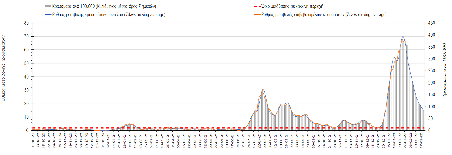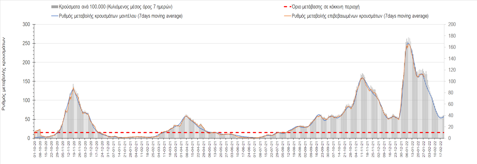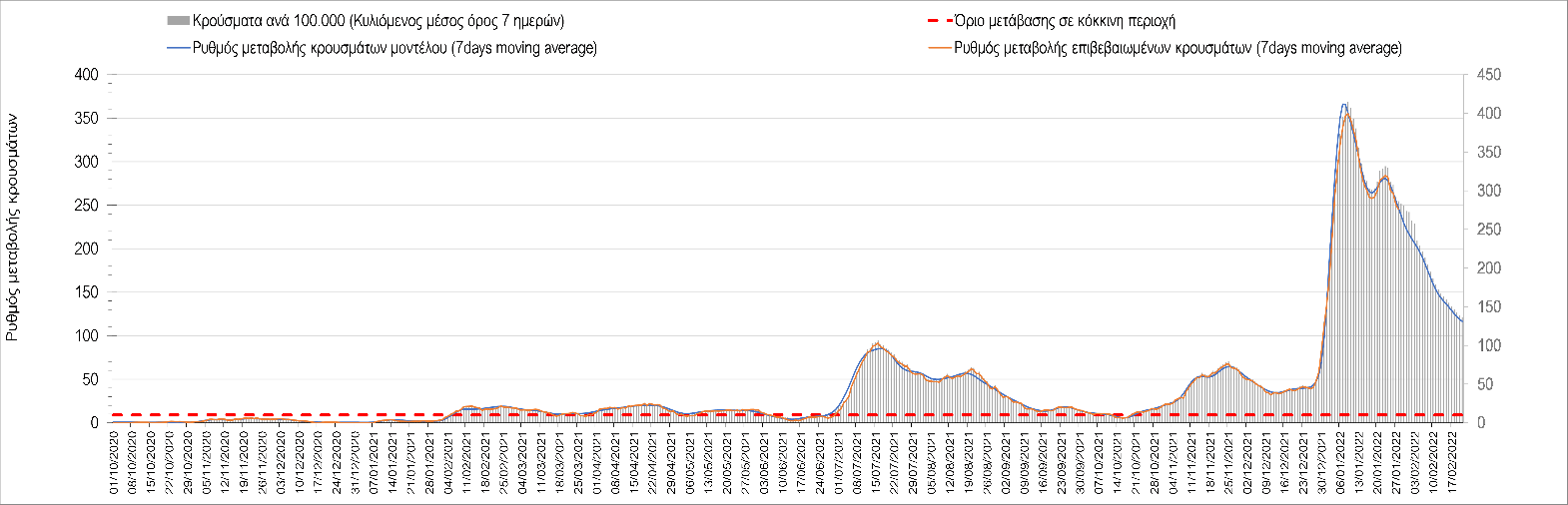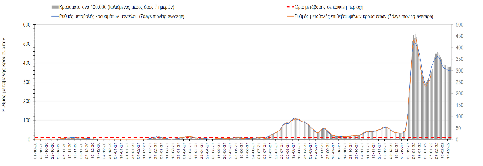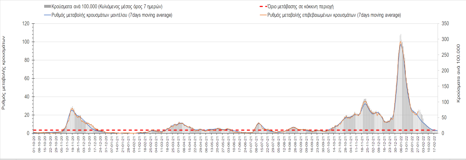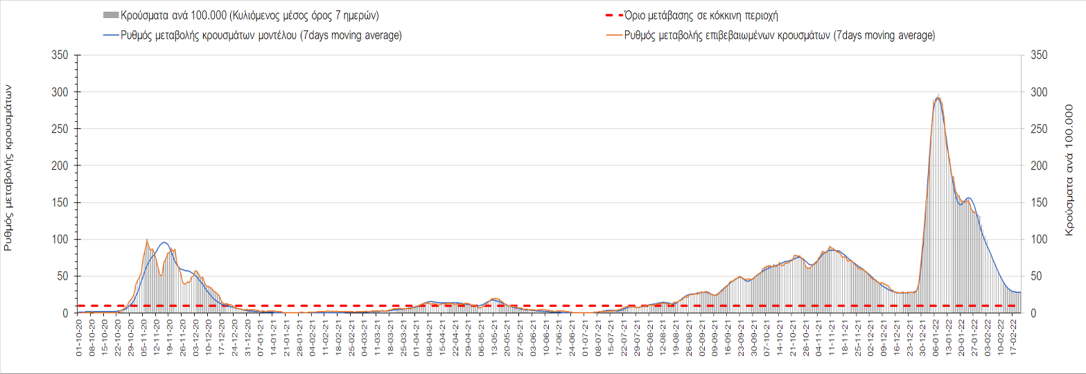 Η ανοδική τάση που είχε διαμορφωθεί από τις 23/12 και που οφείλεται στην μετάλλαξη Ο, είχε περιέλθει σε πτωτική, αλλά πλέον βρίσκεται σε σημαντική επιβράδυνση έως και ήπια αναστροφή, και αντικατοπτρίζεται στον ημερήσιο αριθμό των κρουσμάτων (κυλιόμενος μέσος όρος 7 ημερών), ο οποίος παραμένει πάνω από τις 18.000 (18.137), και εδώ και μέρες δεν εμφανίζει ουσιαστική πτώση, ενώ η πτώση των προηγουμένων ημερών ήταν αποτέλεσμα της ελλιπούς καταγραφής λόγω της κακοκαιρίας που έπληξε την Αττική και άλλες περιοχές της Στερεάς Ελλάδας. Για να επανέλθει η ταχεία αποκλιμάκωση της πανδημίας, πέρα από την εφαρμογή των μέτρων (σε συνδυασμό με την σημαντική συνειδητοποίηση εκ μέρους του πληθυσμού ότι χρειάζεται προσοχή και σύνεση για την αντιμετώπιση της διασποράς της παραλλαγής Ο), θα πρέπει να στοχεύσουμε στη διατήρηση και την επέκταση της επίκτητης ανοσίας του πληθυσμού, αλλά και στον πολύ μεγάλο αριθμό των τεστ συνολικά (μοριακά, rapid και self-test) που πραγματοποιούνται καθημερινά, των οποίων ο αριθμός έχει φθάσει σε ημερήσια βάση τις 700.000. Αυτά σε συνδυασμό με τη φυσική ανοσία του πληθυσμού μετά από νόσηση, θα συντελέσουν στην συστηματική αποκλιμάκωση της πανδημίας. Αντίθετα, με τον υπάρχοντα ρυθμό εμβολιασμού αναμνηστικών δόσεων, θα υπάρχουν συνεχείς διακυμάνσεις της πορείας αποκλιμάκωσης όλο το Φεβρουάριο.