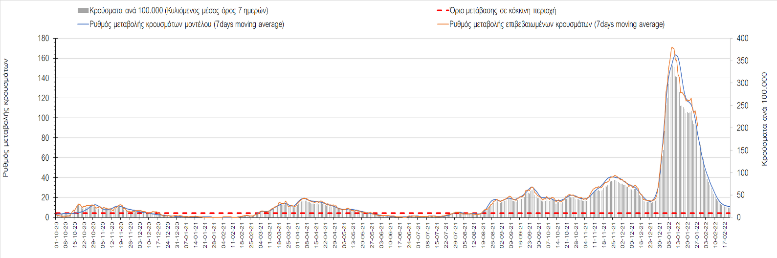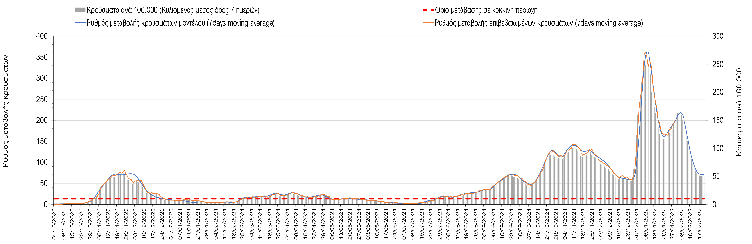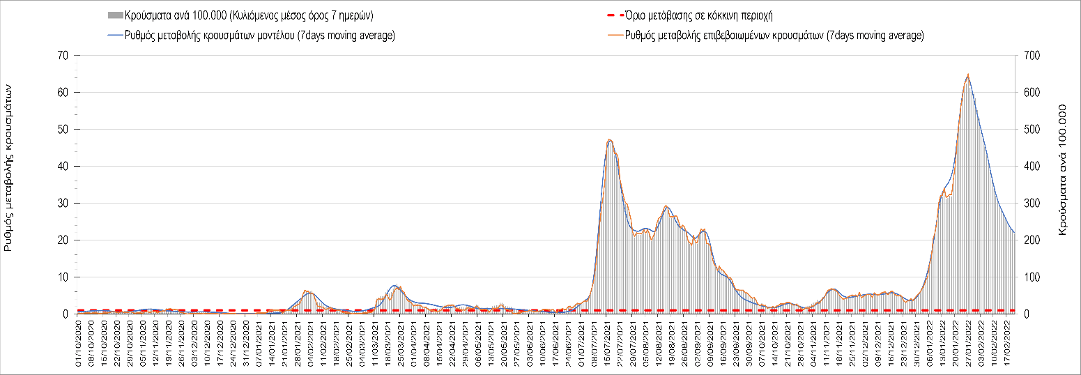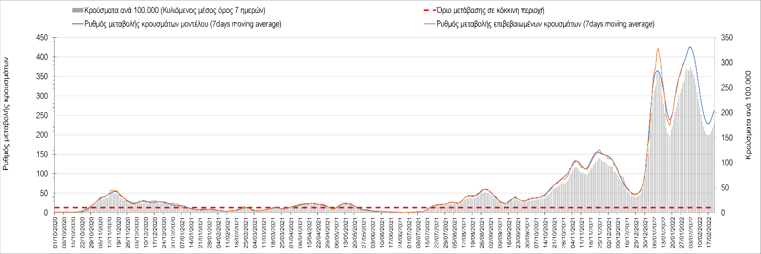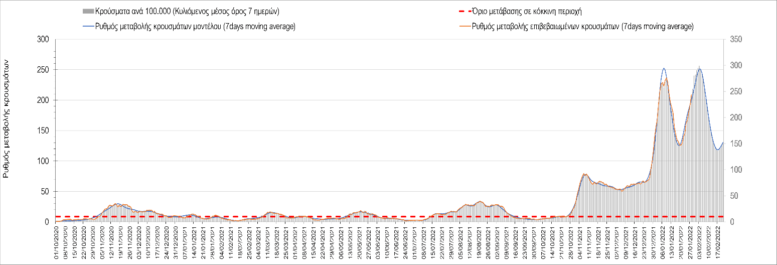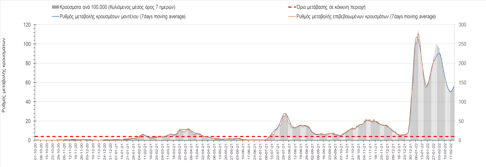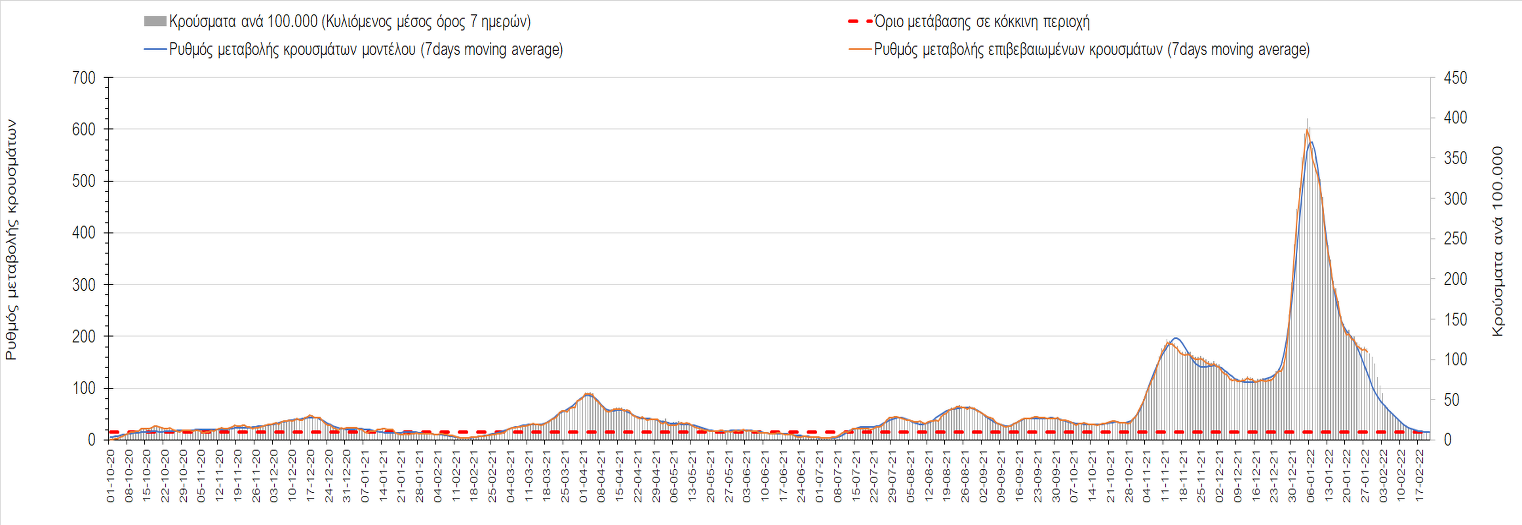 Η ανοδική τάση που είχε διαμορφωθεί από τις 23/12 και που οφείλεται στην μετάλλαξη Ο, είχε περιέλθει σε πτωτική, αλλά πλέον βρίσκεται σε σημαντική επιβράδυνση έως και ήπια αναστροφή, και αντικατοπτρίζεται στον ημερήσιο αριθμό των κρουσμάτων (κυλιόμενος μέσος όρος 7 ημερών), ο οποίος παραμένει πάνω από τις 18.000 (18.137), και εδώ και μέρες δεν εμφανίζει ουσιαστική πτώση, ενώ η πτώση των προηγουμένων ημερών ήταν αποτέλεσμα της ελλιπούς καταγραφής λόγω της κακοκαιρίας που έπληξε την Αττική και άλλες περιοχές της Στερεάς Ελλάδας. Για να επανέλθει η ταχεία αποκλιμάκωση της πανδημίας, πέρα από την εφαρμογή των μέτρων (σε συνδυασμό με την σημαντική συνειδητοποίηση εκ μέρους του πληθυσμού ότι χρειάζεται προσοχή και σύνεση για την αντιμετώπιση της διασποράς της παραλλαγής Ο), θα πρέπει να στοχεύσουμε στη διατήρηση και την επέκταση της επίκτητης ανοσίας του πληθυσμού, αλλά και στον πολύ μεγάλο αριθμό των τεστ συνολικά (μοριακά, rapid και self-test) που πραγματοποιούνται καθημερινά, των οποίων ο αριθμός έχει φθάσει σε ημερήσια βάση τις 700.000. Αυτά σε συνδυασμό με τη φυσική ανοσία του πληθυσμού μετά από νόσηση, θα συντελέσουν στην συστηματική αποκλιμάκωση της πανδημίας. Αντίθετα, με τον υπάρχοντα ρυθμό εμβολιασμού αναμνηστικών δόσεων, θα υπάρχουν συνεχείς διακυμάνσεις της πορείας αποκλιμάκωσης όλο το Φεβρουάριο.