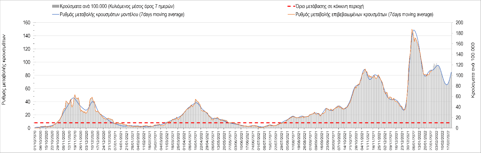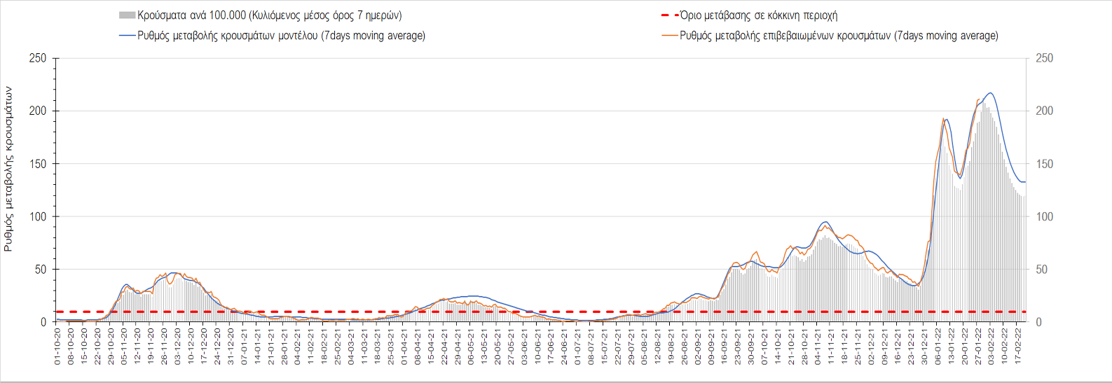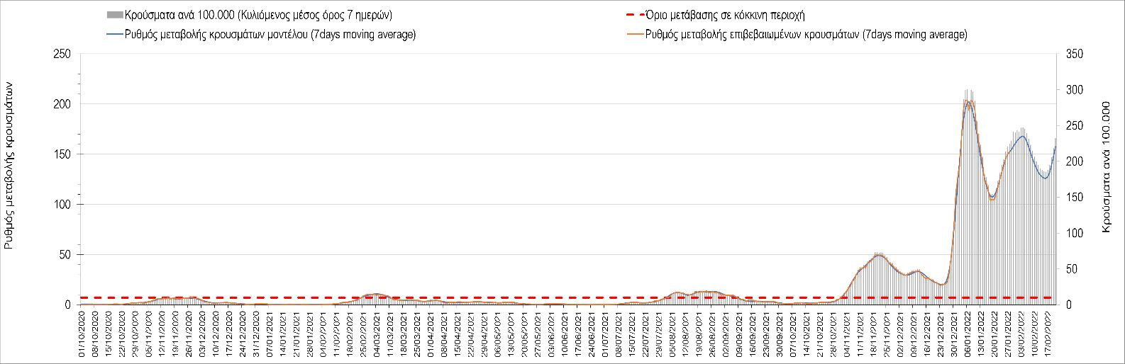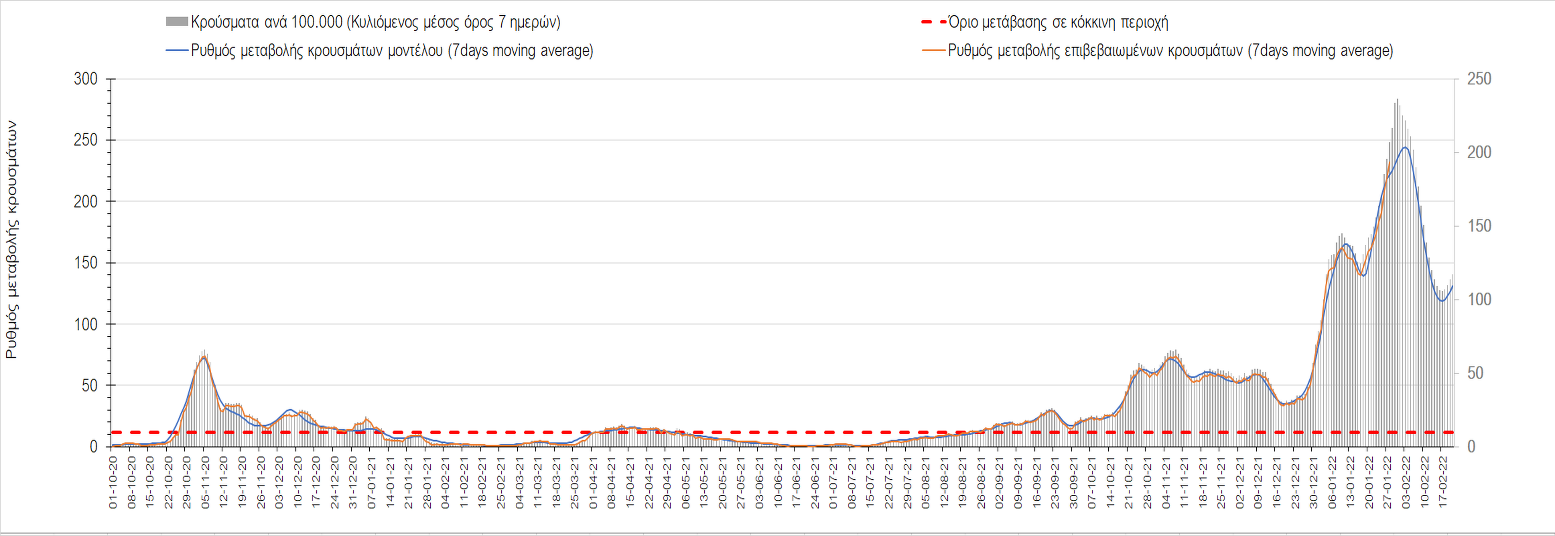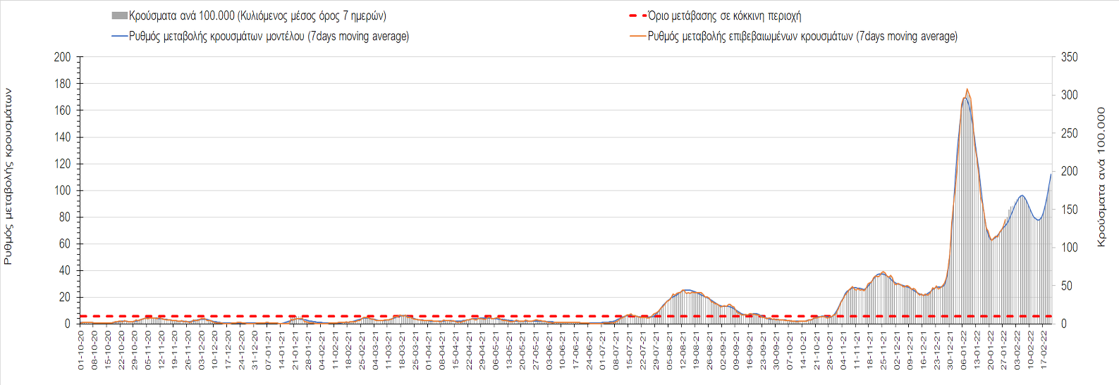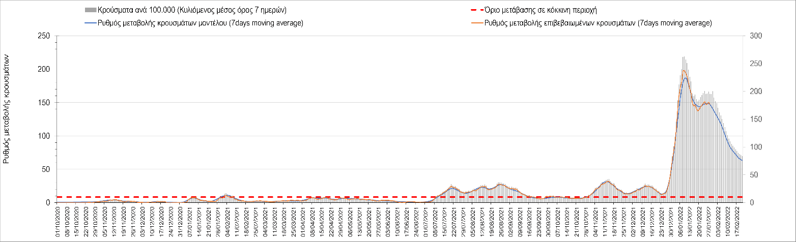Η ανοδική τάση που είχε διαμορφωθεί από τις 23/12 και που οφείλεται στην μετάλλαξη Ο, είχε περιέλθει σε πτωτική, αλλά πλέον βρίσκεται σε σημαντική επιβράδυνση έως και ήπια αναστροφή, και αντικατοπτρίζεται στον ημερήσιο αριθμό των κρουσμάτων (κυλιόμενος μέσος όρος 7 ημερών), ο οποίος παραμένει πάνω από τις 18.000 (18.137), και εδώ και μέρες δεν εμφανίζει ουσιαστική πτώση, ενώ η πτώση των προηγουμένων ημερών ήταν αποτέλεσμα της ελλιπούς καταγραφής λόγω της κακοκαιρίας που έπληξε την Αττική και άλλες περιοχές της Στερεάς Ελλάδας. Για να επανέλθει η ταχεία αποκλιμάκωση της πανδημίας, πέρα από την εφαρμογή των μέτρων (σε συνδυασμό με την σημαντική συνειδητοποίηση εκ μέρους του πληθυσμού ότι χρειάζεται προσοχή και σύνεση για την αντιμετώπιση της διασποράς της παραλλαγής Ο), θα πρέπει να στοχεύσουμε στη διατήρηση και την επέκταση της επίκτητης ανοσίας του πληθυσμού, αλλά και στον πολύ μεγάλο αριθμό των τεστ συνολικά (μοριακά, rapid και self-test) που πραγματοποιούνται καθημερινά, των οποίων ο αριθμός έχει φθάσει σε ημερήσια βάση τις 700.000. Αυτά σε συνδυασμό με τη φυσική ανοσία του πληθυσμού μετά από νόσηση, θα συντελέσουν στην συστηματική αποκλιμάκωση της πανδημίας. Αντίθετα, με τον υπάρχοντα ρυθμό εμβολιασμού αναμνηστικών δόσεων, θα υπάρχουν συνεχείς διακυμάνσεις της πορείας αποκλιμάκωσης όλο το Φεβρουάριο.