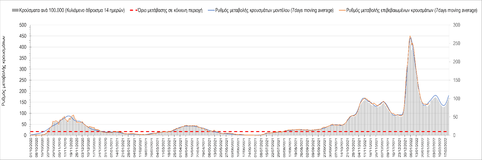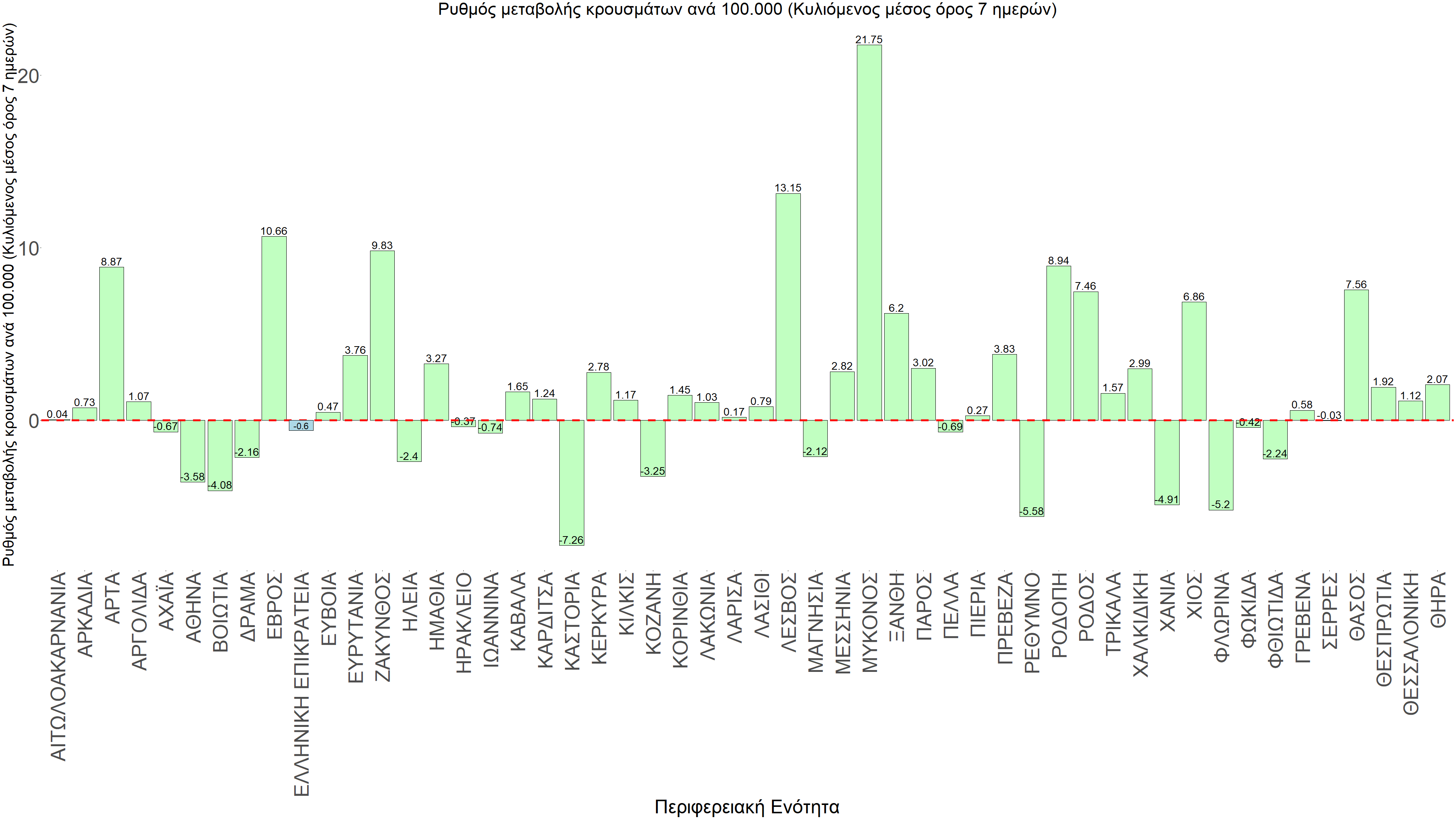 Η αποτύπωση των τάσεων στις επιμέρους περιοχές, παρουσιάζεται στο Σχήμα 61, όπου παρουσιάζεται ο ρυθμός μεταβολής των νέων κρουσμάτων ανά 100.000 κατοίκους (κυλιόμενος μέσος όρος 7 ημερών) των επιμέρους περιοχών. Θετικές τιμές του ρυθμού μεταβολής υποδηλώνουν άνοδο, ενώ αρνητικές τιμές υποδηλώνουν πτωτική πορεία.