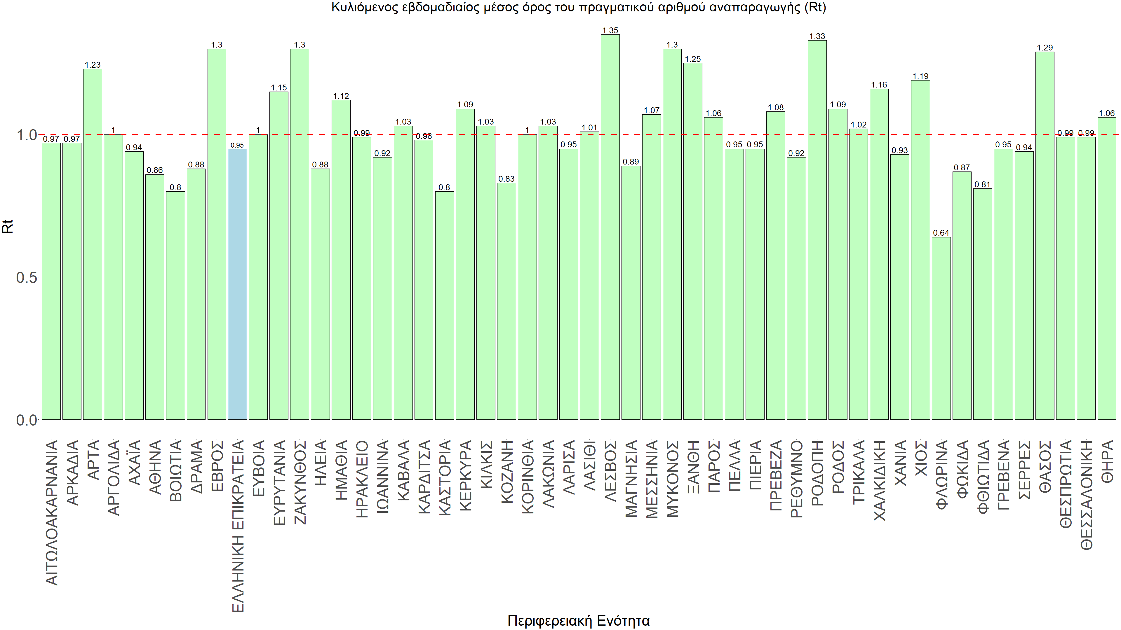 O πραγματικός αριθμός αναπαραγωγής Rt ανά περιφερειακή ενότητα της χώρας παρουσιάζεται στο Σχήμα 58.