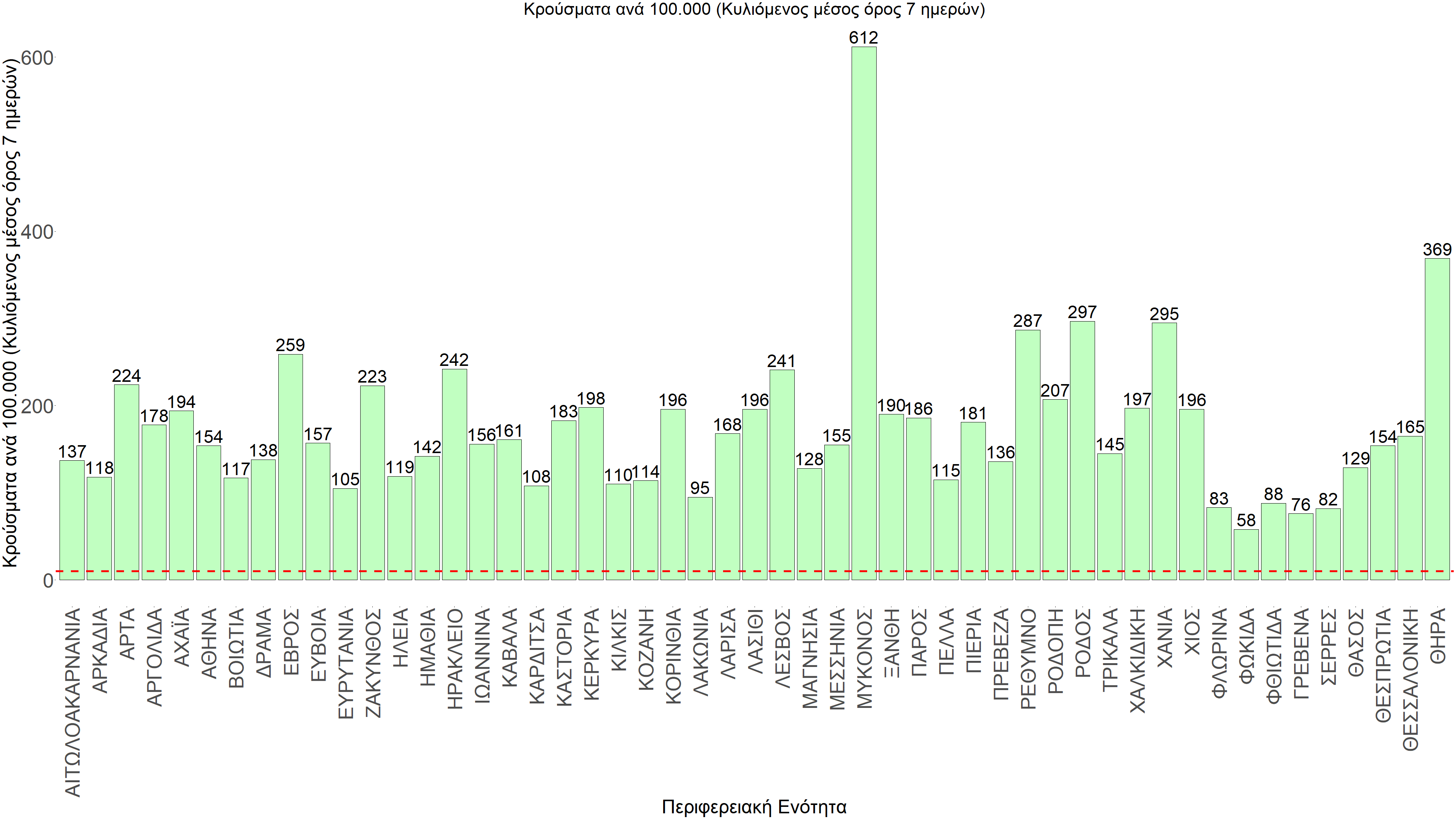 Σχήμα 60. Συγκεντρωτική εικόνα των νέων κρουσμάτων ανά 100.000 κατοίκους (κυλιόμενος μέσος όρος 7 ημερών) των επιμέρους περιοχών