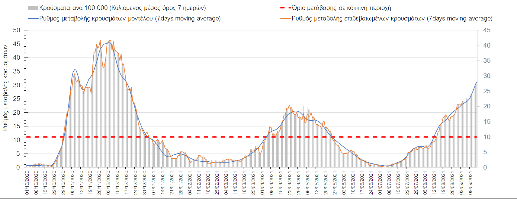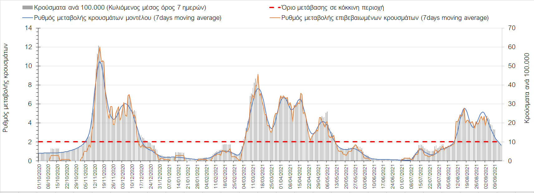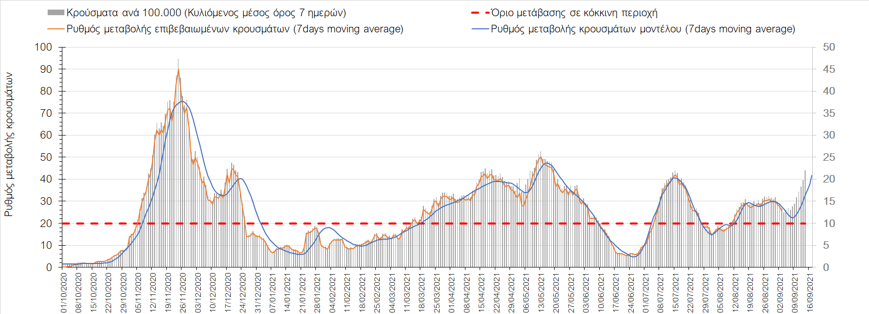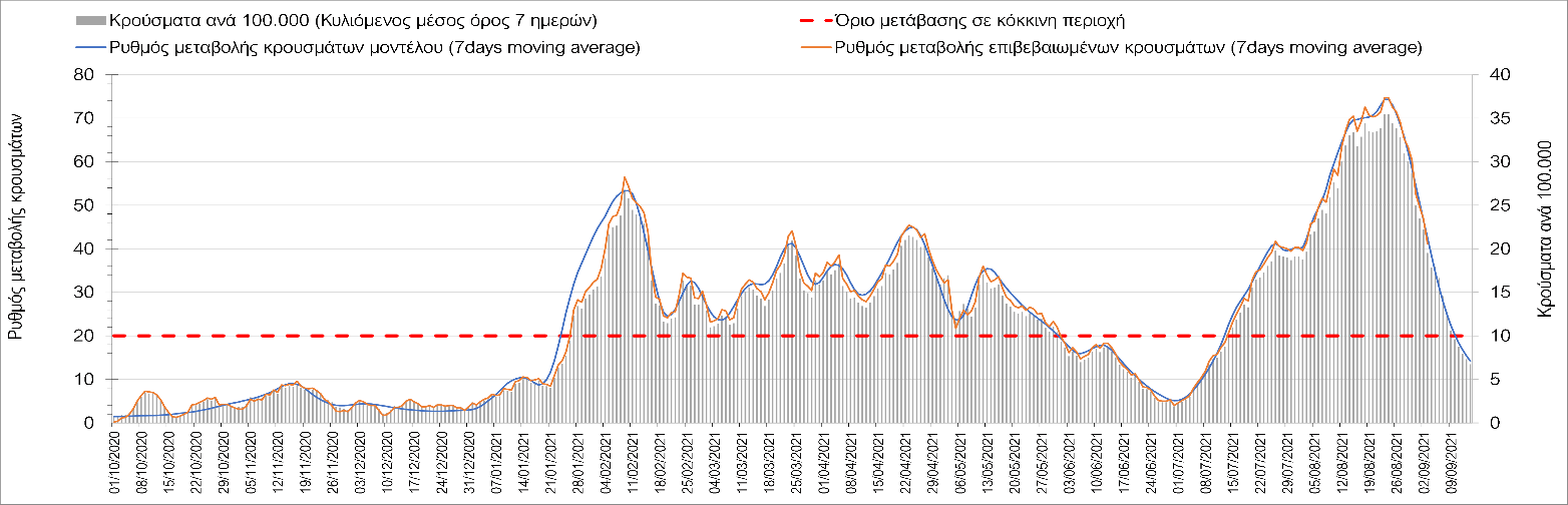 Στη Μαγνησία με 17 κρούσματα (Σχήμα 10) παρατηρείται μειωμένος αριθμός κρουσμάτων σε σχέση με προχθές και παρά την καθοδική πλέον τροχιά, συνεχίζει να παραμένει πάνω από το όριο χαρακτηρισμού ως περιοχή ανησυχίας.