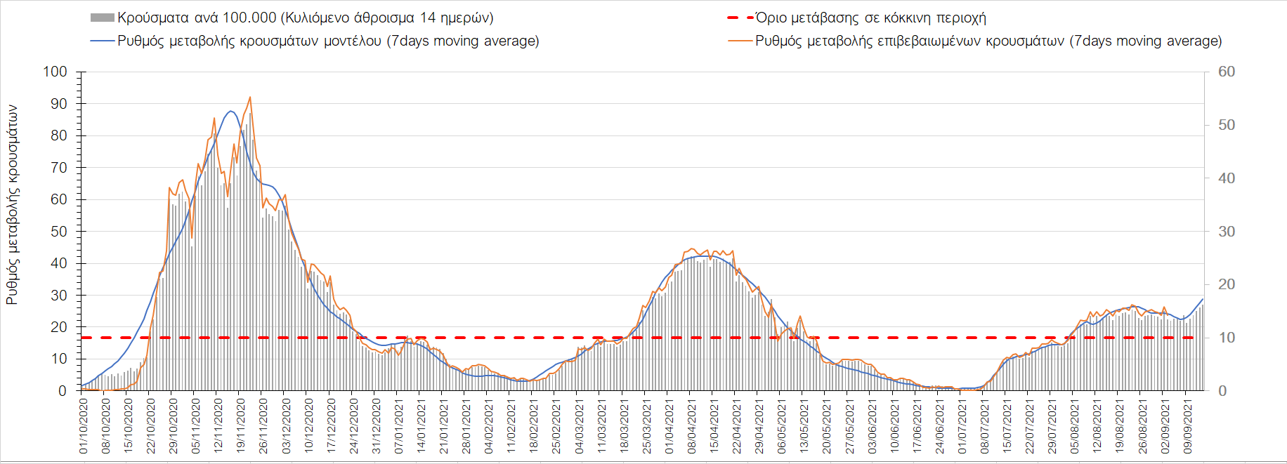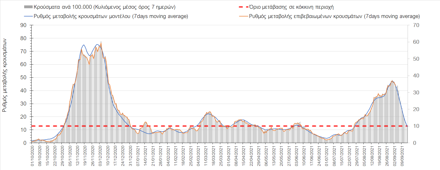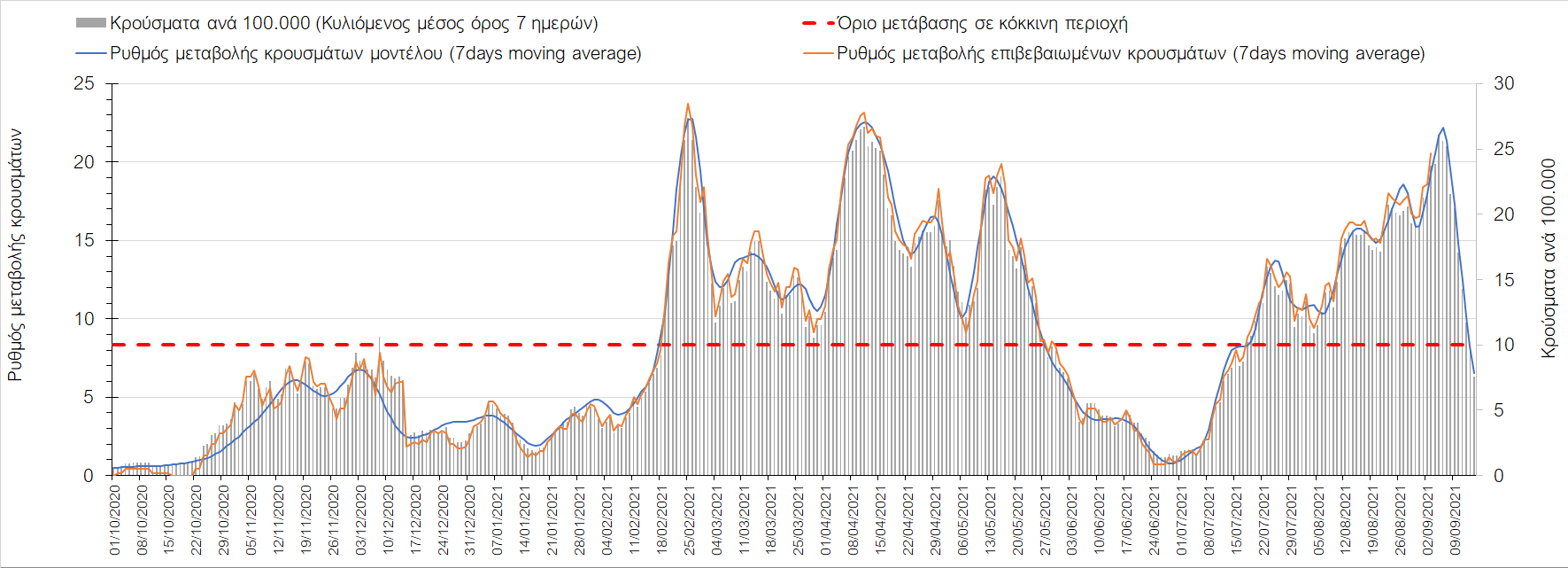 Στη Μαγνησία με 17 κρούσματα (Σχήμα 10) παρατηρείται μειωμένος αριθμός κρουσμάτων σε σχέση με προχθές και παρά την καθοδική πλέον τροχιά, συνεχίζει να παραμένει πάνω από το όριο χαρακτηρισμού ως περιοχή ανησυχίας.