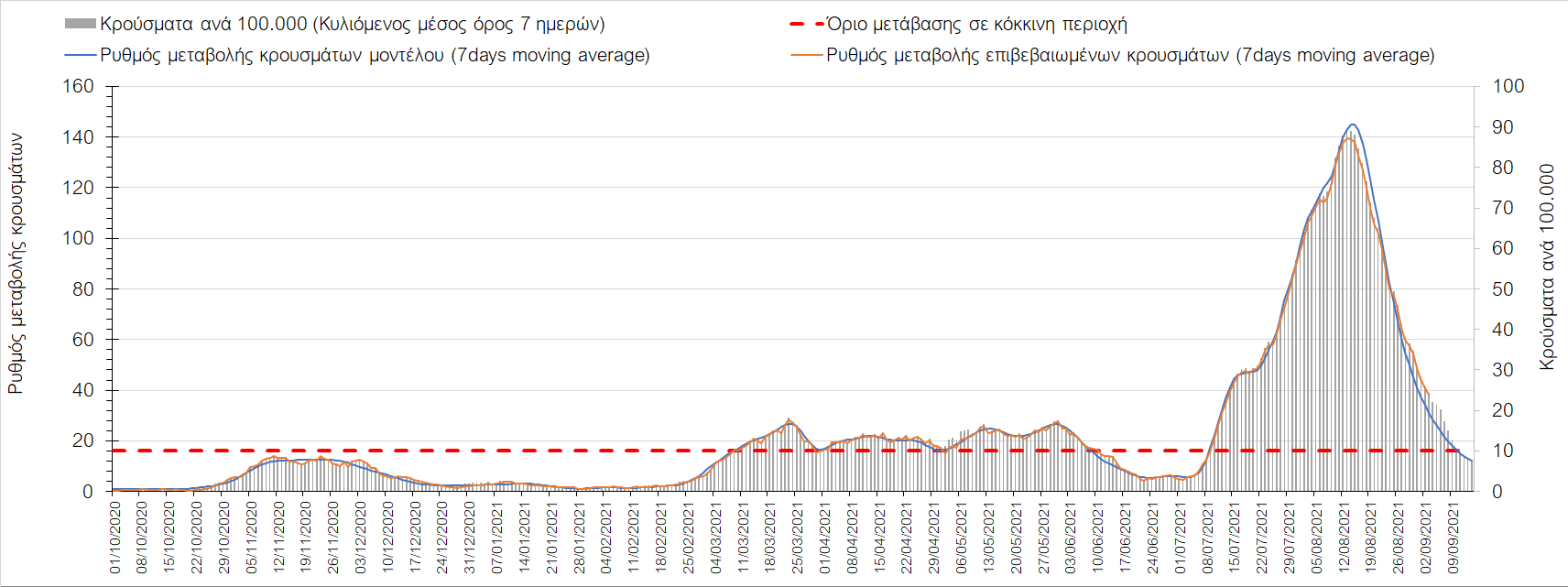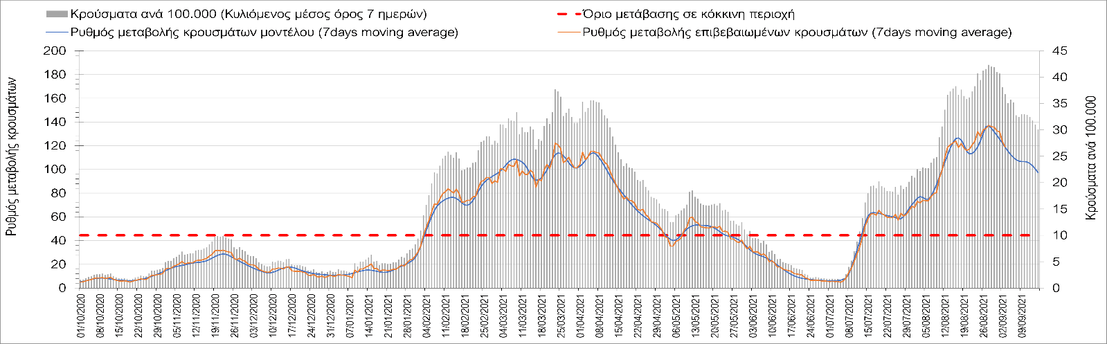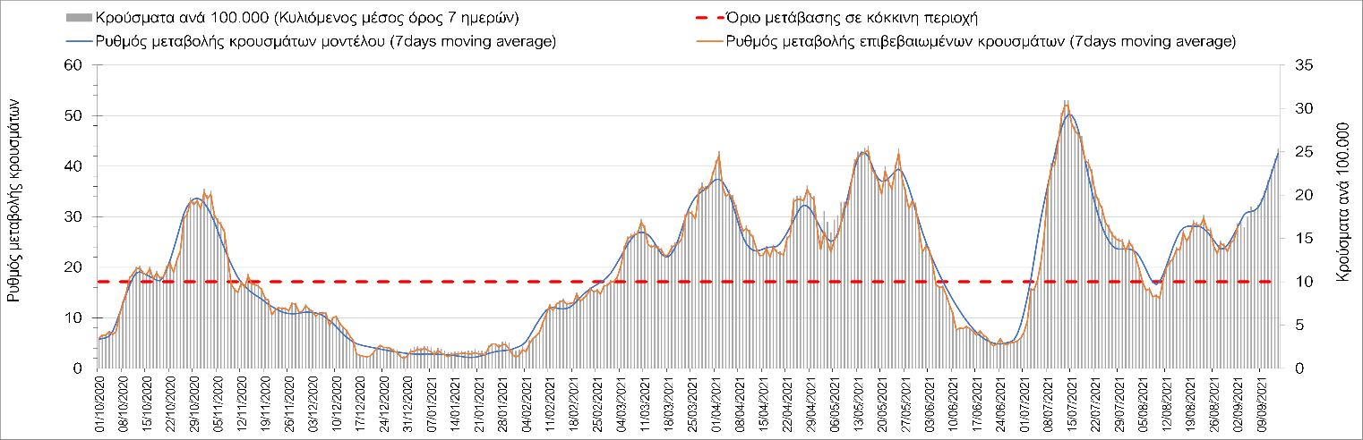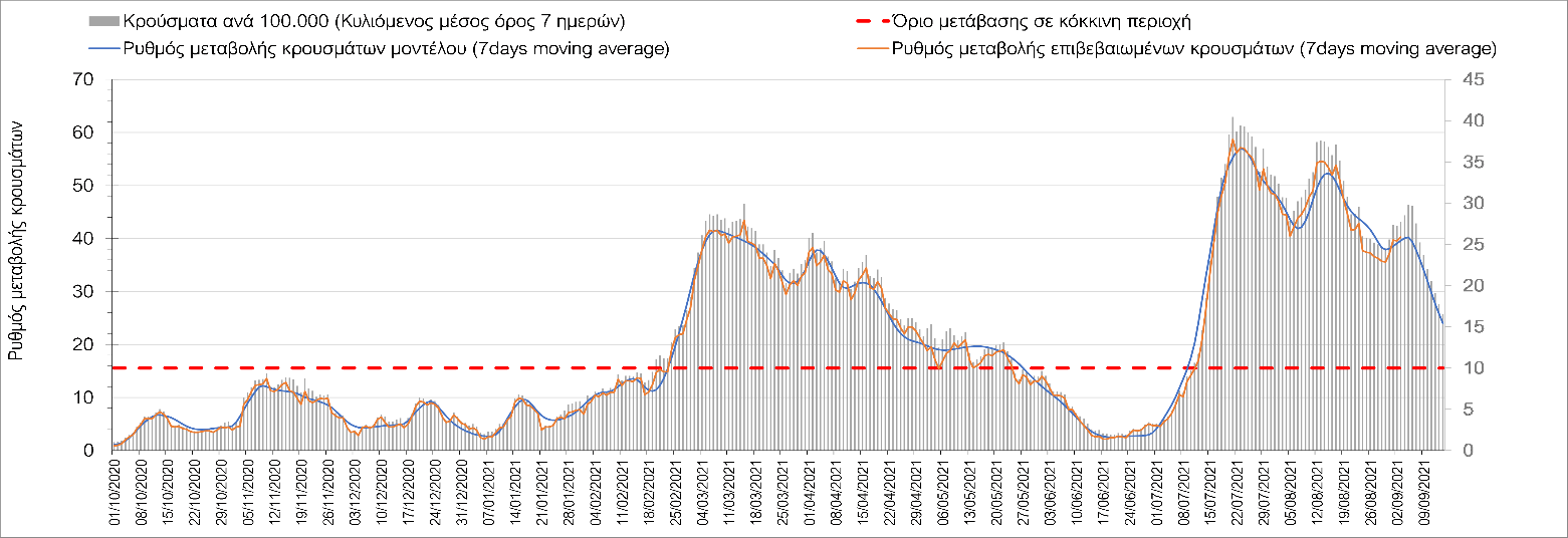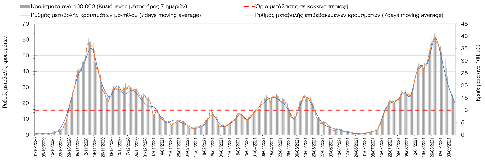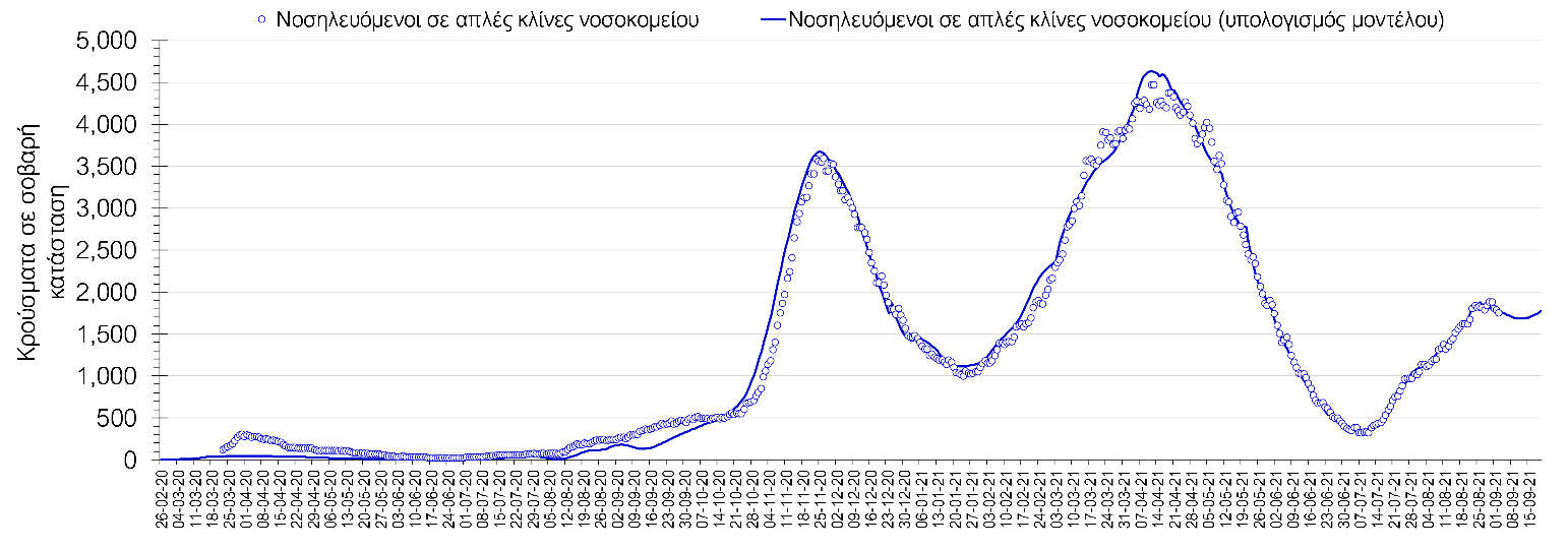 Η πορεία της μέσης εβδομαδιαίας τιμής των κρουσμάτων, καθώς και του κυλιόμενου μέσου όρου 7 ημερών του αριθμού των κρουσμάτων ανά 100.000 πληθυσμού, όπως έχουν καταγραφεί από τον ΕΟΔΥ και η αναμενόμενη πορεία τους όπως προδιαγράφεται από την υπολογιστική πλατφόρμα CORE για την Ελληνική επικράτεια μέχρι τις 15 Σεπτεμβρίου, αποτυπώνονται στο Σχήμα 4. Αυτή η προβλεπόμενη πορεία, που αφορά τα κρούσματα, τους νοσηλευόμενους σε απλές κλίνες, όσο και σε ΜΕΘ, καθώς επίσης και τους θανάτους, βασίζεται στις ακόλουθες παραδοχές: