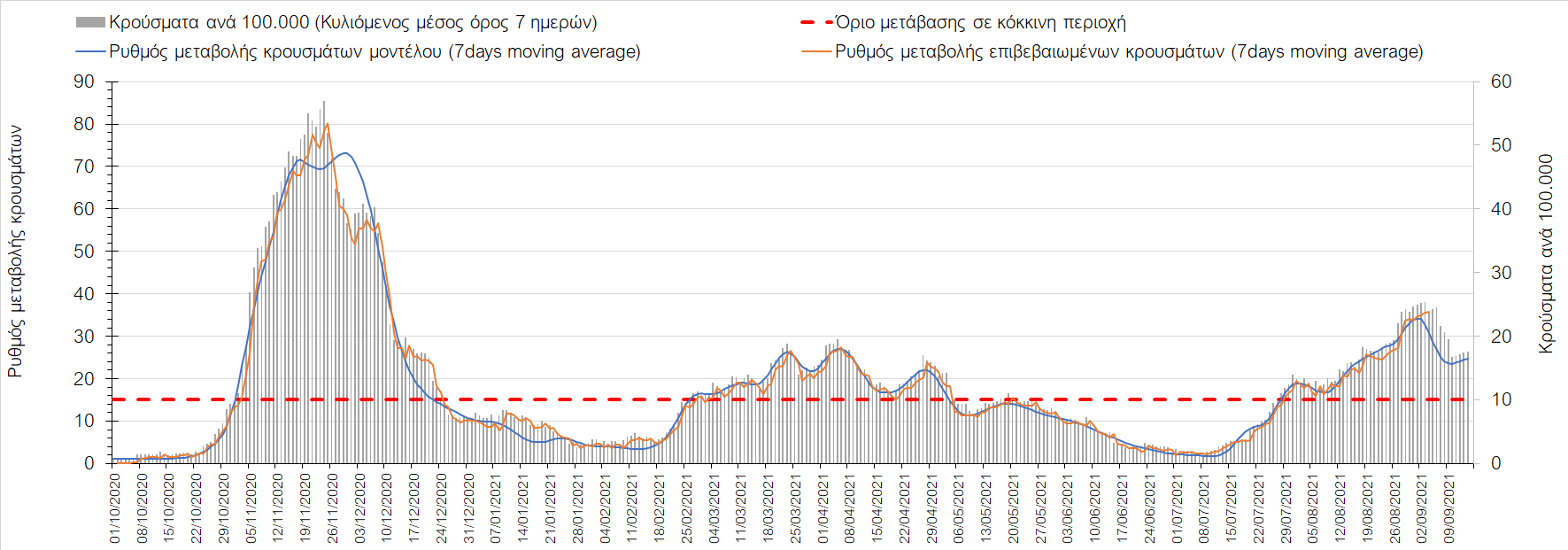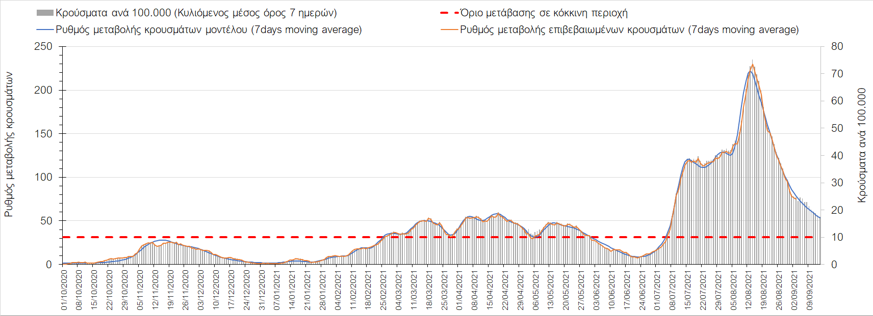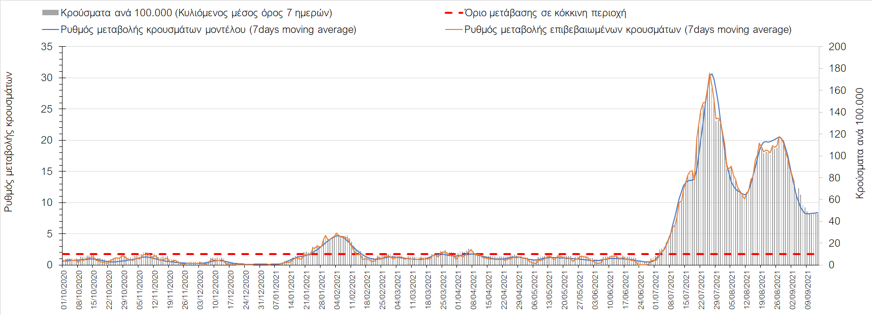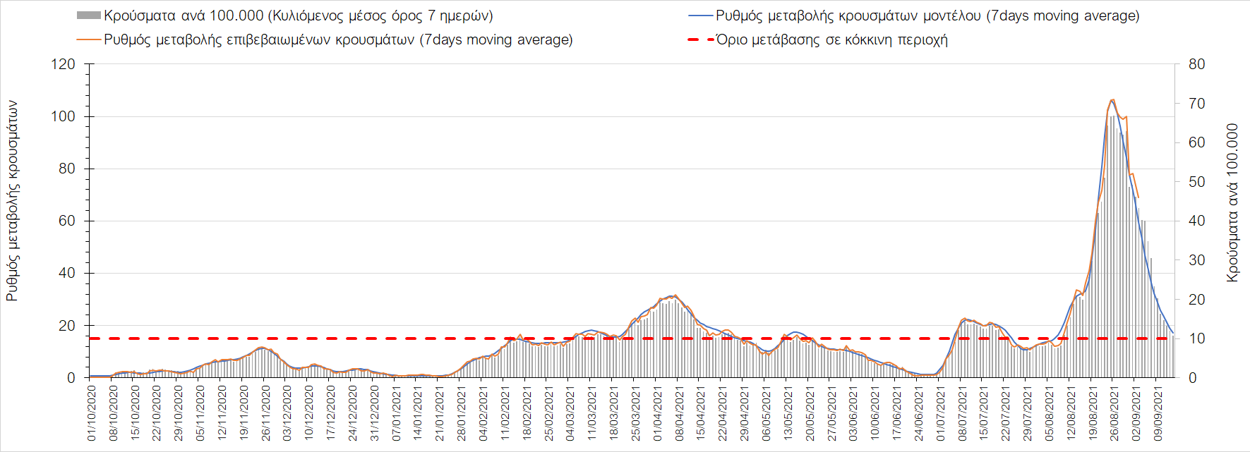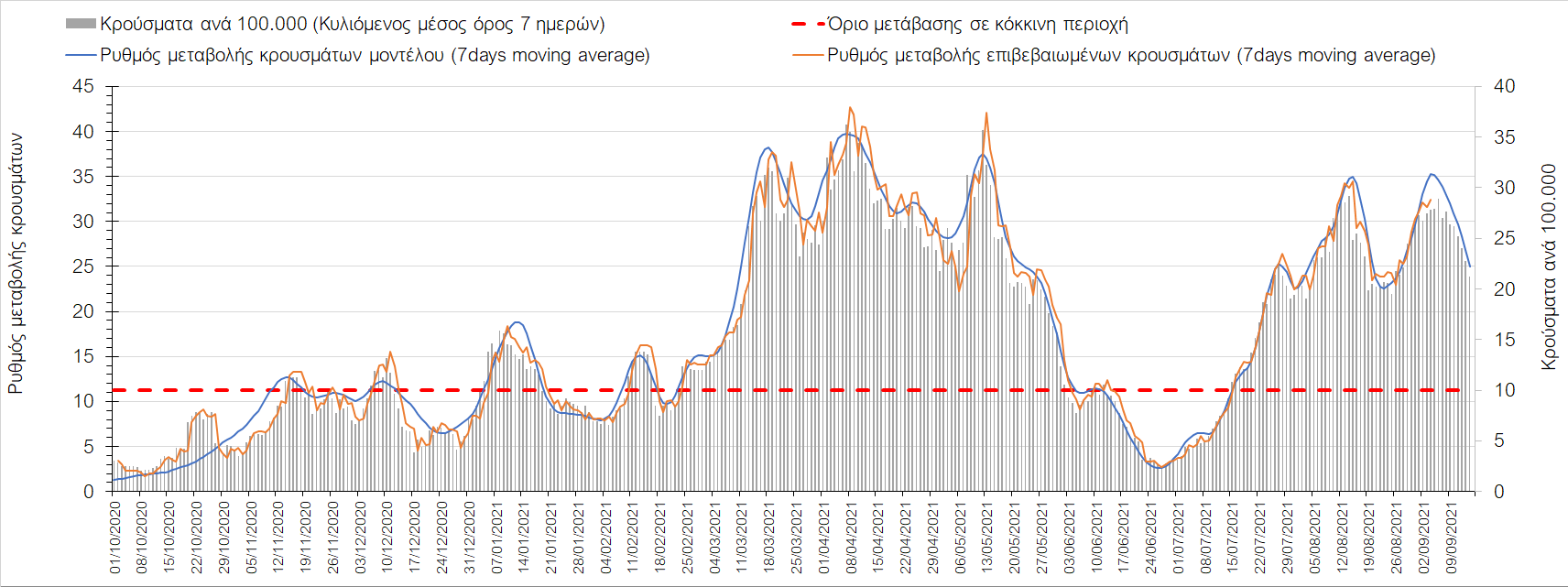 Η πορεία της μέσης εβδομαδιαίας τιμής των κρουσμάτων, καθώς και του κυλιόμενου μέσου όρου 7 ημερών του αριθμού των κρουσμάτων ανά 100.000 πληθυσμού, όπως έχουν καταγραφεί από τον ΕΟΔΥ και η αναμενόμενη πορεία τους όπως προδιαγράφεται από την υπολογιστική πλατφόρμα CORE για την Ελληνική επικράτεια μέχρι τις 15 Σεπτεμβρίου, αποτυπώνονται στο Σχήμα 4. Αυτή η προβλεπόμενη πορεία, που αφορά τα κρούσματα, τους νοσηλευόμενους σε απλές κλίνες, όσο και σε ΜΕΘ, καθώς επίσης και τους θανάτους, βασίζεται στις ακόλουθες παραδοχές: