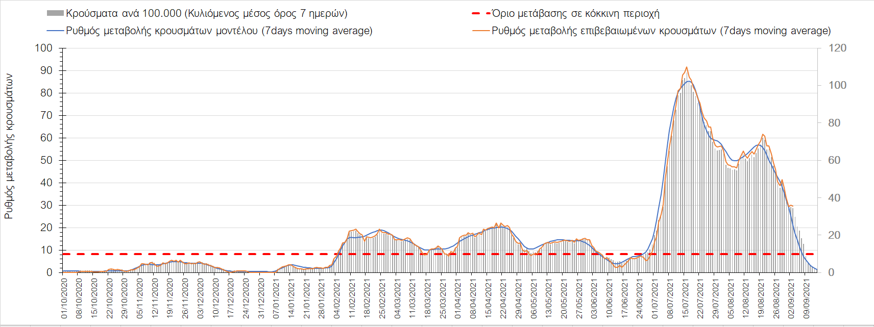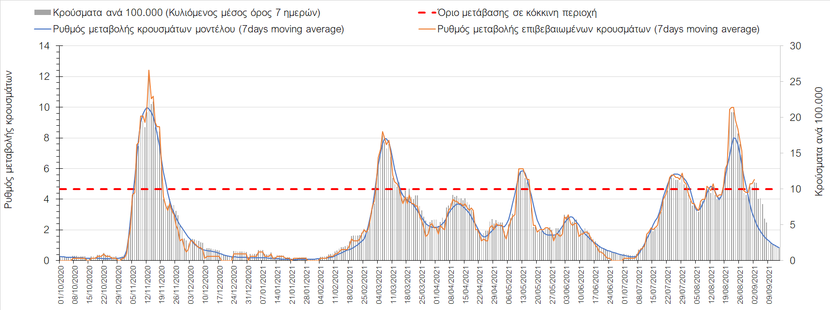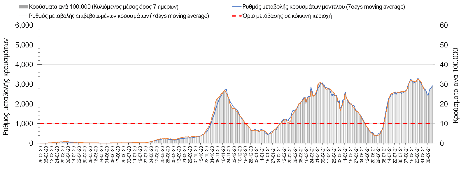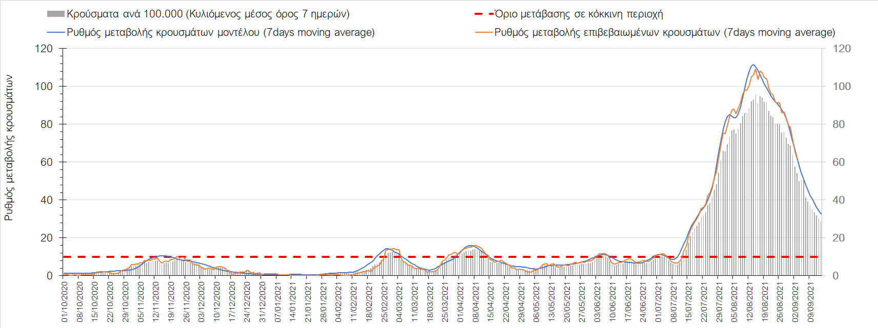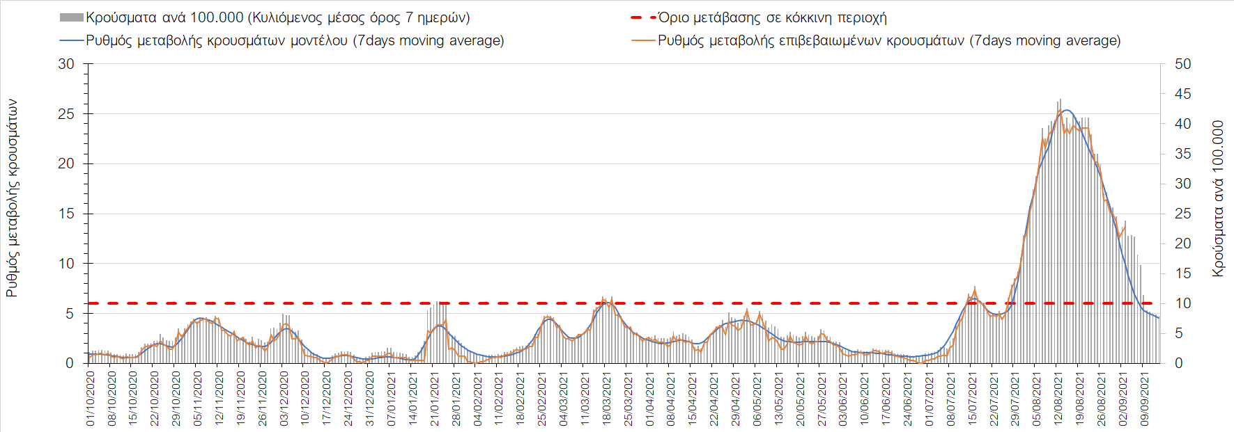 Η πορεία της μέσης εβδομαδιαίας τιμής των κρουσμάτων, καθώς και του κυλιόμενου μέσου όρου 7 ημερών του αριθμού των κρουσμάτων ανά 100.000 πληθυσμού, όπως έχουν καταγραφεί από τον ΕΟΔΥ και η αναμενόμενη πορεία τους όπως προδιαγράφεται από την υπολογιστική πλατφόρμα CORE για την Ελληνική επικράτεια μέχρι τις 15 Σεπτεμβρίου, αποτυπώνονται στο Σχήμα 4. Αυτή η προβλεπόμενη πορεία, που αφορά τα κρούσματα, τους νοσηλευόμενους σε απλές κλίνες, όσο και σε ΜΕΘ, καθώς επίσης και τους θανάτους, βασίζεται στις ακόλουθες παραδοχές: