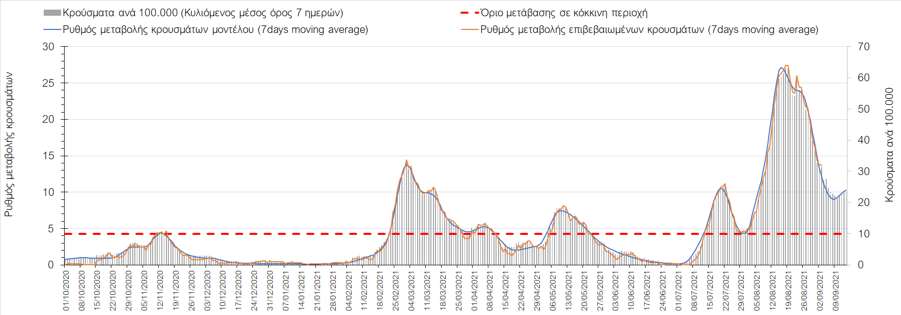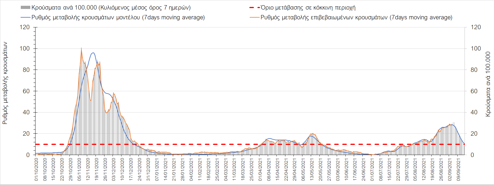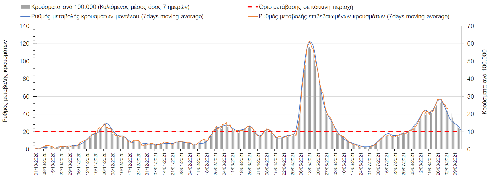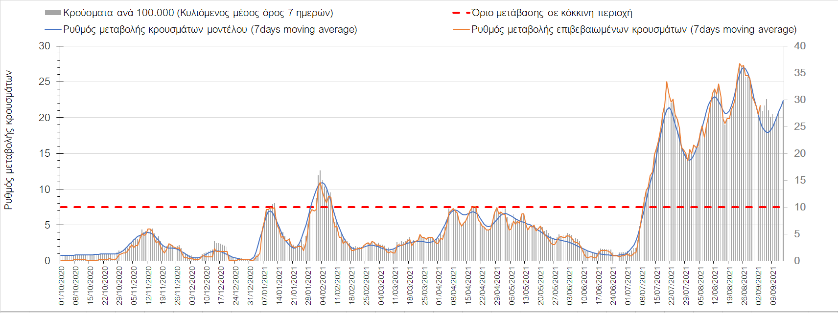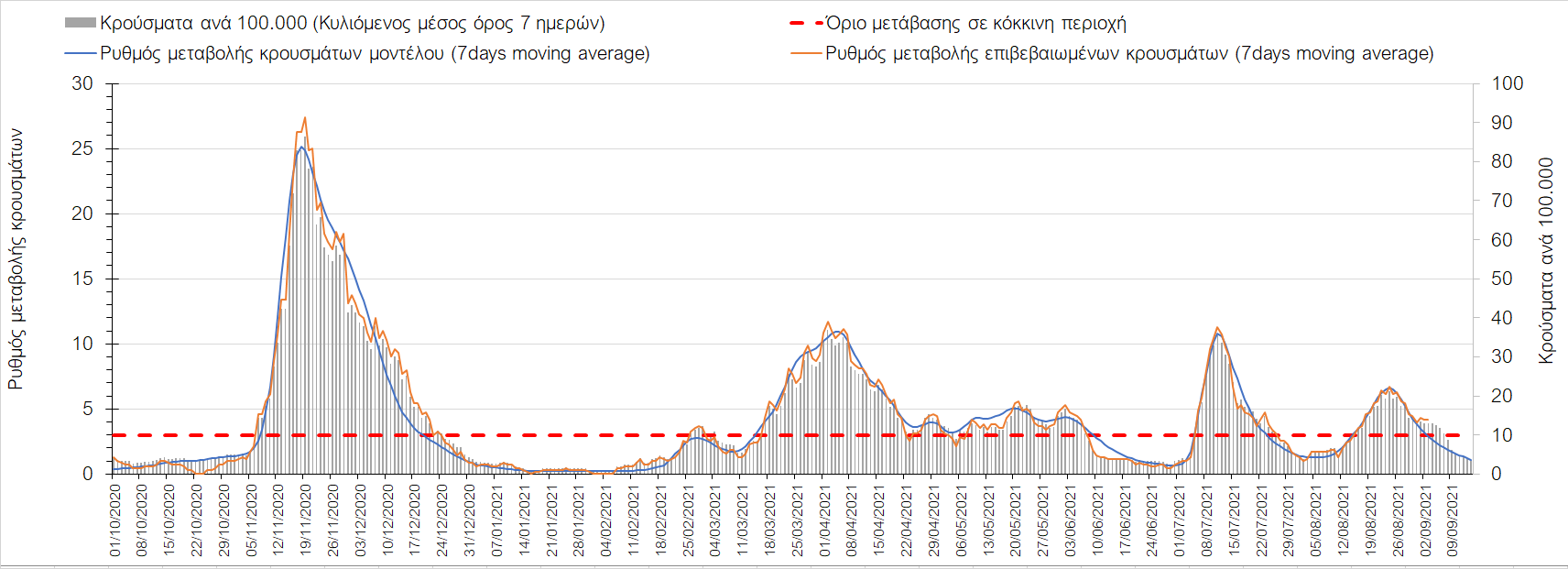 Η πορεία της μέσης εβδομαδιαίας τιμής των κρουσμάτων, καθώς και του κυλιόμενου μέσου όρου 7 ημερών του αριθμού των κρουσμάτων ανά 100.000 πληθυσμού, όπως έχουν καταγραφεί από τον ΕΟΔΥ και η αναμενόμενη πορεία τους όπως προδιαγράφεται από την υπολογιστική πλατφόρμα CORE για την Ελληνική επικράτεια μέχρι τις 15 Σεπτεμβρίου, αποτυπώνονται στο Σχήμα 4. Αυτή η προβλεπόμενη πορεία, που αφορά τα κρούσματα, τους νοσηλευόμενους σε απλές κλίνες, όσο και σε ΜΕΘ, καθώς επίσης και τους θανάτους, βασίζεται στις ακόλουθες παραδοχές: