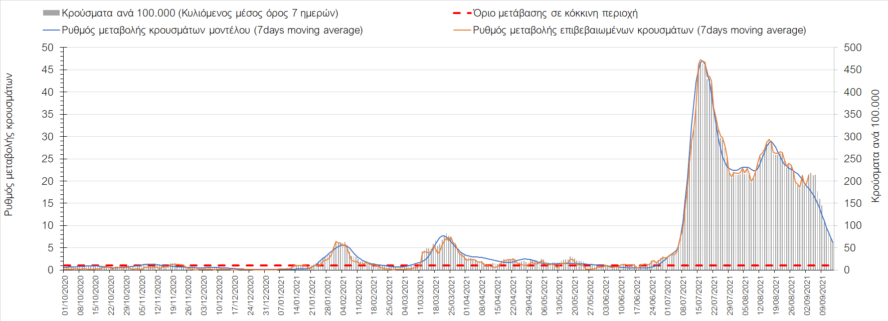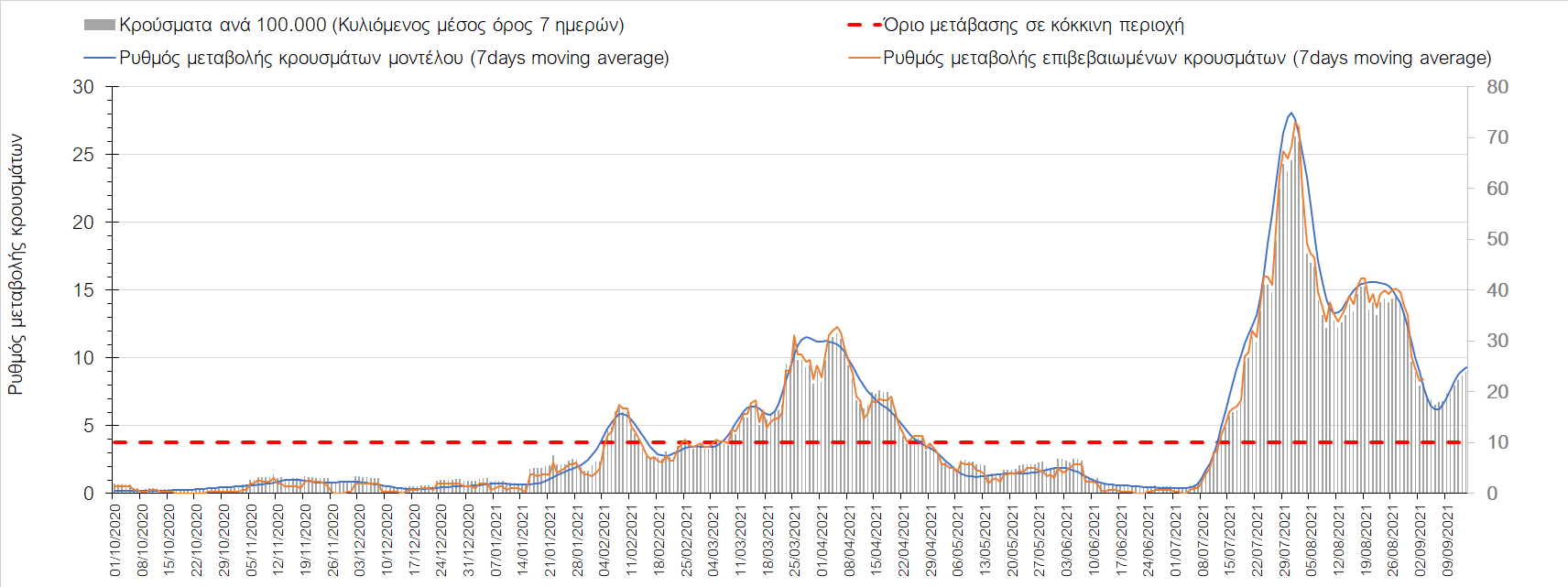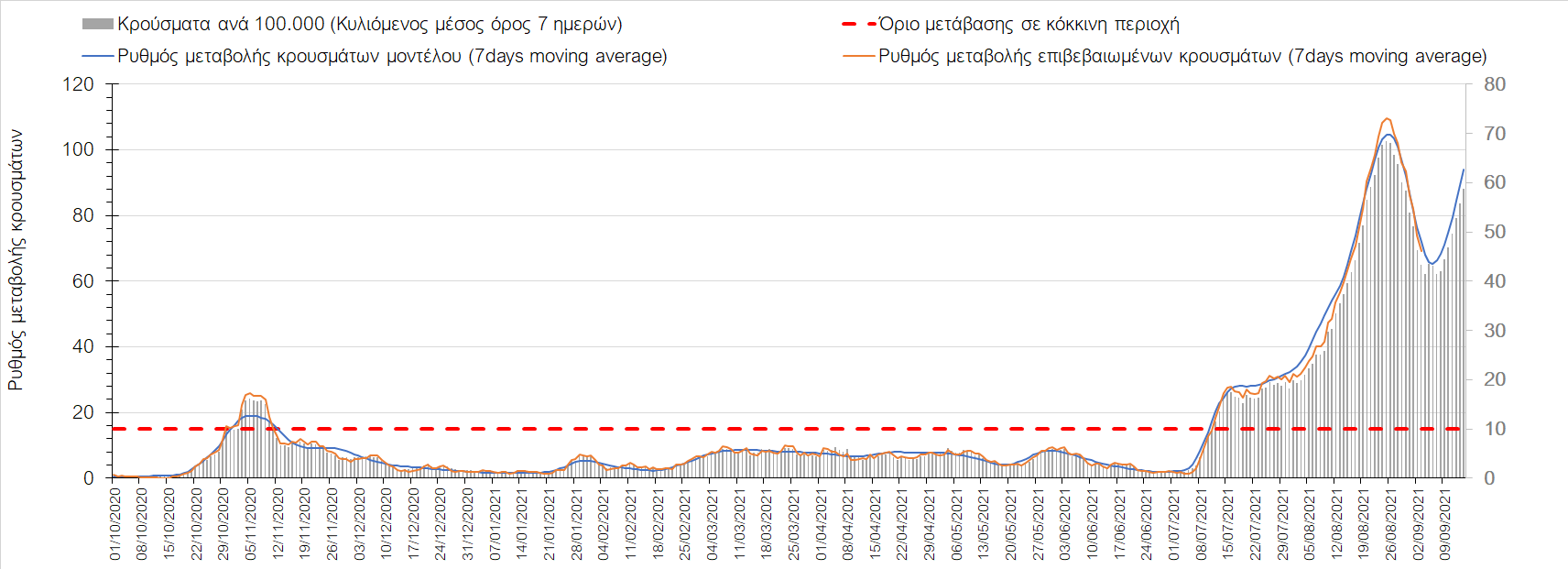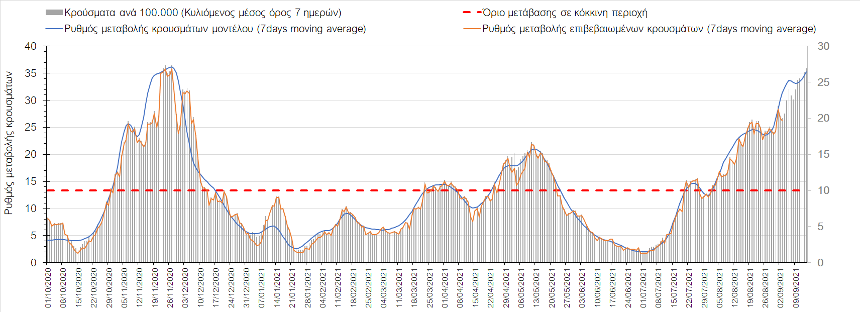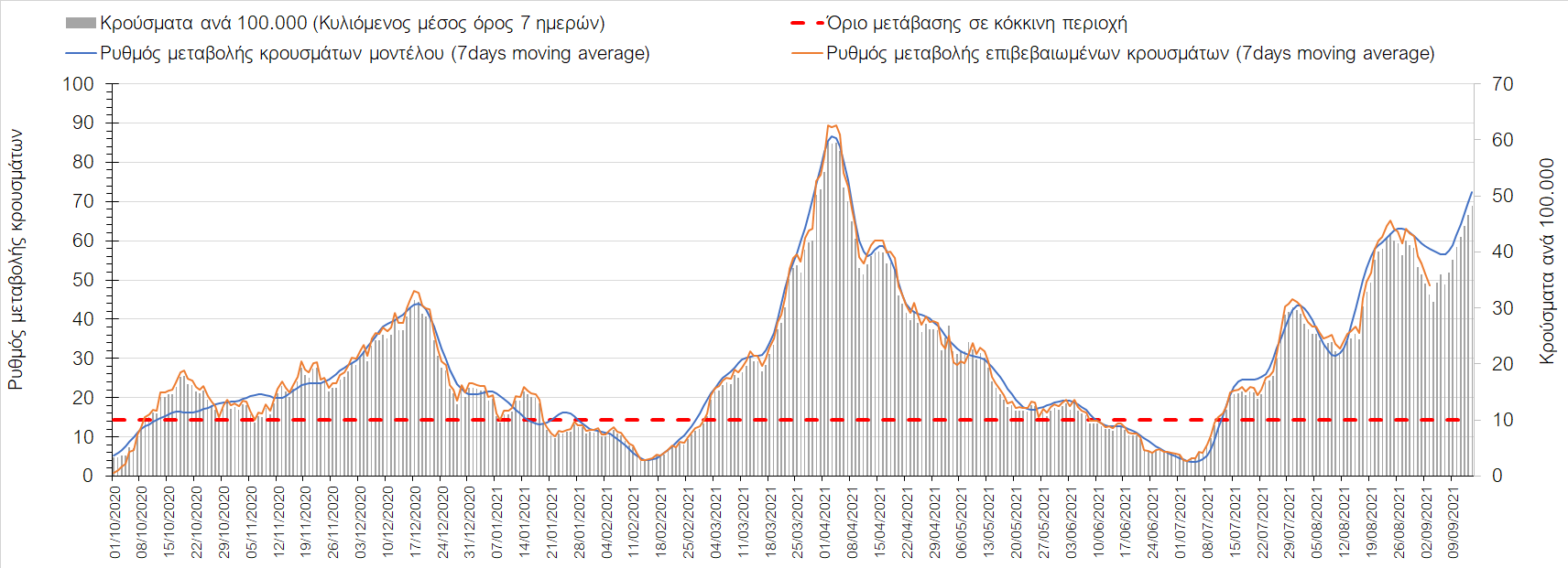 Η πορεία της μέσης εβδομαδιαίας τιμής των κρουσμάτων, καθώς και του κυλιόμενου μέσου όρου 7 ημερών του αριθμού των κρουσμάτων ανά 100.000 πληθυσμού, όπως έχουν καταγραφεί από τον ΕΟΔΥ και η αναμενόμενη πορεία τους όπως προδιαγράφεται από την υπολογιστική πλατφόρμα CORE για την Ελληνική επικράτεια μέχρι τις 15 Σεπτεμβρίου, αποτυπώνονται στο Σχήμα 4. Αυτή η προβλεπόμενη πορεία, που αφορά τα κρούσματα, τους νοσηλευόμενους σε απλές κλίνες, όσο και σε ΜΕΘ, καθώς επίσης και τους θανάτους, βασίζεται στις ακόλουθες παραδοχές:
