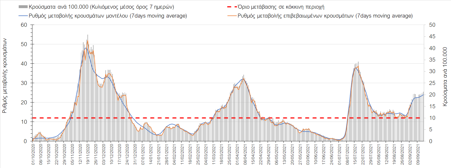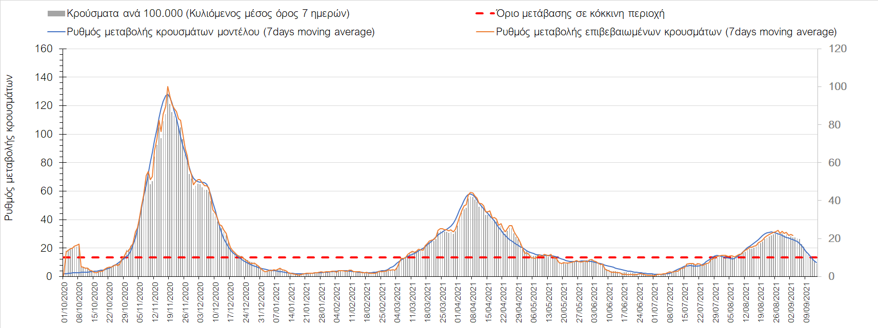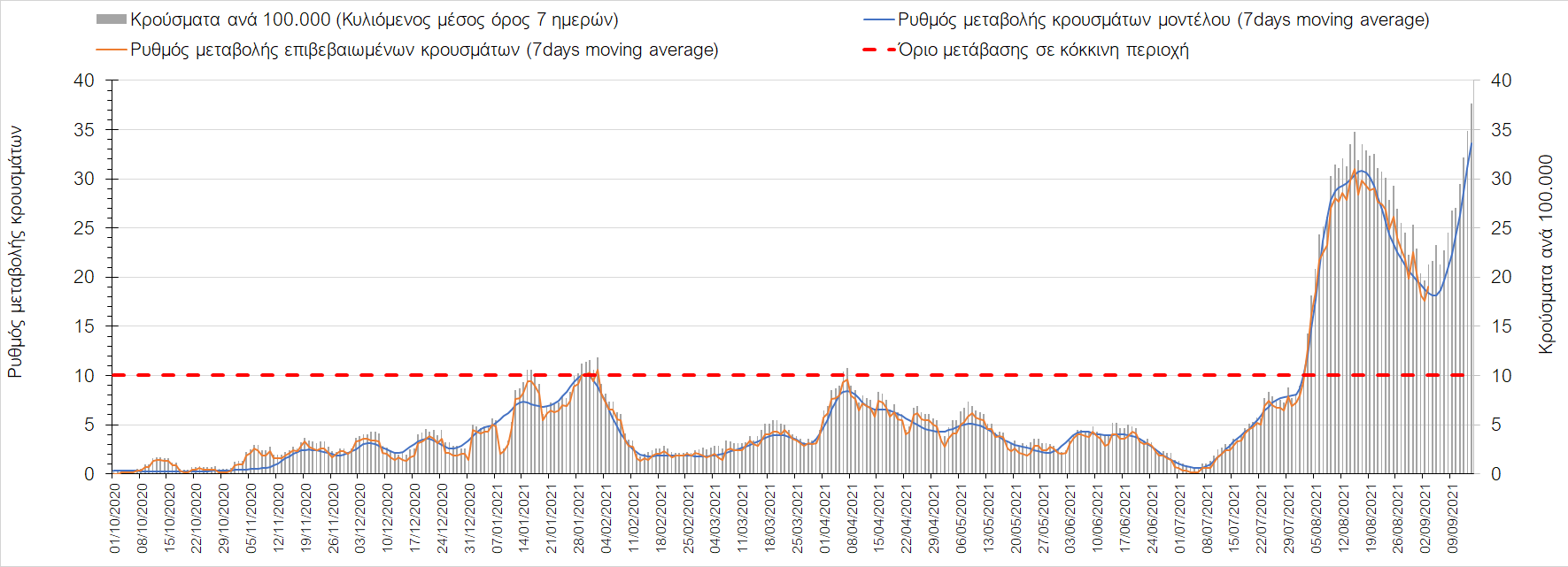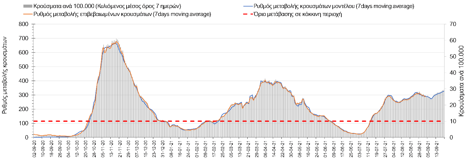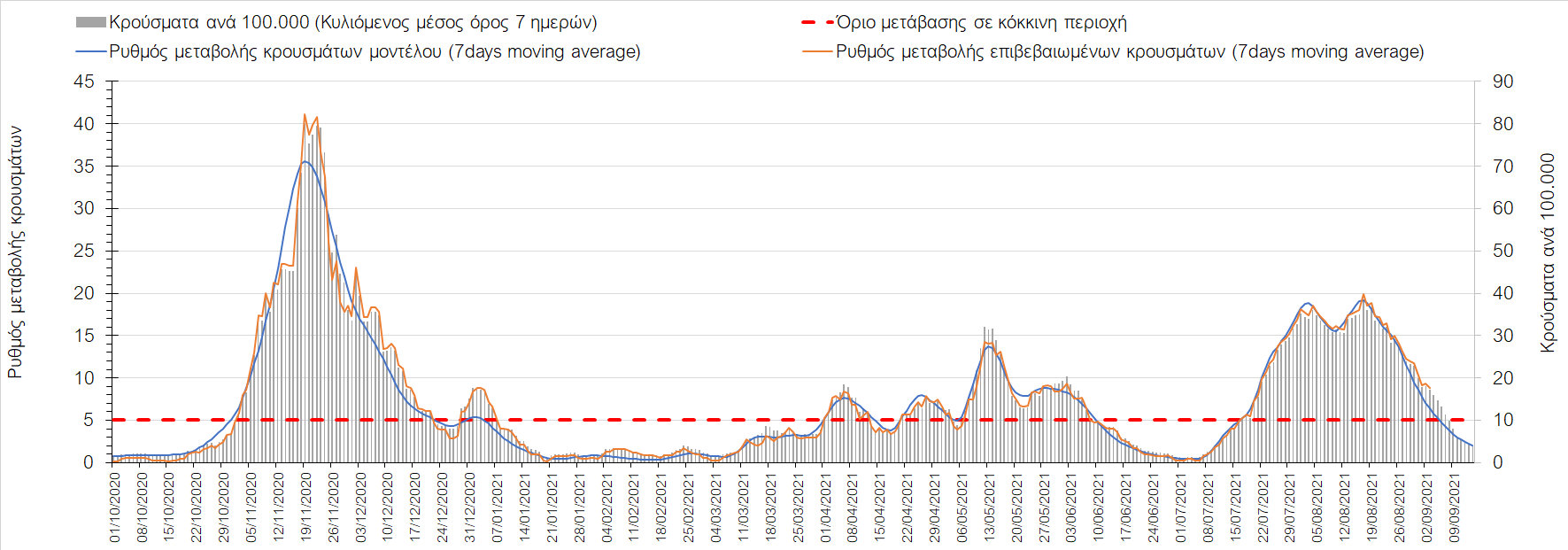 Η πορεία της μέσης εβδομαδιαίας τιμής των κρουσμάτων, καθώς και του κυλιόμενου μέσου όρου 7 ημερών του αριθμού των κρουσμάτων ανά 100.000 πληθυσμού, όπως έχουν καταγραφεί από τον ΕΟΔΥ και η αναμενόμενη πορεία τους όπως προδιαγράφεται από την υπολογιστική πλατφόρμα CORE για την Ελληνική επικράτεια μέχρι τις 15 Σεπτεμβρίου, αποτυπώνονται στο Σχήμα 4. Αυτή η προβλεπόμενη πορεία, που αφορά τα κρούσματα, τους νοσηλευόμενους σε απλές κλίνες, όσο και σε ΜΕΘ, καθώς επίσης και τους θανάτους, βασίζεται στις ακόλουθες παραδοχές: