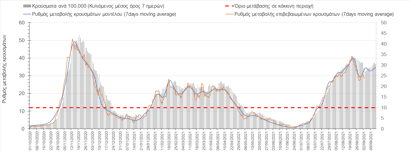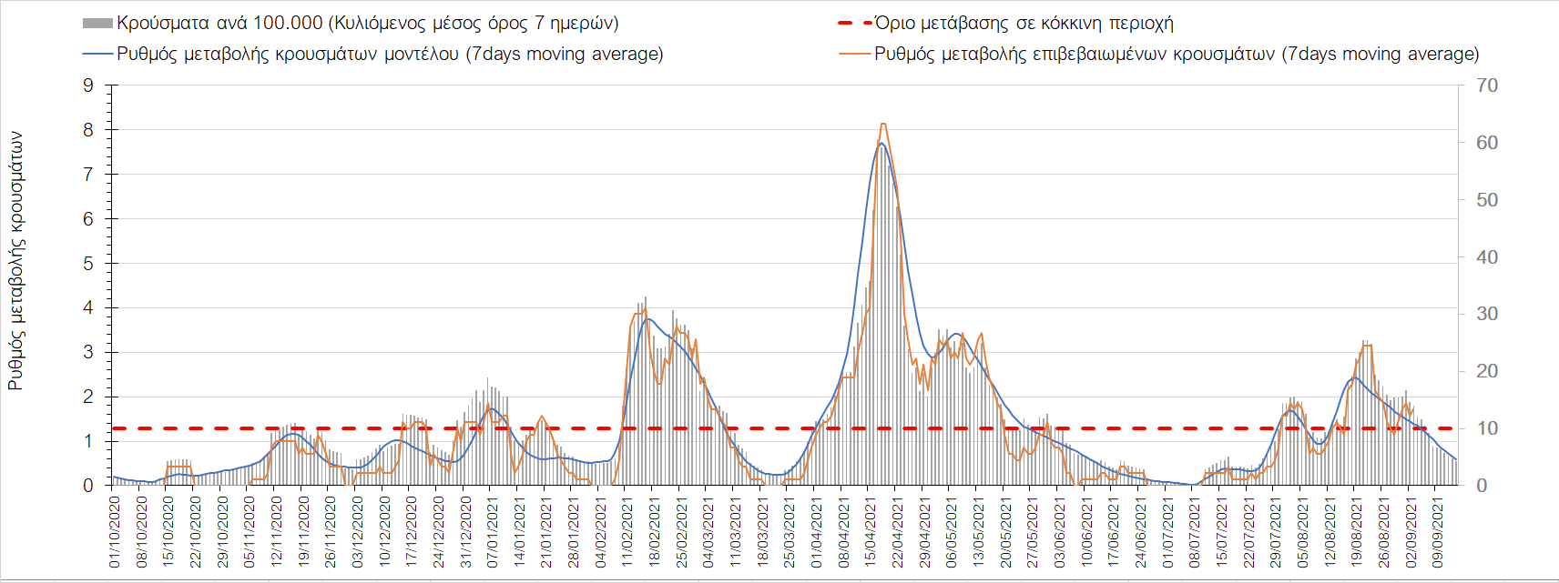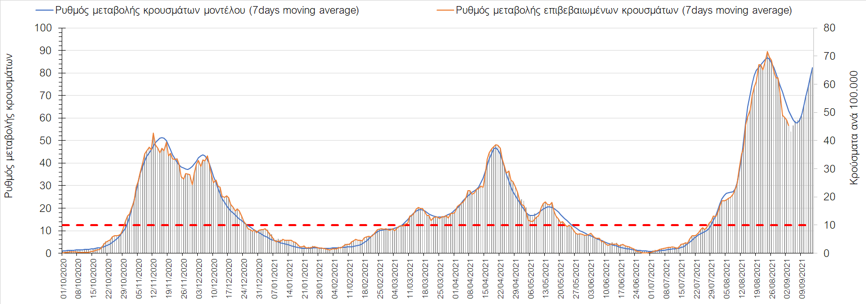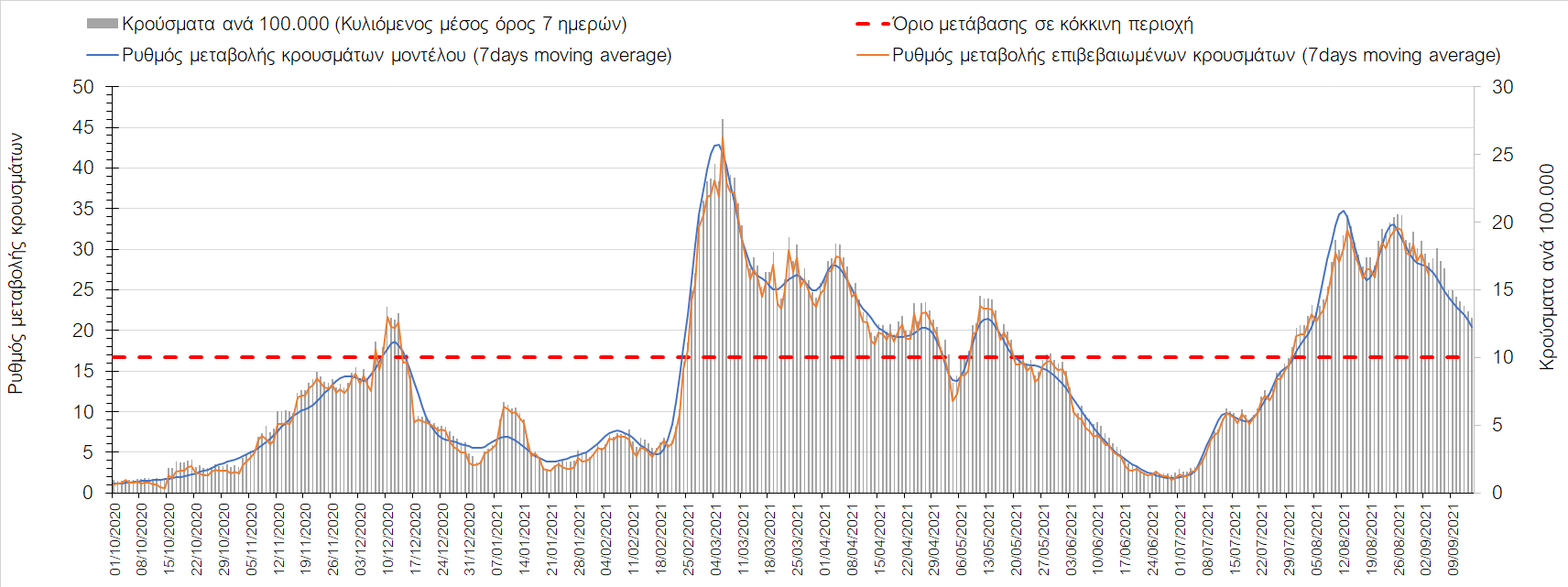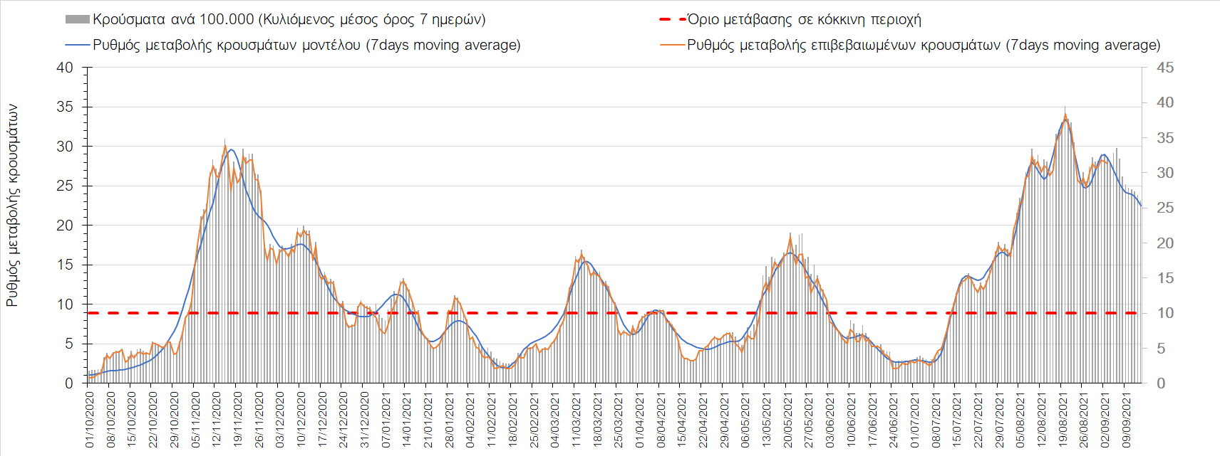 Η πορεία της μέσης εβδομαδιαίας τιμής των κρουσμάτων, καθώς και του κυλιόμενου μέσου όρου 7 ημερών του αριθμού των κρουσμάτων ανά 100.000 πληθυσμού, όπως έχουν καταγραφεί από τον ΕΟΔΥ και η αναμενόμενη πορεία τους όπως προδιαγράφεται από την υπολογιστική πλατφόρμα CORE για την Ελληνική επικράτεια μέχρι τις 15 Σεπτεμβρίου, αποτυπώνονται στο Σχήμα 4. Αυτή η προβλεπόμενη πορεία, που αφορά τα κρούσματα, τους νοσηλευόμενους σε απλές κλίνες, όσο και σε ΜΕΘ, καθώς επίσης και τους θανάτους, βασίζεται στις ακόλουθες παραδοχές: