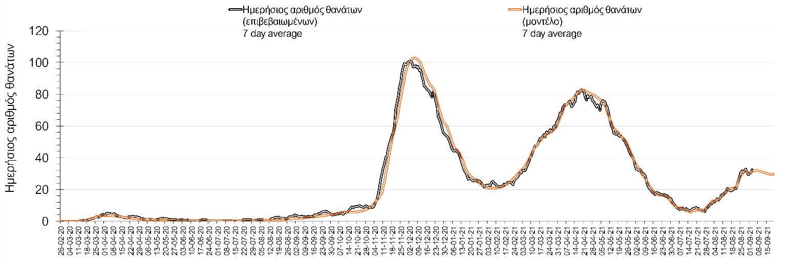 Σχήμα 3. Αριθμός θανάτων (κυλιόμενος μέσος όρος 7 ημερών) σύμφωνα με τα στοιχεία του ΕΟΔΥ και τις προβλέψεις της υπολογιστικής πλατφόρμας CORE.