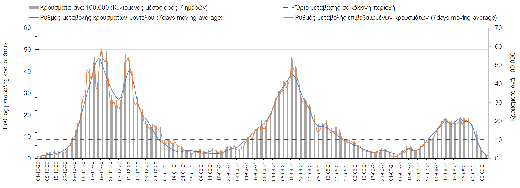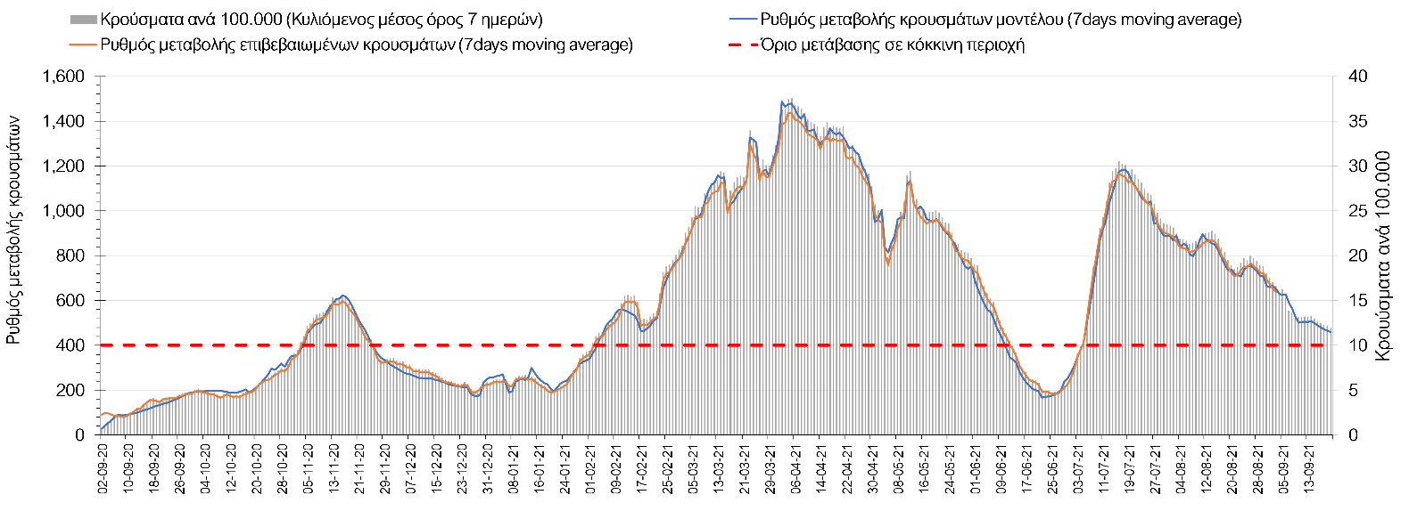 Σε πανελλαδικό επίπεδο ο κυλιόμενος εβδομαδιαίος μέσος όρος του δείκτη θετικότητας διαμορφώθηκε στο 3,1% (η ημερήσια τιμή είναι 2,5%) ενώ ο κυλιόμενος εβδομαδιαίος μέσος όρος του πραγματικού αριθμού αναπαραγωγής Rt (δηλαδή ο αριθμός των ατόμων που ένας φορέας μπορεί να επιμολύνει) μειώθηκε ελαφρά και διαμορφώθηκε στο 0,89 (Rt κάτω από τη μονάδα υποδηλώνει μείωση της διασποράς του ιού στην κοινότητα).