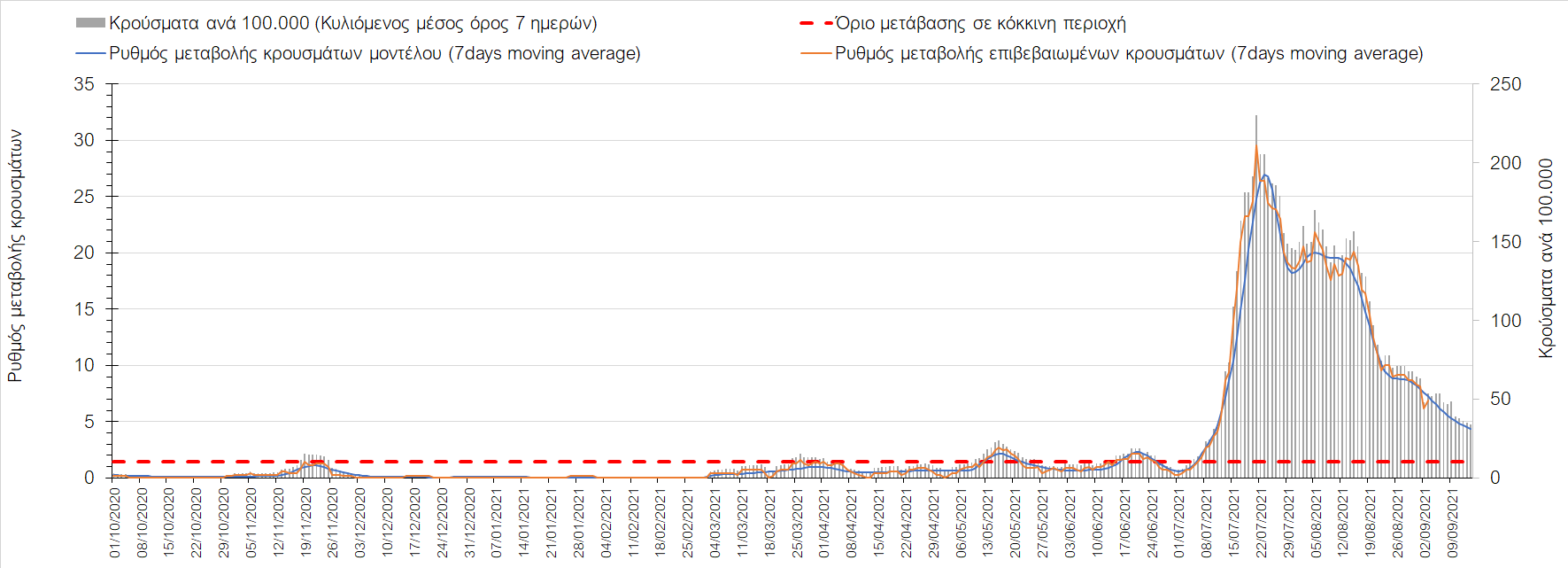 Συνολικά η πορεία της πανδημίας είναι αυξητική από τις 28/6 και μετά, όμως η πτωτική τάση των τελευταίων ημερών αντικατοπτρίζεται και από τον ημερήσιο αριθμό των κρουσμάτων (κυλιόμενος μέσος όρος 7 ημερών), ο οποίος έπεσε κάτω από τα 2800 (2722).