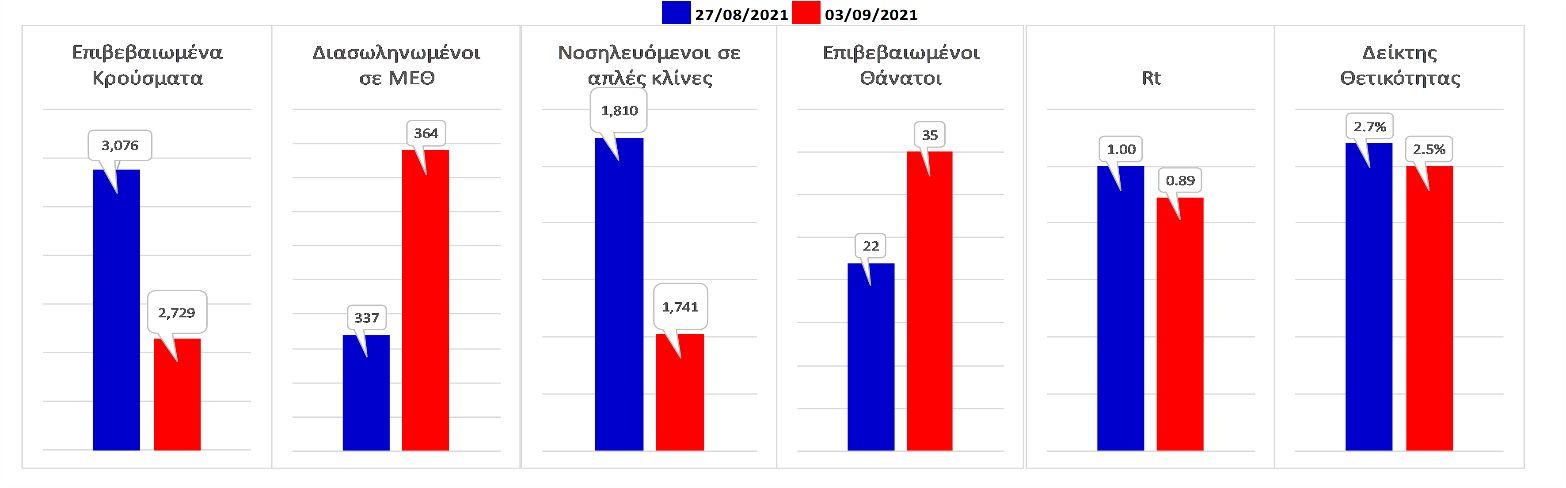 Σχήμα 58. Συγκριτικά αποτελέσματα της επιδημιολογικής εικόνας της σημερινής Παρασκευής (03/09/2021) σε σχέση με την προηγούμενη (27/08/2021)