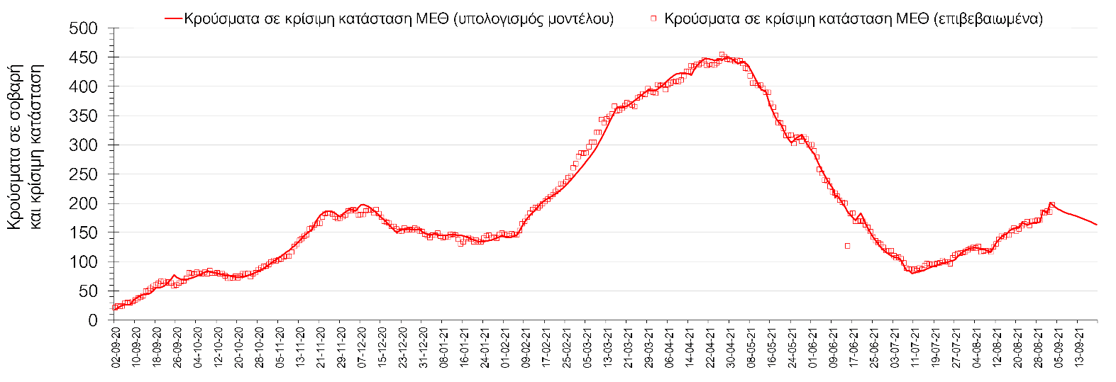 Αντίθετα στη Θεσσαλονίκη η αυξητική πορεία αρχίζει πάλι να κάμπτεται (Σχήμα 7), ενώ η πορεία των κρουσμάτων σε κρίσιμη κατάσταση (διασωληνωμένοι σε ΜΕΘ) στη Θεσσαλονίκη ακολουθεί πλήρως τις προβλέψεις του μοντέλου και παρουσιάζεται στο Σχήμα 8.