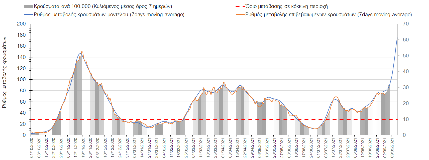 Με βάση τα αποτελέσματα, την Παρασκευή σε σχέση με προχθές, είχαμε λίγο υψηλότερο αριθμό τόσο ασθενών σε κρίσιμη κατάσταση (διασωληνωμένοι σε ΜΕΘ) όσο και θανάτων. Πλέον αρχίζει να διαμορφώνεται διαφορετική κατάσταση σε σχέση με τις προηγούμενες εβδομάδες, όπου η διασπορά των κρουσμάτων διαχέονταν πλέον στις περισσότερες περιοχές της χώρας (κυρίως λόγω μετακίνησης πληθυσμών για παραθερισμό και λόγω τουριστικών ροών). Αναμένουμε τις επόμενες ημέρες για να δούμε τις επιπτώσεις της επιστροφής του κύματος εξόδου του Αυγούστου στην πορεία της πανδημίας.