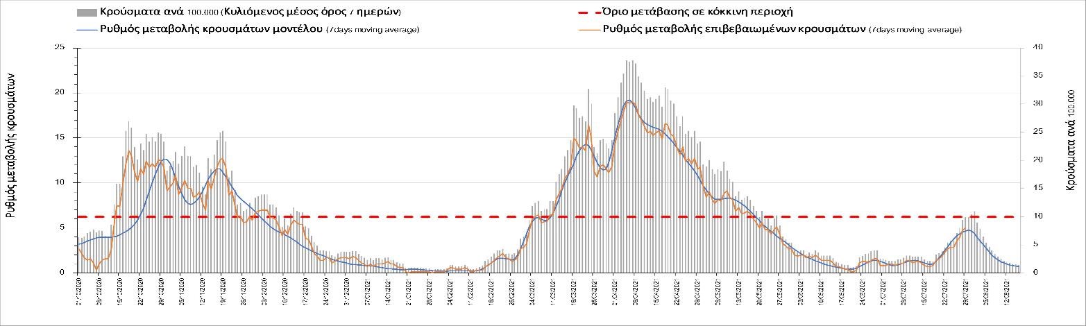Σύμφωνα με τα στοιχεία του ΕΟΔΥ, ο αριθμός κρουσμάτων ανήλθε στα 2696 νέα κρούσματα, με τα αποτελέσματα να συνάδουν με τις προβλέψεις της υπολογιστικής πλατφόρμας CORE (n=2714), που λαμβάνουν υπόψη την διασπορά όλων των μεταλλαγμένων στελεχών του SARS-CoV-2. Ο αριθμός των τεστ που πραγματοποιήθηκαν ήταν 102.034 και σε συνδυασμό με τον αριθμό των κρουσμάτων, ο δείκτης θετικότητας διαμορφώθηκε στο 2,6%. Η πραγματοποίηση αριθμού τεστ σε επίπεδα άνω των 50.000 την ημέρα, συντελεί στο να εξάγουμε πιο ασφαλή συμπεράσματα σχετικά με την πορεία της πανδημίας, αλλά και να εντοπίζονται περισσότεροι ασυμπτωματικοί και προσυμπτωματικοί, συντελώντας στην ανάσχεση πιθανής έξαρσης που θα μπορούσε να συμβεί λόγω της εμφάνισης ολοένα και ταχύτερα μεταδιδόμενων στελεχών, σε συνδυασμό με τα υπάρχοντα ανοίγματα και τις τουριστικές ροές. Σημαντικοί σύμμαχοι σε αυτή την προσπάθεια αύξησης του αριθμού των τεστ ανίχνευσης του SARS-CoV-2 αποτελούν εκτός από τα rapid test και τα self test, για να καταπολεμηθεί η δυναμική αύξησης της διασποράς στις περιοχές όπου μια τέτοια αύξηση διαφαίνεται από τα μέχρι τώρα δεδομένα και την υπολογιστική πλατφόρμα CORE, αλλά και για να συνεχιστεί η πολύ καλή πορεία στο σύνολο της χώρας.Ο αριθμός ημερήσιων θανάτων (9) που καταγράφηκε την Πέμπτη είναι μικρότερος από την Τετάρτη (15). Όπως είχαμε προβλέψει ο κυλιόμενος εβδομαδιαίος μέσος όρος που σήμερα είναι 9 παραμένει σε χαμηλά επίπεδα, αλλά από την επόμενη εβδομάδα αναμένεται να ακολουθήσει την ανοδική τάση των ασθενών σε κρίσιμη κατάσταση. Όσον αφορά στους ασθενείς σε κρίσιμη κατάσταση (διασωληνωμένοι σε ΜΕΘ), την Πέμπτη ο αριθμός είναι αυξημένος σε σχέση με την Τετάρτη (157 από 144), και πλέον βλέπουμε την επιβράδυνση της πτώσης να έχει οδηγήσει προς την αναμενόμενη αναστροφή της πτωτικής πορείας να συμβαίνει την χρονική στιγμή που αναμέναμε. Η καμπύλη εξέλιξης του αριθμού των ασθενών που νοσηλεύονται σε κλίνες ΜΕΘ με βάση τις προσομοιώσεις της πλατφόρμας CORE, όπως αυτή παρουσιάζεται στο Σχήμα 1, των ασθενών που νοσηλεύονται σε απλές κλίνες στο Σχήμα 2 (όπου διαφαίνεται πλέον η αναμενόμενη αύξηση στις νοσηλείες), ενώ μια εκτίμηση για την πορεία των θανάτων ανά ημέρα παρουσιάζεται στο Σχήμα 3.
