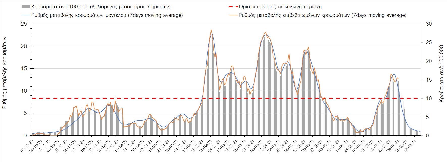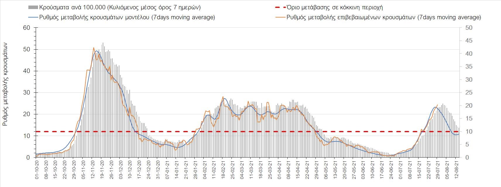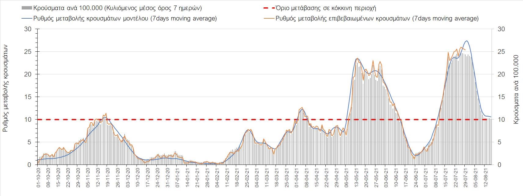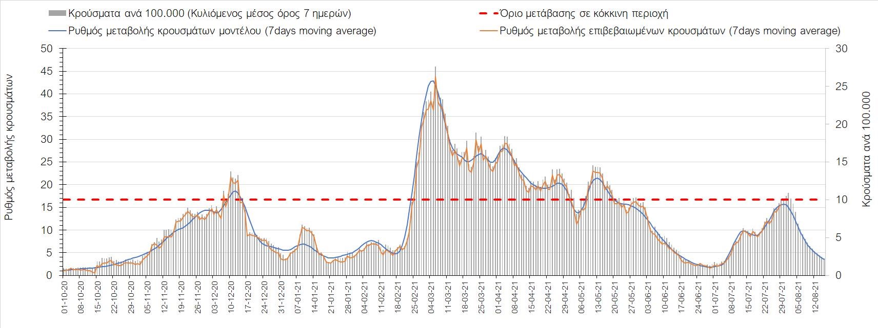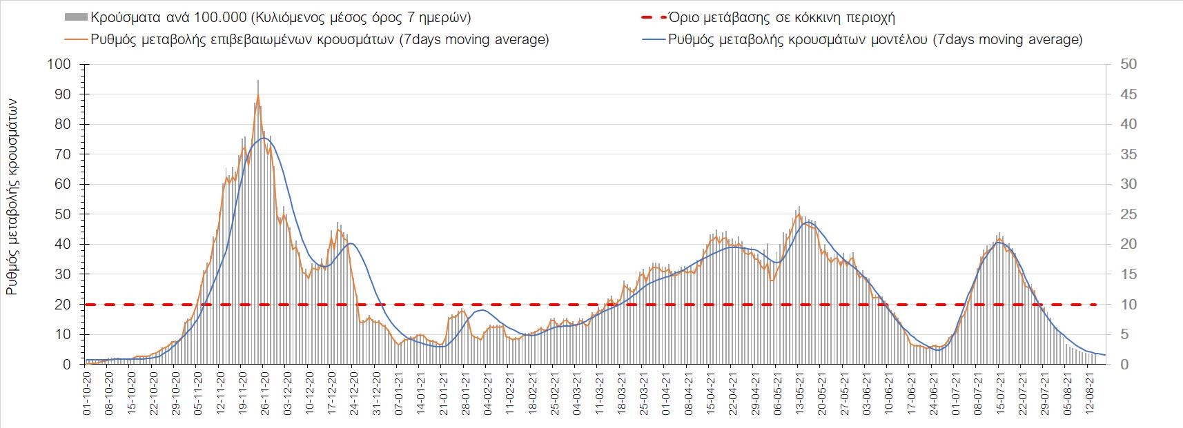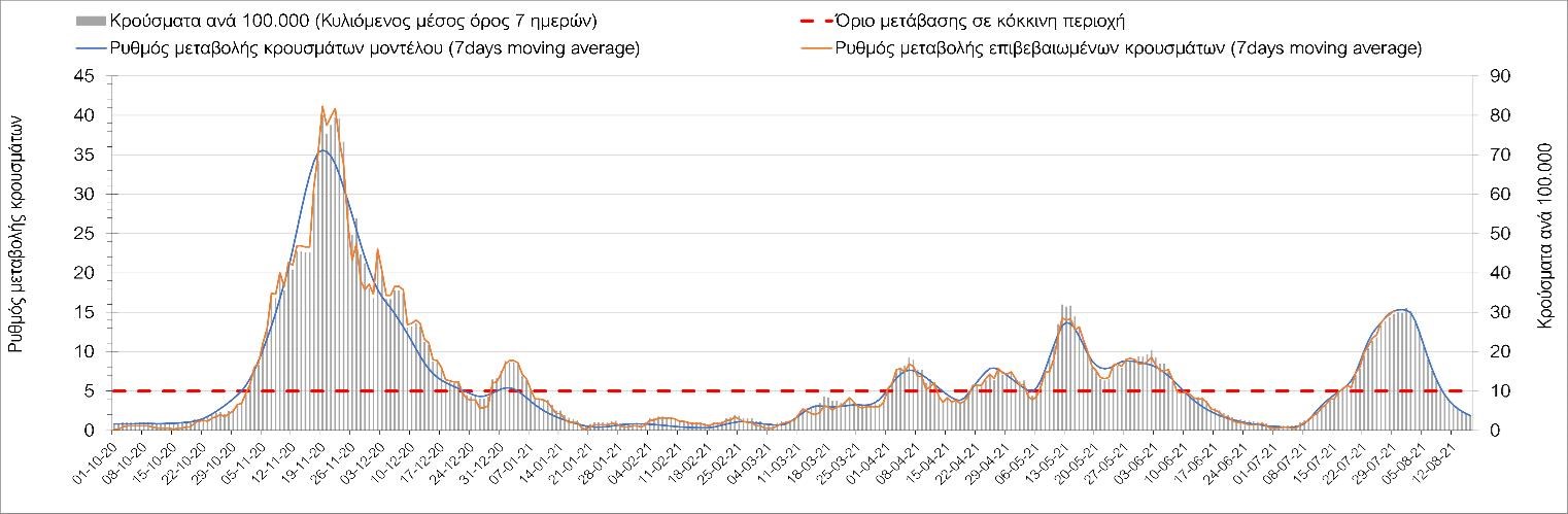 Σχήμα 58. Συγκριτικά αποτελέσματα της επιδημιολογικής εικόνας της σημερινής Πέμπτης (29/07/2021) σε σχέση με την προηγούμενη (22/07/2021) Όσον αφορά επιμέρους περιοχές, αρκετές πλέον βρίσκονται πάνω από το όριο χαρακτηρισμού ως κόκκινες, όπως η Αθήνα, η Θεσσαλονίκη η Λάρισα, η Αχαΐα, η Αργολίδα, η Αρκαδία, η Κορινθία, η Μεσσηνία, η Εύβοια, η Βοιωτία, τη Φωκίδα, τα Ιωάννινα, η Θεσπρωτία, η Πρέβεζα, η Κοζάνη, η Ημαθία, η Καβάλα, η Φλώρινα, η Χαλκιδική, η Πιερία, ο Έβρος, το Ηράκλειο, τα Χανιά, το Ρέθυμνο, το Λασίθι, η Κέρκυρα, η Λέσβος, η Πάρος, η Ζάκυνθος, η Μύκονος, η Σαντορίνη και η Ρόδος, ενώ παρατηρούνται έντονα ανοδικές τάσεις στην Άρτα, στη Δράμα, στο Κιλκίς, στην Καστοριά, στη Ξάνθη και στη Χίο. Ιδιαίτερα ανησυχητική είναι η αυξητική πορεία σε τουριστικούς προορισμούς όπως η Ρόδος (που αυτή τη στιγμή έχει την πιο έντονα ανοδική τάση), η Κέρκυρα, η Ζάκυνθος, η Χαλκιδική, η Χίος, η Λέσβος, αλλά και σε περιοχές πιο κοντά στην Αθήνα όπως η Βοιωτία, η Εύβοια, η Κορινθία και η Αργολίδα. Στην Πελοπόννησο ανησυχητικά αυξητική τάση παρουσιάζουν σχεδόν όλες οι περιφερειακές ενότητες με εξαίρεση την Ηλεία, ενώ στην ηπειρωτική και Βόρειο Ελλάδα, η Κοζάνη, η Φλώρινα και ο Έβρος. Στην Κρήτη παραμένει σε υψηλά επίπεδα διασποράς το Ηράκλειο, όπως επίσης και τα Χανιά. Σε αυτές τις περιοχές συνιστούμε κινητοποίηση κλιμακίων του ΕΟΔΥ για αυξημένους ελέγχους με rapid test και καλή ιχνηλάτηση επαφών των θετικών περιπτώσεων.Ιδιαίτερα στην Αθήνα (παρά την πτωτική πορεία), προβληματίζει ο βαθμός που αυτή σχετίζεται με την εξάπλωση μεταλλαγμένων και ταχύτερα μεταδιδόμενων στελεχών (κυρίως το Β.1.1.318 και το Β.1.167). Χαρακτηριστικό παράδειγμα της αυξημένης μεταδοτικότητας του στελέχους Δ (Β.1.167) αποτελεί η Κρήτη. Συνολικά η Κρήτη είναι η περιοχή με τη χειρότερη επιδημιολογική εικόνα και η ταχύτητα μετάδοσης (και το αντίστοιχο ύψος του 4ου κύματος που έχει διαμορφωθεί) είναι ενδεικτική της αυξημένης μεταδοτικότητας του στελέχους Δ. Επίσης, καταδεικνύει τον αρνητικό ρόλο που παίζουν οι διαπεριφερειακές μετακινήσεις στη φάση ανάπτυξης της πανδημίας, καθώς η αρχική αύξηση κρουσμάτων στο Ρέθυμνο πρώτα και στο Ηράκλειο έπειτα, ακολουθήθηκε από αυξητική πορεία της διασποράς στα Χανιά και στο Λασίθι. Στην πράξη, η Κρήτη είναι μια περιοχή οδικά απομονωμένη από την υπόλοιπη Ελλάδα, στην οποία, οι διαπεριφερειακές μετακινήσεις επέτρεψαν τη γρήγορη διασπορά του στελέχους Δ. Παρόμοια φαινόμενα διαπεριφερειακής μετάδοσης παρατηρούνται στη Θεσσαλία, αλλά σε πιο ήπια έκταση, όπου η έντονα αυξητική τάση στη Μαγνησία, μεταφέρθηκε σε κάποιο βαθμό και στη Λάρισα, ενώ ακολουθεί και η Καρδίτσα. Αντίστοιχη είναι η διάχυση της διασποράς στην Ήπειρο και πιο συγκεκριμένα από τα Ιωάννινα προς τα εγγύς τουριστικά θέρετρα (Πρέβεζα και Θεσπρωτία). Συνεπώς, ακόμα και για περιοχές που για την ώρα είναι κάτω από το όριο (ή πολύ κοντά στο όριο), οι ανοδικές τάσεις που παρατηρούνται χρήζουν αυξημένης επιδημιολογικής επιτήρησης με εντατικοποίηση του γονιδιωματικού ελέγχου ώστε να ληφθούν εγκαίρως μέτρα περιορισμού της διασποράς του ιού.Επίσης, σύμφωνα με τα πιο πρόσφατα στοιχεία που έγιναν διαθέσιμα, ανησυχία πλέον δημιουργεί η αύξηση του ποσοστού διασποράς του μεταλλαγμένου στελέχους Β.1.617.2 (μετάλλαξη Δέλτα) σε συγκεκριμένες περιοχές για το 15νθήμερο από 04/07/2021 έως 18/07/2021, όπου οι αντίστοιχες ποσοστώσεις είναι 25.13% για