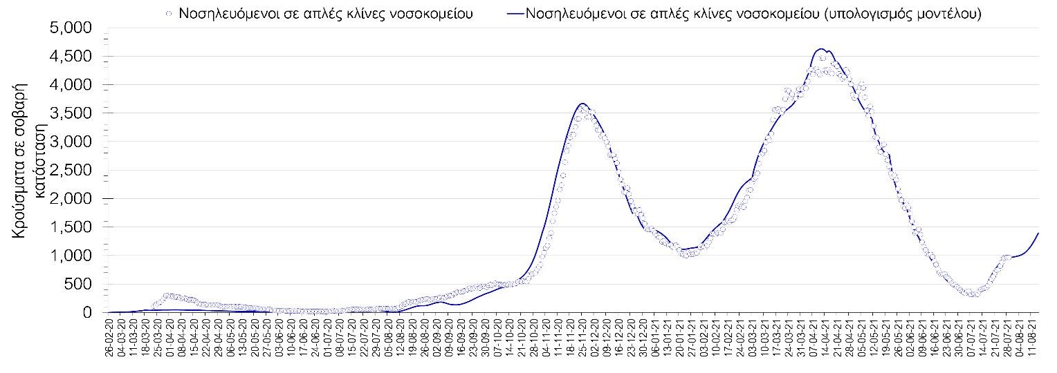 Σχήμα 2. Αριθμός κρουσμάτων σε σοβαρή κατάσταση (νοσηλευόμενοι σε απλές κλίνες) σύμφωνα με τα στοιχεία του ΕΟΔΥ και τις προβλέψεις της υπολογιστικής πλατφόρμας CORE.