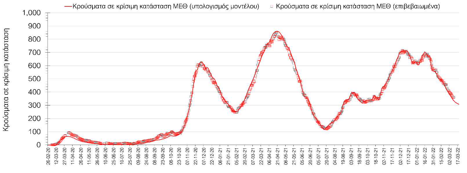 Η πορεία της μέσης εβδομαδιαίας τιμής των κρουσμάτων, καθώς και του κυλιόμενου μέσου όρου 7 ημερών του αριθμού των κρουσμάτων ανά 100.000 πληθυσμού, όπως έχουν καταγραφεί από τον ΕΟΔΥ και η αναμενόμενη πορεία τους, όπως προδιαγράφεται από την υπολογιστική πλατφόρμα CORE για την Ελληνική επικράτεια (όπως και στην Αττική και τη Θεσσαλονίκη) μέχρι τις 15 Μαρτίου, αποτυπώνονται στο Σχήμα 4. Αυτή η προβλεπόμενη πορεία, που αφορά τα κρούσματα, τους νοσηλευόμενους σε απλές κλίνες, όσο και σε ΜΕΘ, καθώς επίσης και τους θανάτους, βασίζεται στις ακόλουθες παραδοχές:
