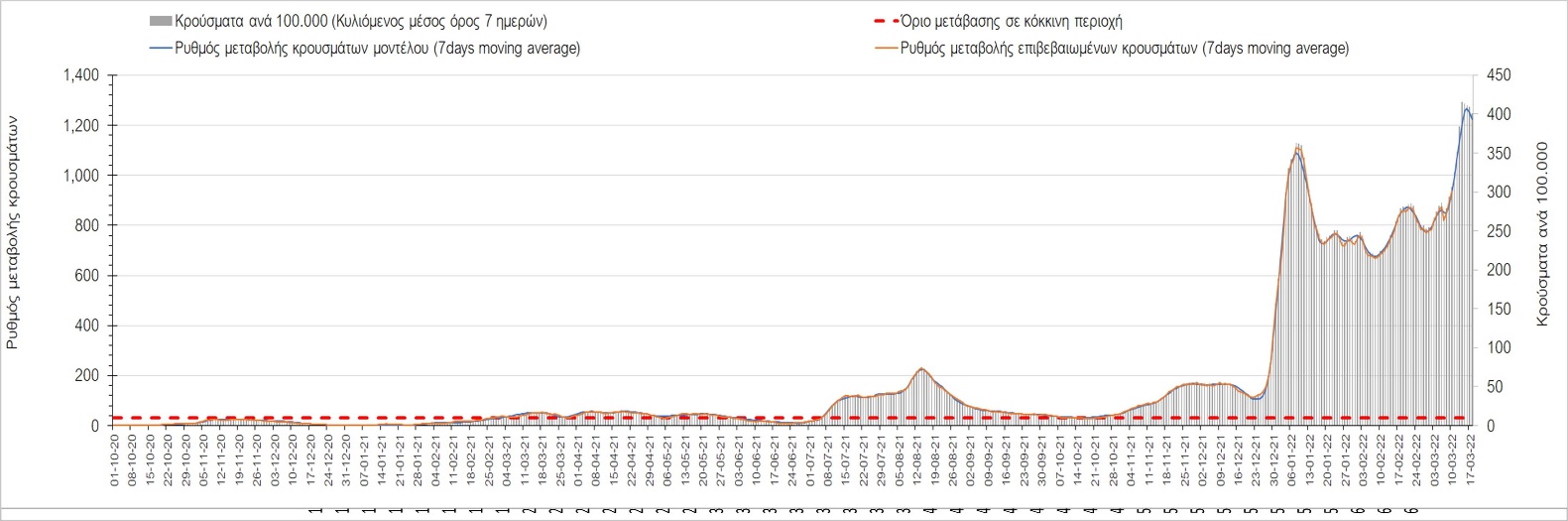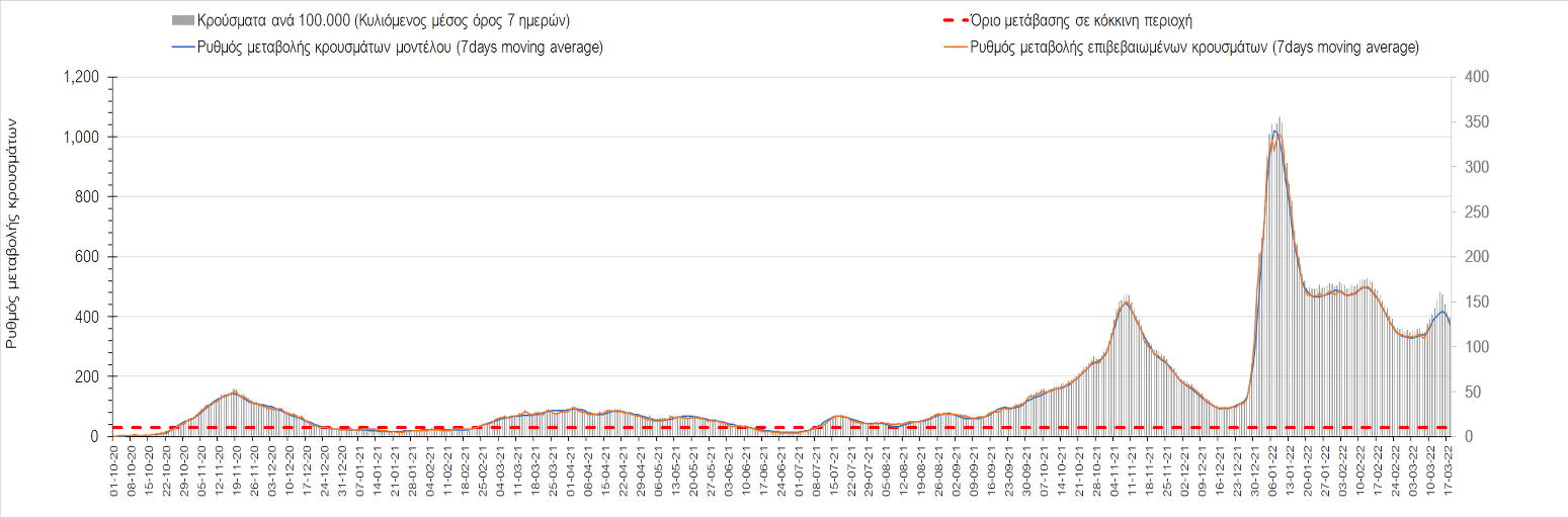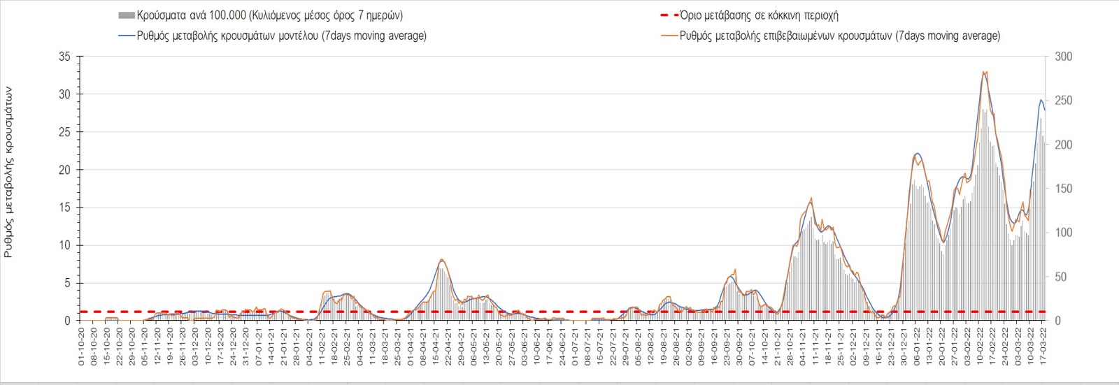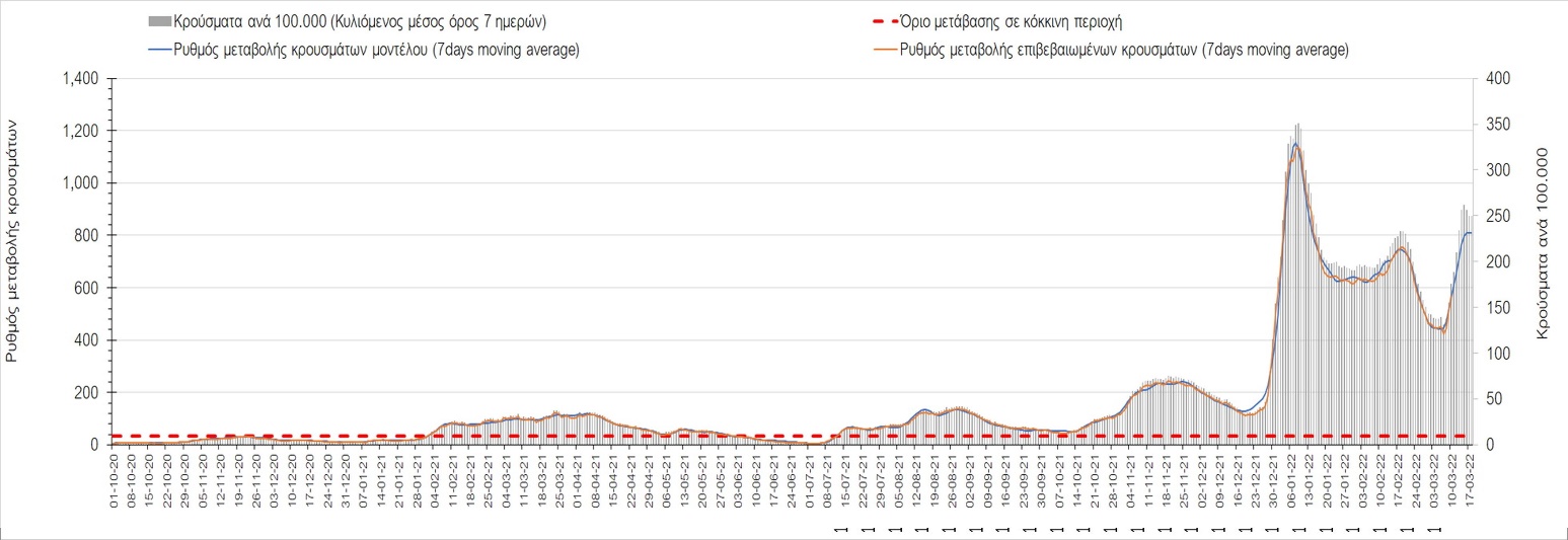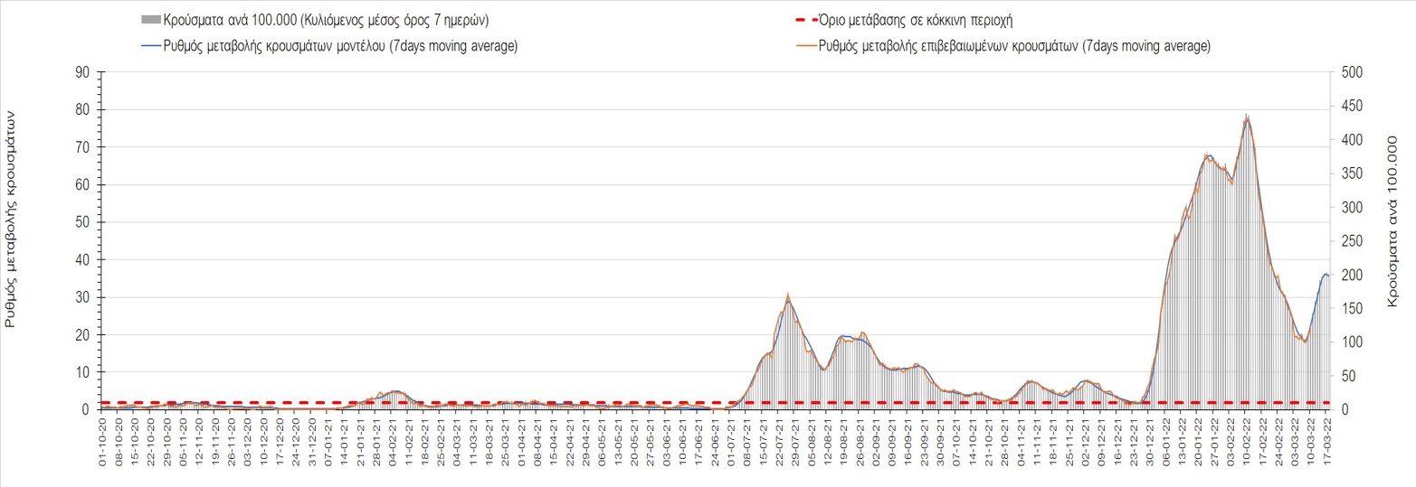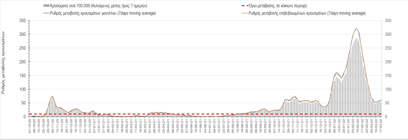 Δυστυχώς και πάλι παρατηρείται ανοδική πορεία που αντικατοπτρίζεται και στον ημερήσιο αριθμό των κρουσμάτων (κυλιόμενος μέσος όρος 7 ημερών), ο οποίος παραμένει πάνω από τις 16.000 (16.175). Για να επανέλθει η ταχεία αποκλιμάκωση της πανδημίας, πέρα από την εφαρμογή των μέτρων (σε συνδυασμό με την σημαντική συνειδητοποίηση εκ μέρους του πληθυσμού ότι χρειάζεται προσοχή και σύνεση για την αντιμετώπιση της διασποράς της παραλλαγής Ο), θα πρέπει να στοχεύσουμε στη διατήρηση και την επέκταση της επίκτητης ανοσίας του πληθυσμού, αλλά και στον πολύ μεγάλο αριθμό των τεστ συνολικά (μοριακά, rapid και self-test) που πραγματοποιούνται καθημερινά, των οποίων ο αριθμός έχει φθάσει σε ημερήσια βάση τις 700.000. Αυτά σε συνδυασμό με τη φυσική ανοσία του πληθυσμού μετά από νόσηση, θα συντελέσουν στην συστηματική αποκλιμάκωση της πανδημίας. Αντίθετα, με τον υπάρχοντα ρυθμό εμβολιασμού αναμνηστικών δόσεων, έχει ήδη καθυστερήσει να επέλθει η πορεία αποκλιμάκωσης, και πλέον (πιθανότατα και σε συνδυασμό με την παρουσία της Ο-2), βλέπουμε ξανά ανοδική πορεία.