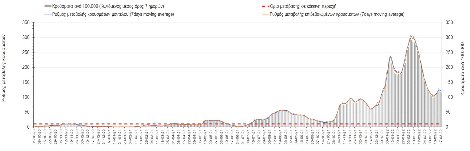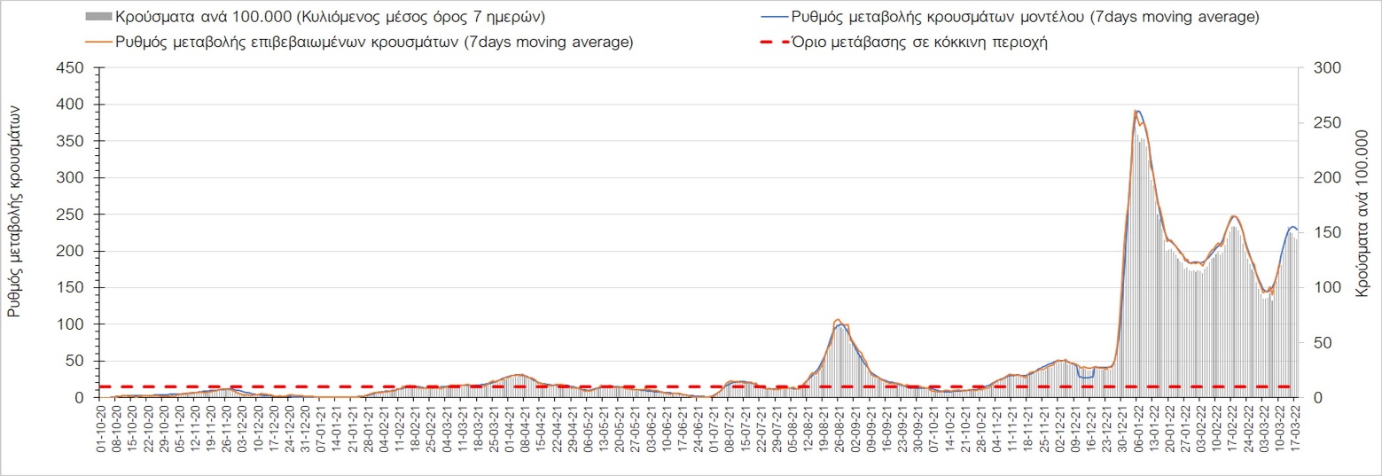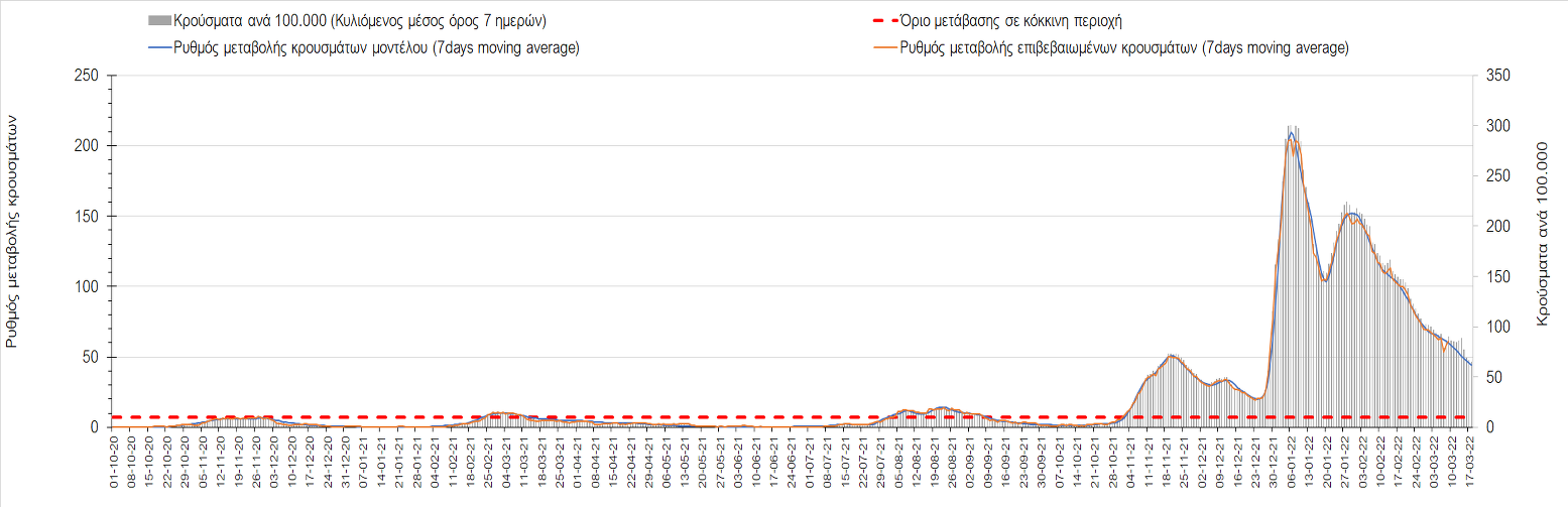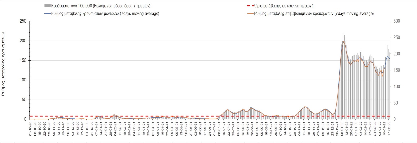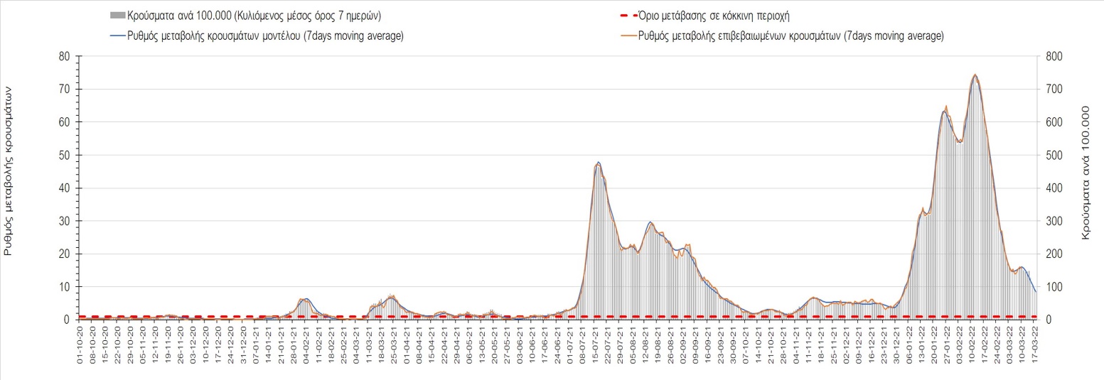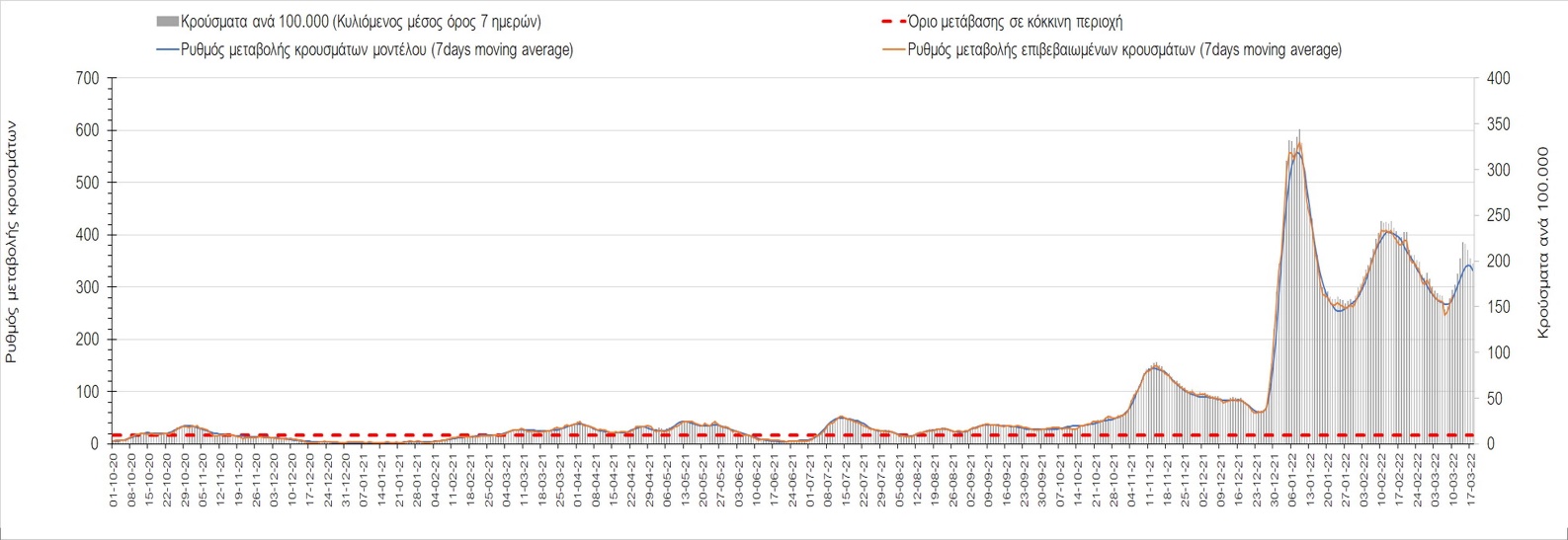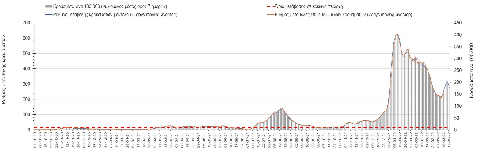 Δυστυχώς και πάλι παρατηρείται ανοδική πορεία που αντικατοπτρίζεται και στον ημερήσιο αριθμό των κρουσμάτων (κυλιόμενος μέσος όρος 7 ημερών), ο οποίος παραμένει πάνω από τις 16.000 (16.175). Για να επανέλθει η ταχεία αποκλιμάκωση της πανδημίας, πέρα από την εφαρμογή των μέτρων (σε συνδυασμό με την σημαντική συνειδητοποίηση εκ μέρους του πληθυσμού ότι χρειάζεται προσοχή και σύνεση για την αντιμετώπιση της διασποράς της παραλλαγής Ο), θα πρέπει να στοχεύσουμε στη διατήρηση και την επέκταση της επίκτητης ανοσίας του πληθυσμού, αλλά και στον πολύ μεγάλο αριθμό των τεστ συνολικά (μοριακά, rapid και self-test) που πραγματοποιούνται καθημερινά, των οποίων ο αριθμός έχει φθάσει σε ημερήσια βάση τις 700.000. Αυτά σε συνδυασμό με τη φυσική ανοσία του πληθυσμού μετά από νόσηση, θα συντελέσουν στην συστηματική αποκλιμάκωση της πανδημίας. Αντίθετα, με τον υπάρχοντα ρυθμό εμβολιασμού αναμνηστικών δόσεων, έχει ήδη καθυστερήσει να επέλθει η πορεία αποκλιμάκωσης, και πλέον (πιθανότατα και σε συνδυασμό με την παρουσία της Ο-2), βλέπουμε ξανά ανοδική πορεία.