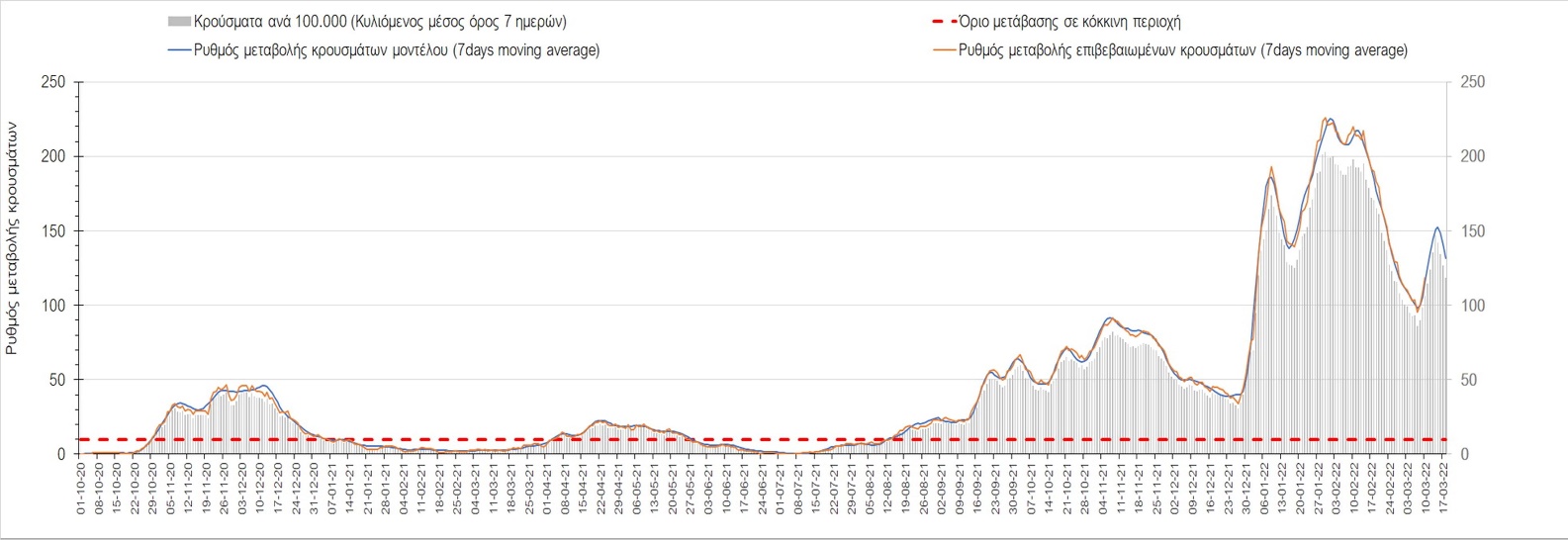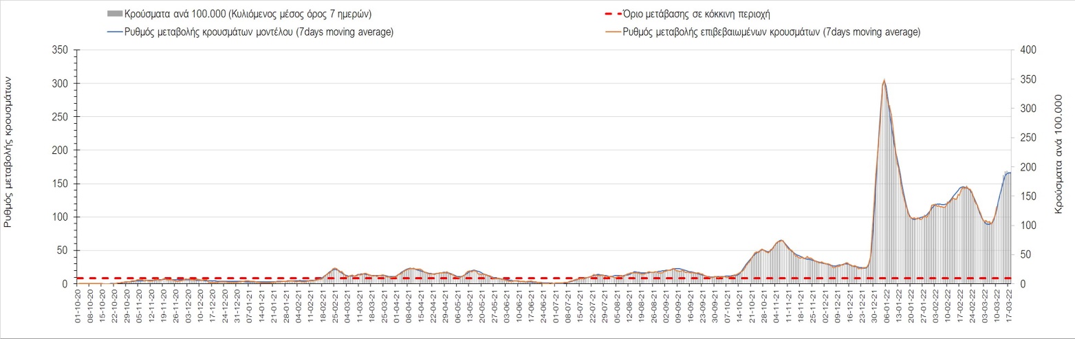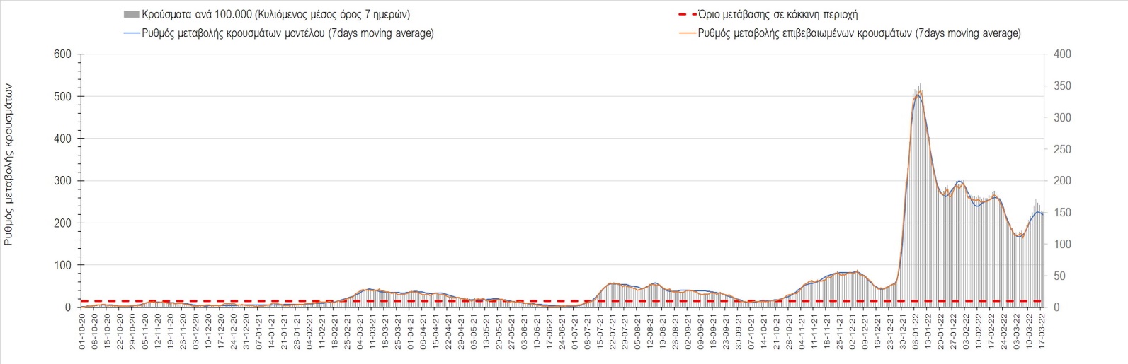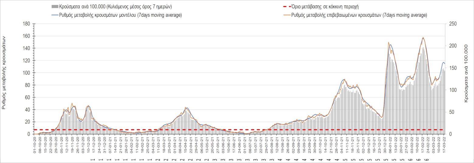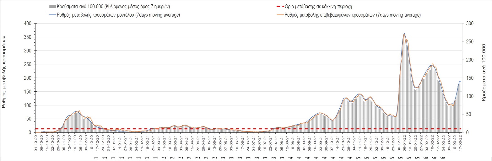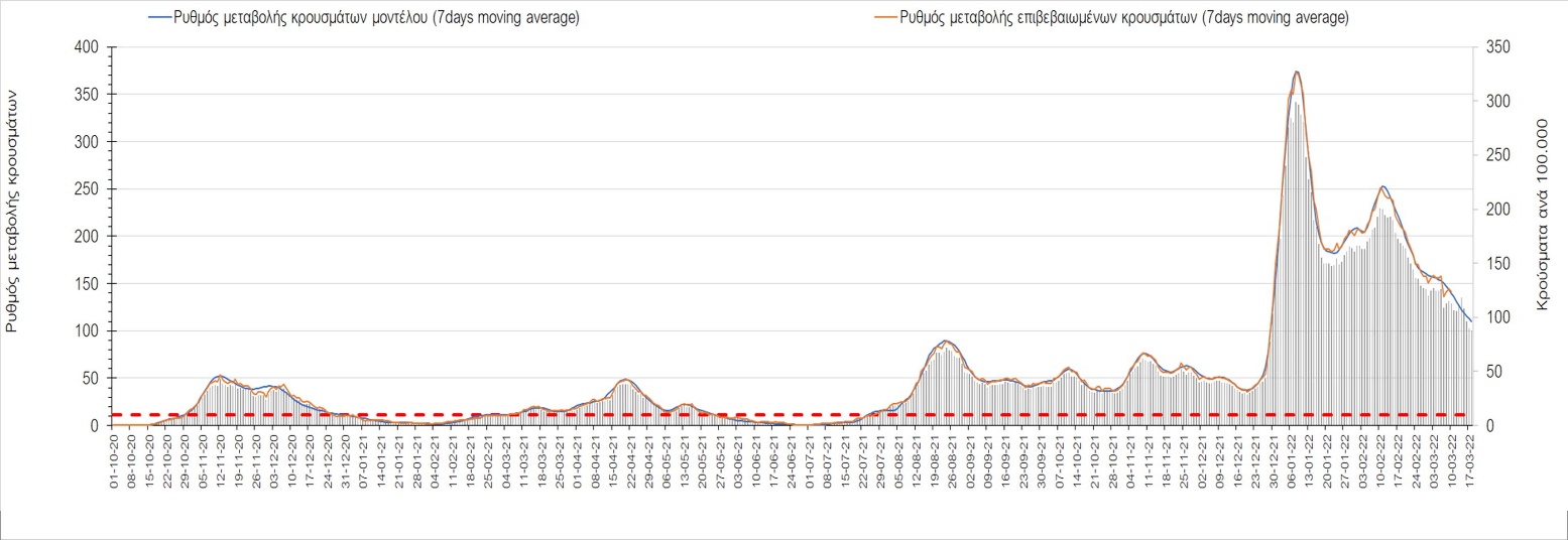 Δυστυχώς και πάλι παρατηρείται ανοδική πορεία που αντικατοπτρίζεται και στον ημερήσιο αριθμό των κρουσμάτων (κυλιόμενος μέσος όρος 7 ημερών), ο οποίος παραμένει πάνω από τις 16.000 (16.175). Για να επανέλθει η ταχεία αποκλιμάκωση της πανδημίας, πέρα από την εφαρμογή των μέτρων (σε συνδυασμό με την σημαντική συνειδητοποίηση εκ μέρους του πληθυσμού ότι χρειάζεται προσοχή και σύνεση για την αντιμετώπιση της διασποράς της παραλλαγής Ο), θα πρέπει να στοχεύσουμε στη διατήρηση και την επέκταση της επίκτητης ανοσίας του πληθυσμού, αλλά και στον πολύ μεγάλο αριθμό των τεστ συνολικά (μοριακά, rapid και self-test) που πραγματοποιούνται καθημερινά, των οποίων ο αριθμός έχει φθάσει σε ημερήσια βάση τις 700.000. Αυτά σε συνδυασμό με τη φυσική ανοσία του πληθυσμού μετά από νόσηση, θα συντελέσουν στην συστηματική αποκλιμάκωση της πανδημίας. Αντίθετα, με τον υπάρχοντα ρυθμό εμβολιασμού αναμνηστικών δόσεων, έχει ήδη καθυστερήσει να επέλθει η πορεία αποκλιμάκωσης, και πλέον (πιθανότατα και σε συνδυασμό με την παρουσία της Ο-2), βλέπουμε ξανά ανοδική πορεία.