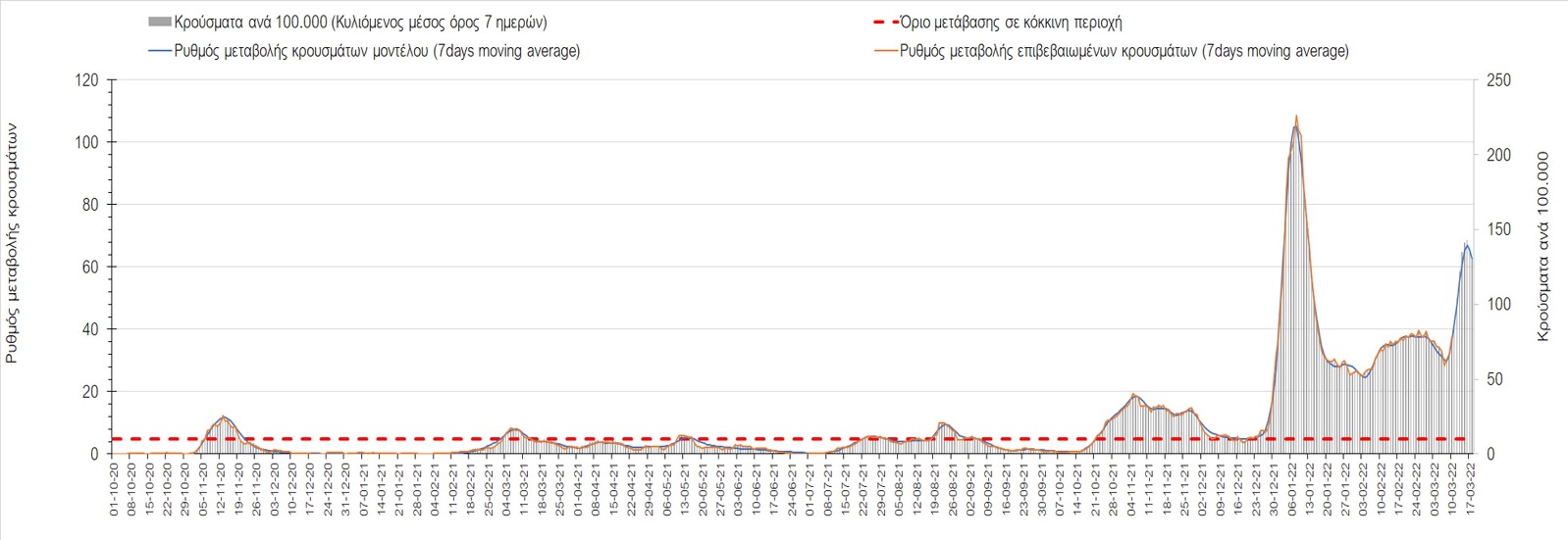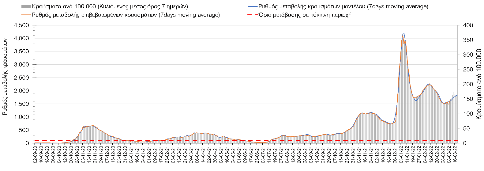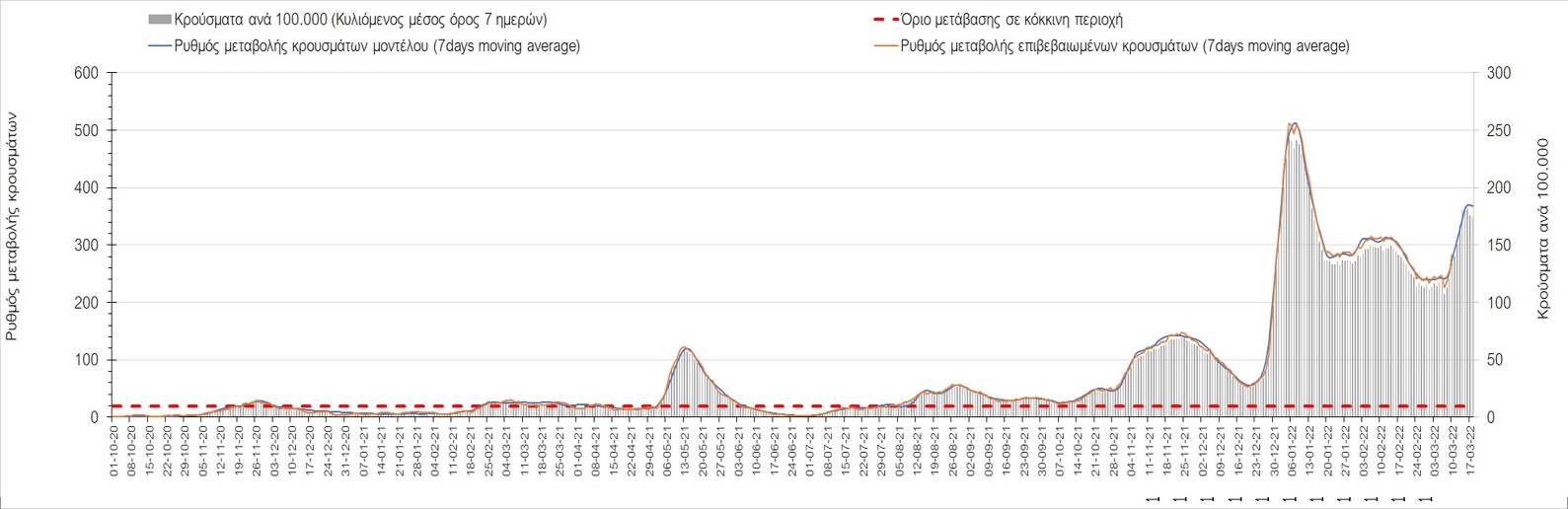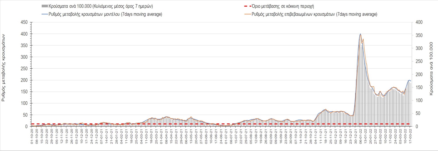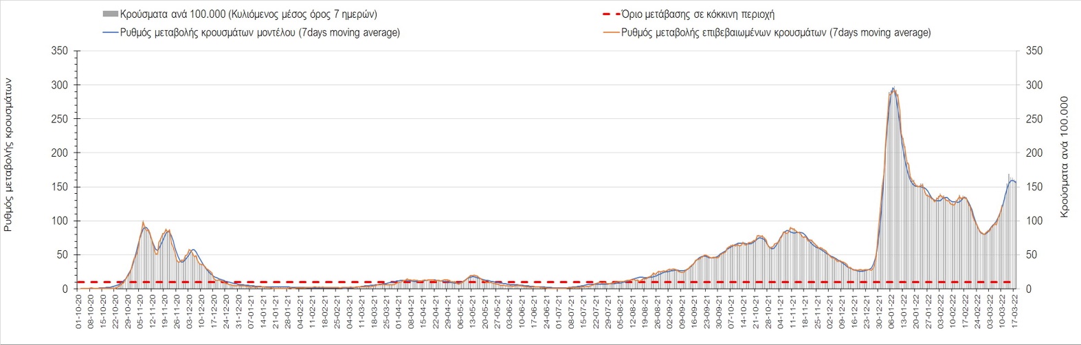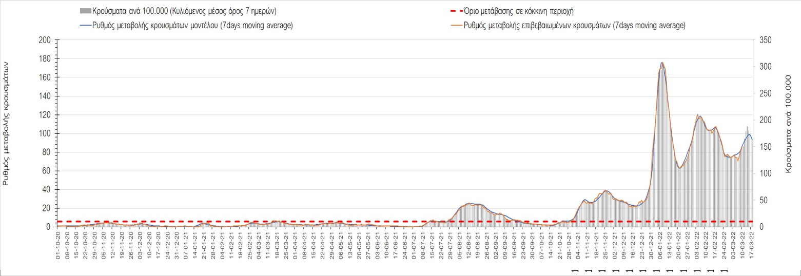 Δυστυχώς και πάλι παρατηρείται ανοδική πορεία που αντικατοπτρίζεται και στον ημερήσιο αριθμό των κρουσμάτων (κυλιόμενος μέσος όρος 7 ημερών), ο οποίος παραμένει πάνω από τις 16.000 (16.175). Για να επανέλθει η ταχεία αποκλιμάκωση της πανδημίας, πέρα από την εφαρμογή των μέτρων (σε συνδυασμό με την σημαντική συνειδητοποίηση εκ μέρους του πληθυσμού ότι χρειάζεται προσοχή και σύνεση για την αντιμετώπιση της διασποράς της παραλλαγής Ο), θα πρέπει να στοχεύσουμε στη διατήρηση και την επέκταση της επίκτητης ανοσίας του πληθυσμού, αλλά και στον πολύ μεγάλο αριθμό των τεστ συνολικά (μοριακά, rapid και self-test) που πραγματοποιούνται καθημερινά, των οποίων ο αριθμός έχει φθάσει σε ημερήσια βάση τις 700.000. Αυτά σε συνδυασμό με τη φυσική ανοσία του πληθυσμού μετά από νόσηση, θα συντελέσουν στην συστηματική αποκλιμάκωση της πανδημίας. Αντίθετα, με τον υπάρχοντα ρυθμό εμβολιασμού αναμνηστικών δόσεων, έχει ήδη καθυστερήσει να επέλθει η πορεία αποκλιμάκωσης, και πλέον (πιθανότατα και σε συνδυασμό με την παρουσία της Ο-2), βλέπουμε ξανά ανοδική πορεία.