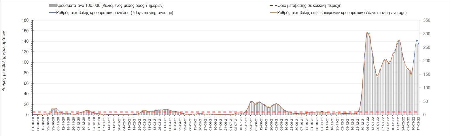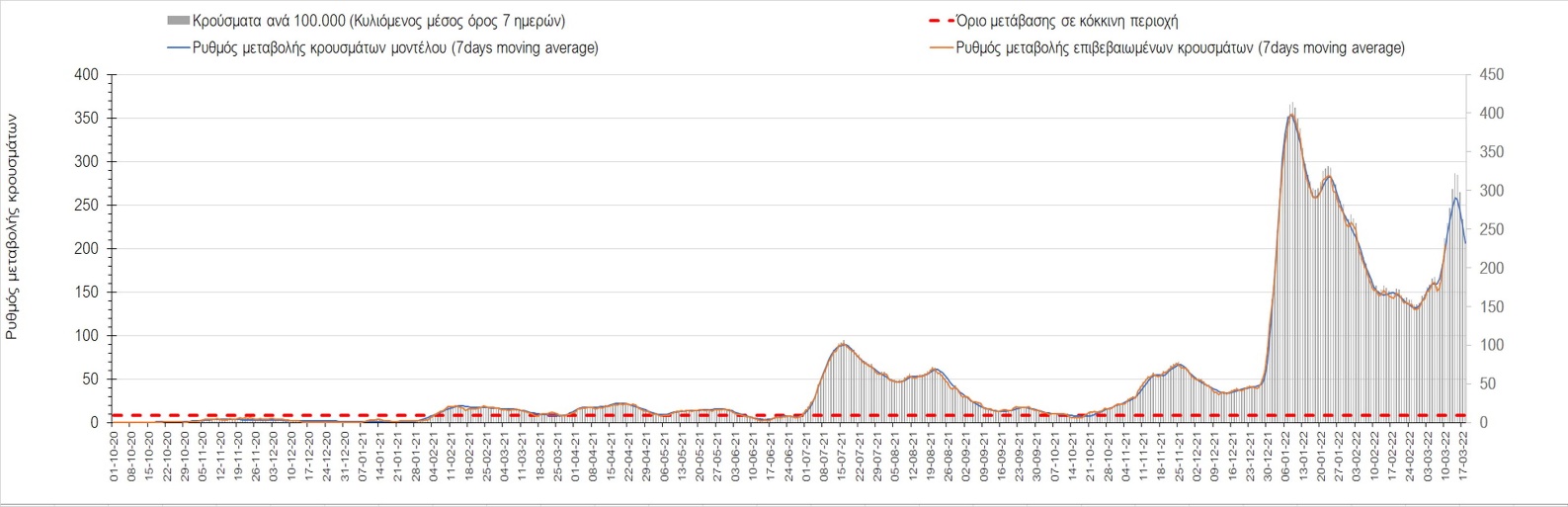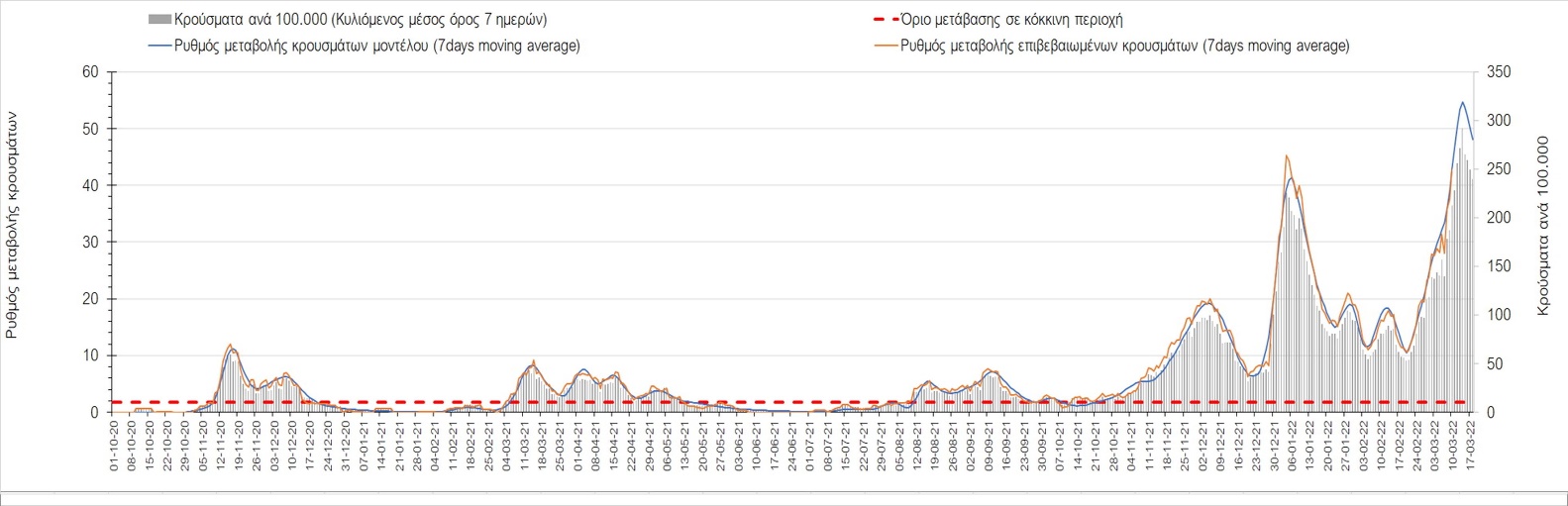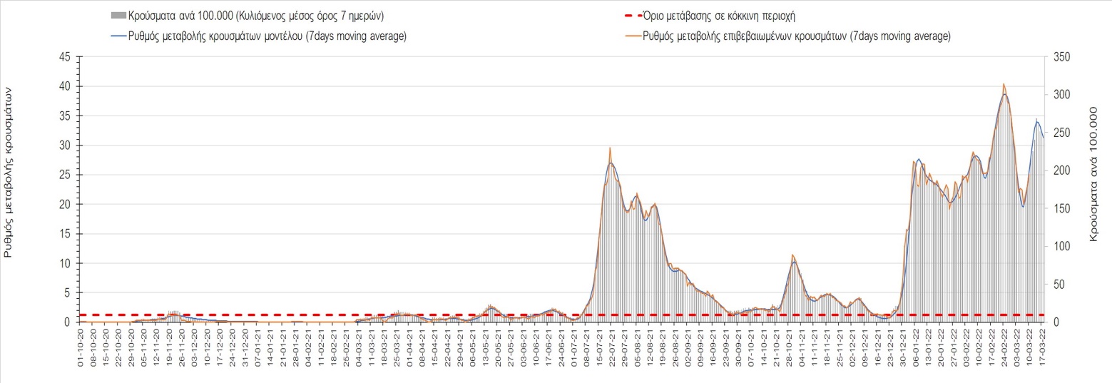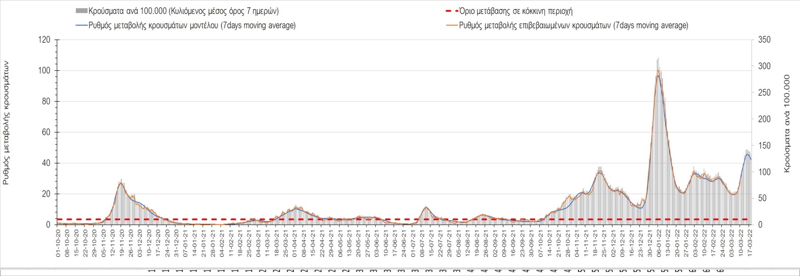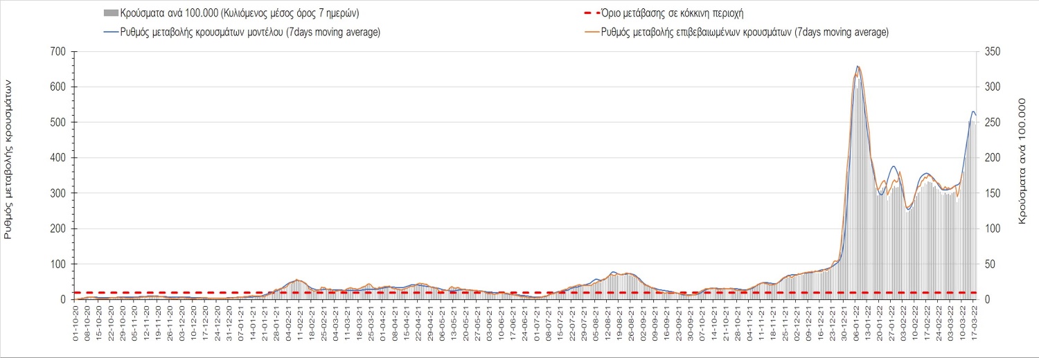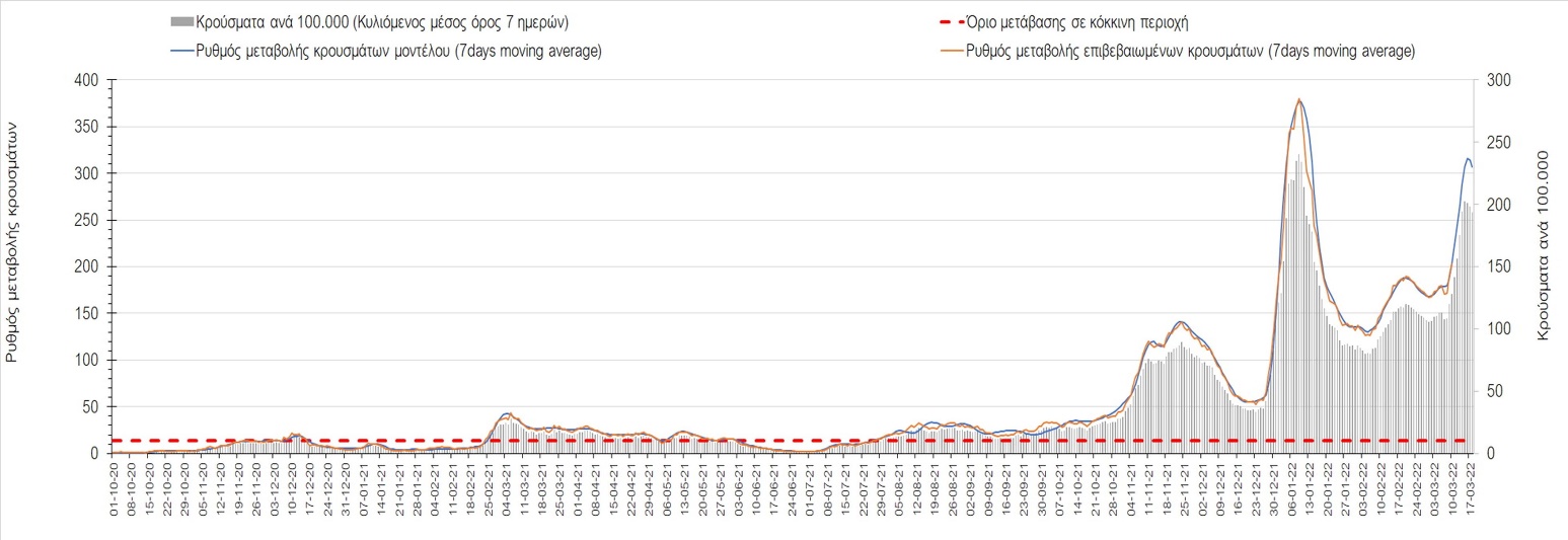 Δυστυχώς και πάλι παρατηρείται ανοδική πορεία που αντικατοπτρίζεται και στον ημερήσιο αριθμό των κρουσμάτων (κυλιόμενος μέσος όρος 7 ημερών), ο οποίος παραμένει πάνω από τις 16.000 (16.175). Για να επανέλθει η ταχεία αποκλιμάκωση της πανδημίας, πέρα από την εφαρμογή των μέτρων (σε συνδυασμό με την σημαντική συνειδητοποίηση εκ μέρους του πληθυσμού ότι χρειάζεται προσοχή και σύνεση για την αντιμετώπιση της διασποράς της παραλλαγής Ο), θα πρέπει να στοχεύσουμε στη διατήρηση και την επέκταση της επίκτητης ανοσίας του πληθυσμού, αλλά και στον πολύ μεγάλο αριθμό των τεστ συνολικά (μοριακά, rapid και self-test) που πραγματοποιούνται καθημερινά, των οποίων ο αριθμός έχει φθάσει σε ημερήσια βάση τις 700.000. Αυτά σε συνδυασμό με τη φυσική ανοσία του πληθυσμού μετά από νόσηση, θα συντελέσουν στην συστηματική αποκλιμάκωση της πανδημίας. Αντίθετα, με τον υπάρχοντα ρυθμό εμβολιασμού αναμνηστικών δόσεων, έχει ήδη καθυστερήσει να επέλθει η πορεία αποκλιμάκωσης, και πλέον (πιθανότατα και σε συνδυασμό με την παρουσία της Ο-2), βλέπουμε ξανά ανοδική πορεία.