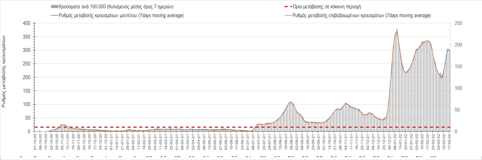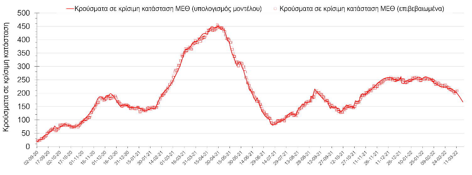 Συμπεράσματα: Με βάση τα αποτελέσματα, σε σχέση με προχθές, παρατηρήθηκε πρακτικά ίδιος αριθμός ασθενών σε κρίσιμη κατάσταση (διασωληνωμένοι σε ΜΕΘ), και υψηλότερος αριθμός θανάτων από COVID-19. Σε πανελλαδικό επίπεδο ο κυλιόμενος εβδομαδιαίος μέσος όρος του δείκτη θετικότητας διαμορφώθηκε στο 7,6% (η ημερήσια τιμή είναι 8,7%) ενώ ο κυλιόμενος εβδομαδιαίος μέσος όρος του πραγματικού αριθμού αναπαραγωγής Rt (δηλαδή ο αριθμός των ατόμων που ένας φορέας μπορεί να επιμολύνει) αυξήθηκε σημαντικά στο 1,09 (Rt πάνω από τη μονάδα υποδηλώνει καθαρή αύξηση της διασποράς του ιού στην κοινότητα). Η σημαντική αυτή αύξηση του Rt τις τελευταίες τρεις ημέρες υποδηλώνει νέο ανοδικό κύμα, του οποίου το ύψος και η διάρκεια θα εξαρτηθούν από το βαθμό που η μετάλλαξη Ο 2 έχει παρεισφρήσει στην κοινότητα, οπότε αυτή τη στιγμή είναι απαραίτητο να ενταθούν οι προσπάθειες για αλληλούχιση, τα οποία είναι απαραίτητα και για την επαναπαραμετροποίηση του μοντέλου.