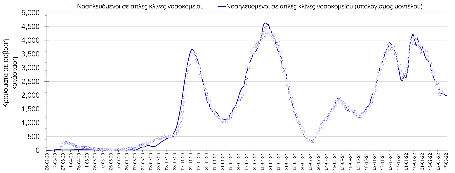 Σχήμα 2. Αριθμός κρουσμάτων σε σοβαρή κατάσταση (νοσηλευόμενοι σε απλές κλίνες) σύμφωνα με τα στοιχεία του ΕΟΔΥ και τις προβλέψεις της υπολογιστικής πλατφόρμας CORE.