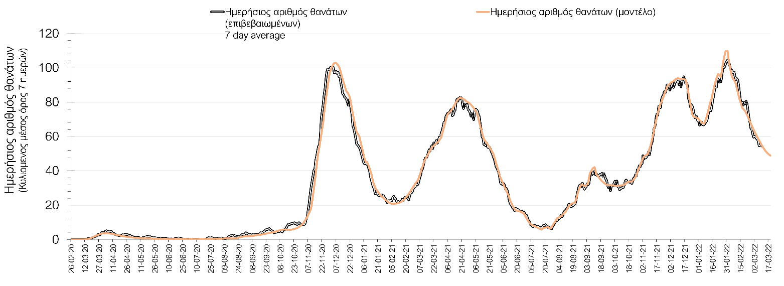 Ο αριθμός ημερήσιων θανάτων (56) που καταγράφηκε την Πέμπτη είναι χαμηλότερος σε σχέση με την Τετάρτη (61). Όπως είχαμε προβλέψει ο κυλιόμενος εβδομαδιαίος μέσος όρος που την Πέμτπτη είναι 54,4 παραμένει υψηλός, ιδιαίτερα σε σχέση με τον αριθμό των νοσηλειών σε κρίσιμη κατάσταση (διασωληνωμένοι σε ΜΕΘ).