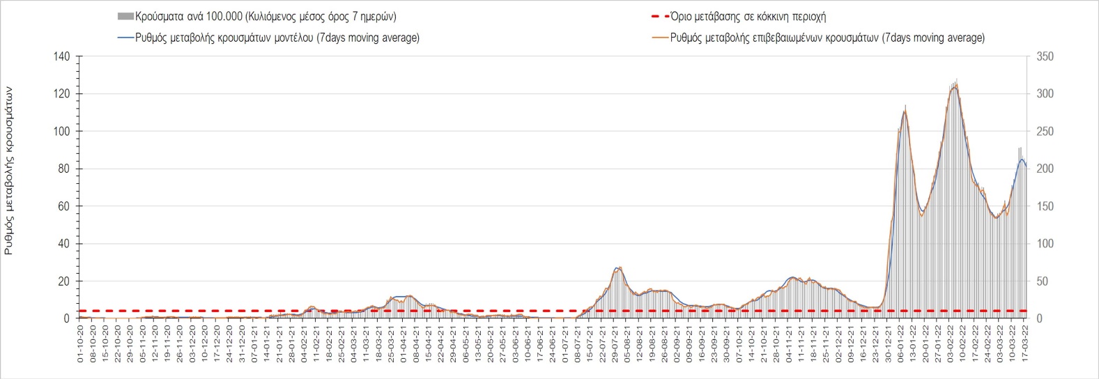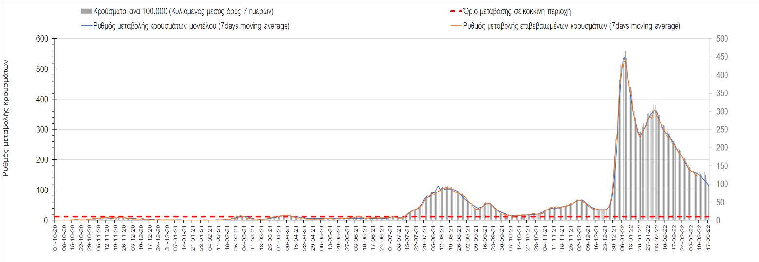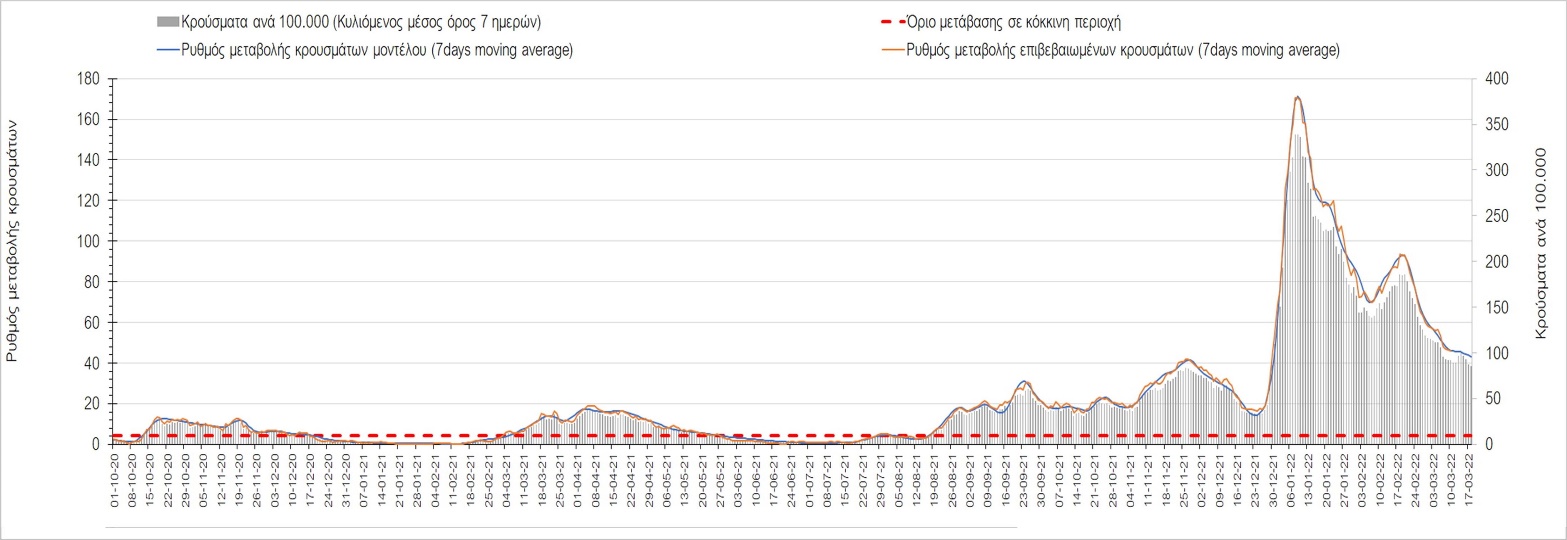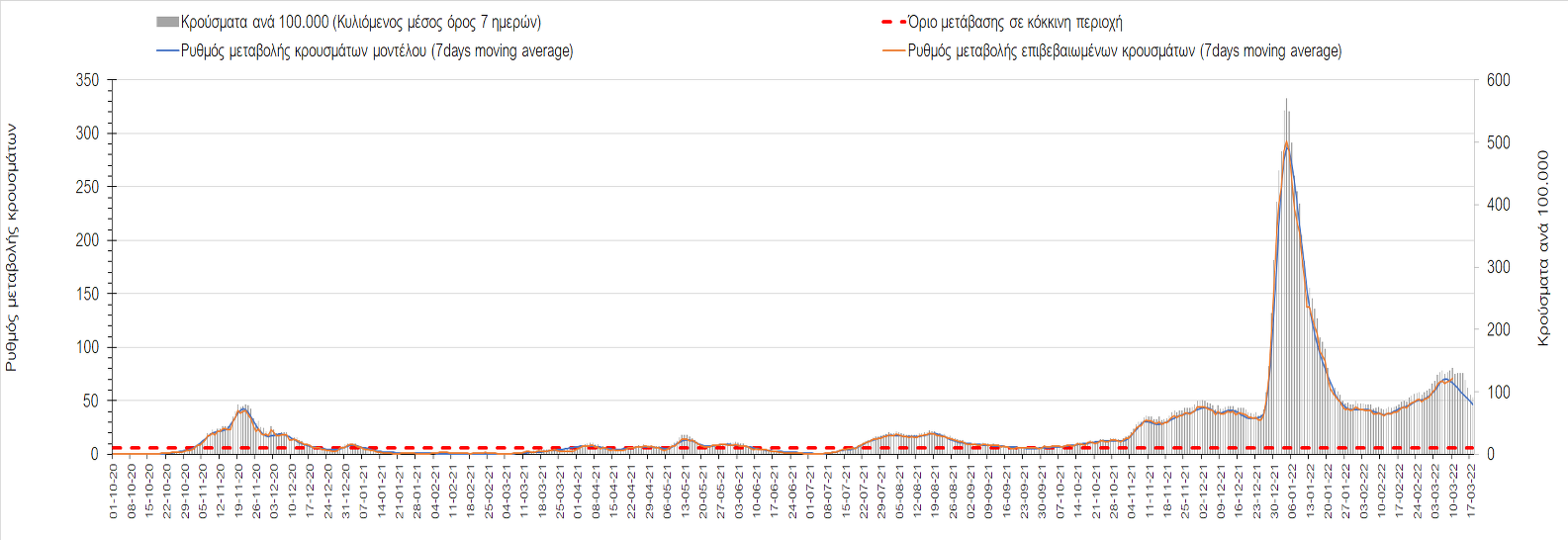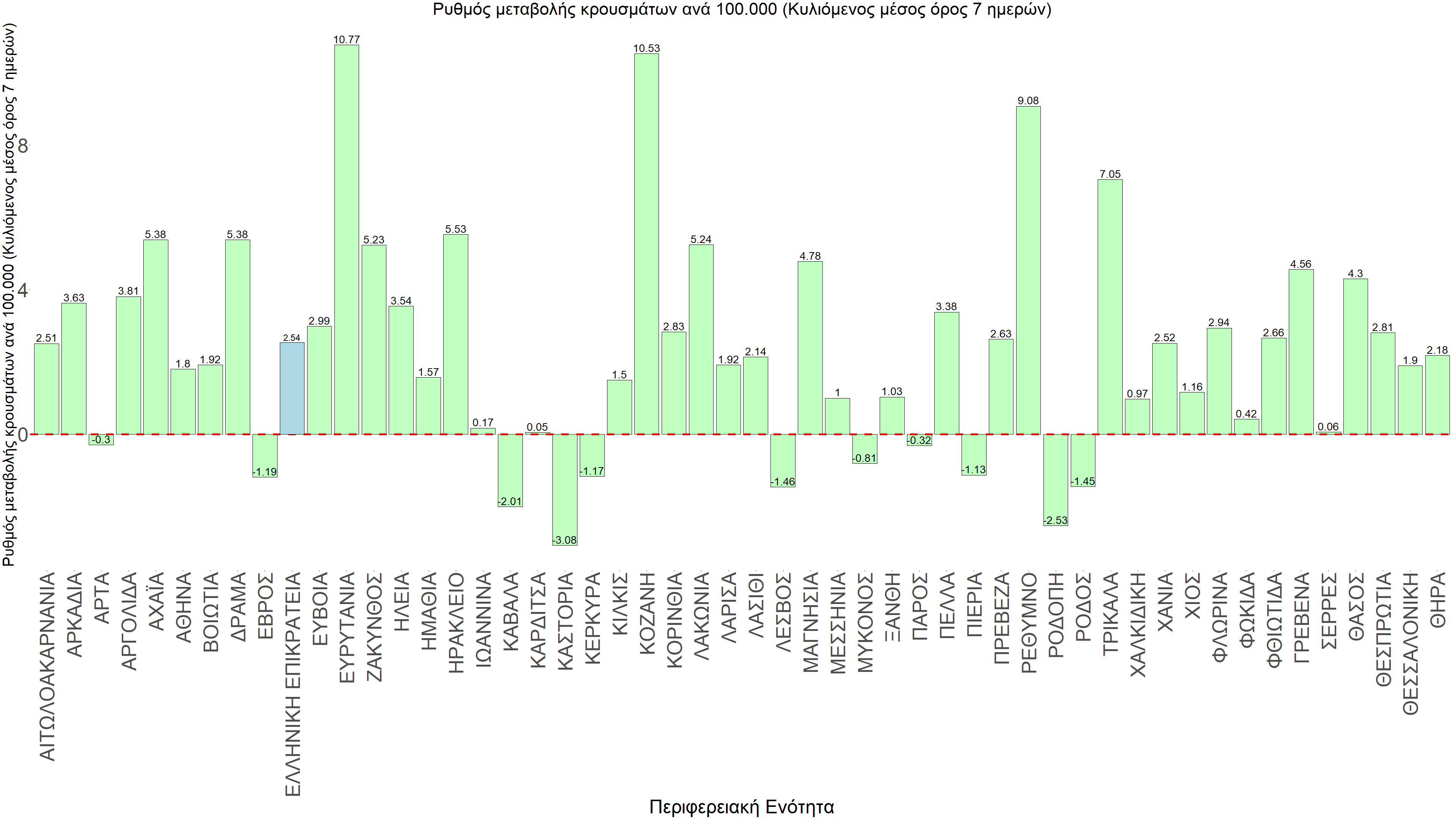 Η αποτύπωση των τάσεων στις επιμέρους περιοχές, παρουσιάζεται στο Σχήμα 61, όπου παρουσιάζεται ο ρυθμός μεταβολής των νέων κρουσμάτων ανά 100.000 κατοίκους (κυλιόμενος μέσος όρος 7 ημερών) των επιμέρους περιοχών. Θετικές τιμές του ρυθμού μεταβολής υποδηλώνουν άνοδο, ενώ αρνητικές τιμές υποδηλώνουν πτωτική πορεία.
