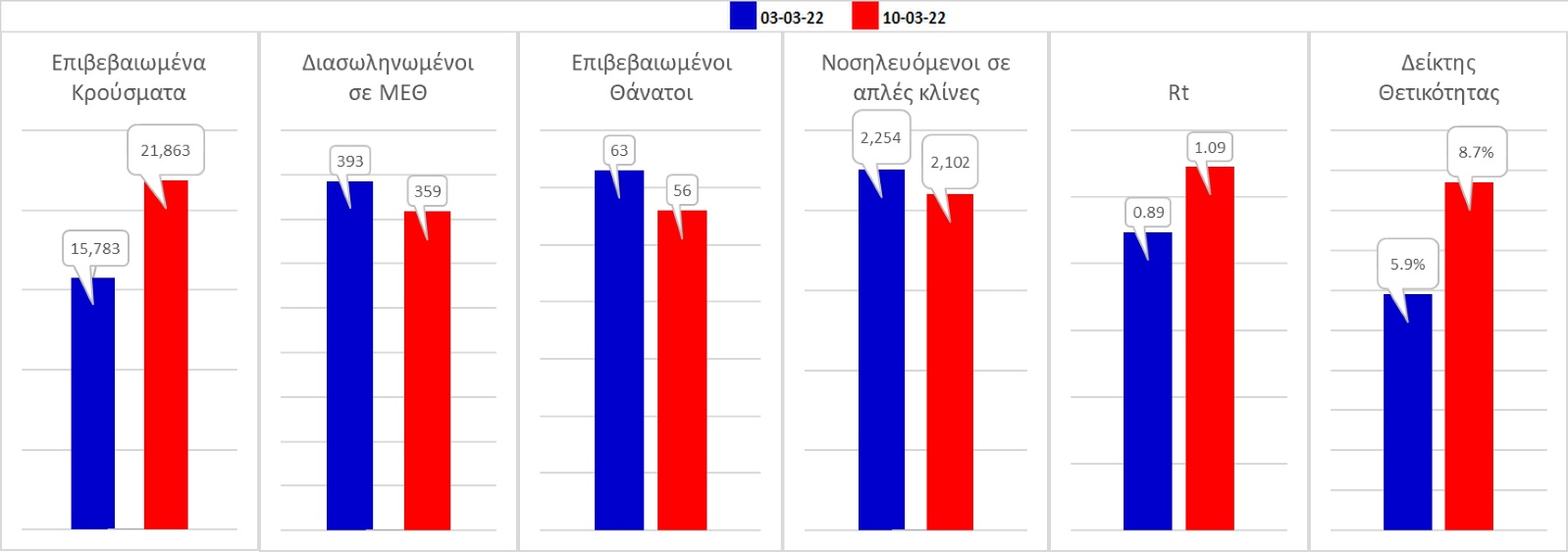 Σχήμα 59. Συγκριτικά αποτελέσματα της επιδημιολογικής εικόνας της σημερινής Πέμπτης (10/03/2022) σε σχέση με την προηγούμενη (03/03/2022)