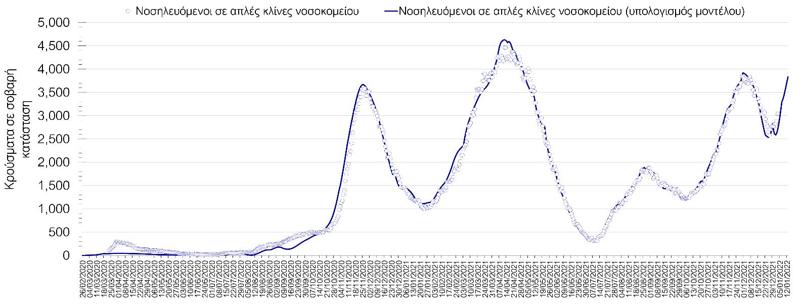 Η πορεία της μέσης εβδομαδιαίας τιμής των κρουσμάτων, καθώς και του κυλιόμενου μέσου όρου 7 ημερών του αριθμού των κρουσμάτων ανά 100.000 πληθυσμού, όπως έχουν καταγραφεί από τον ΕΟΔΥ και η αναμενόμενη πορεία τους όπως προδιαγράφεται από την υπολογιστική πλατφόρμα CORE για την Ελληνική επικράτεια μέχρι τις 15 Ιανουαρίου, αποτυπώνονται στο Σχήμα 4. Αυτή η προβλεπόμενη πορεία, που αφορά τα κρούσματα, τους νοσηλευόμενους σε απλές κλίνες, όσο και σε ΜΕΘ, καθώς επίσης και τους θανάτους, βασίζεται στις ακόλουθες παραδοχές: