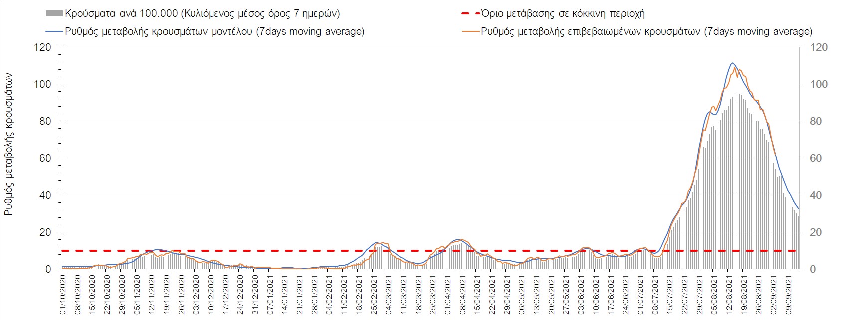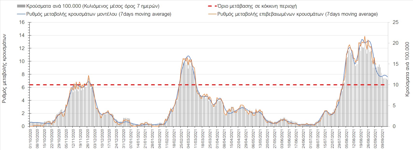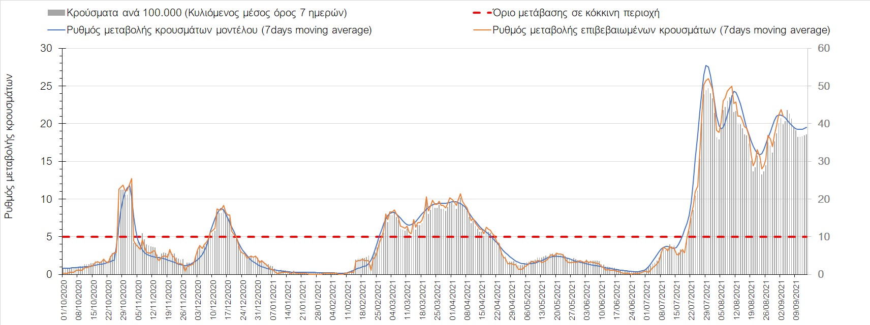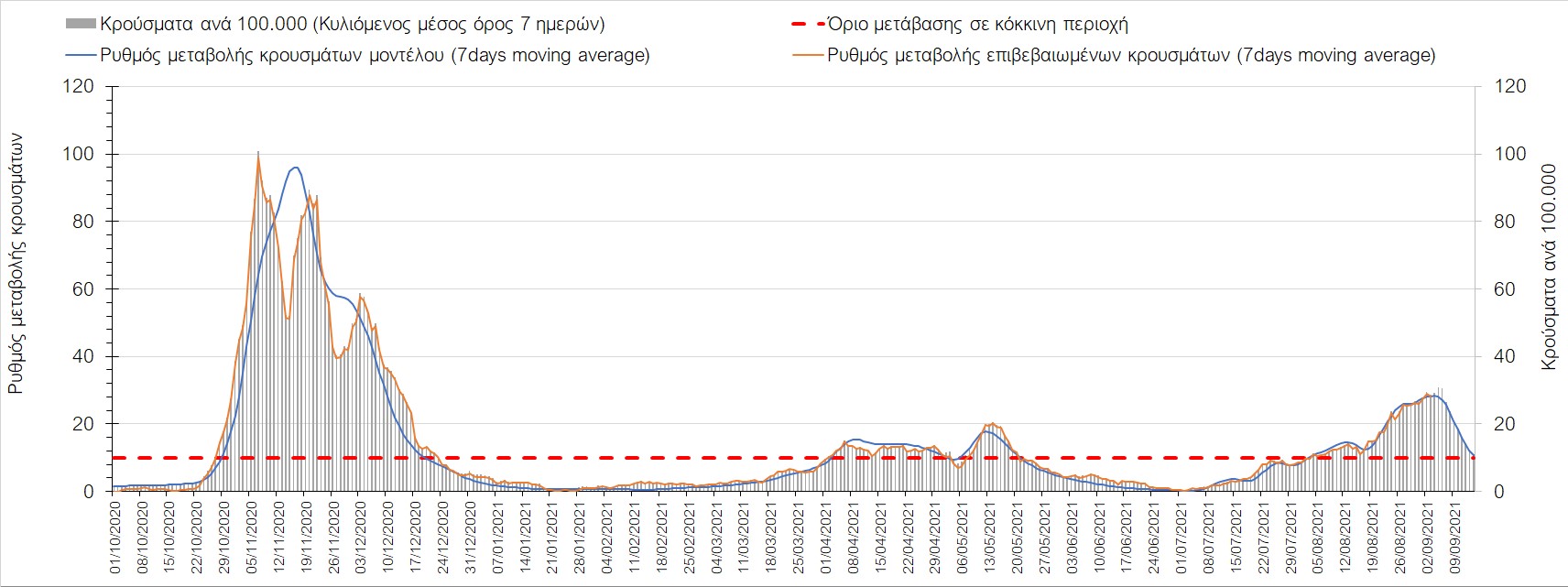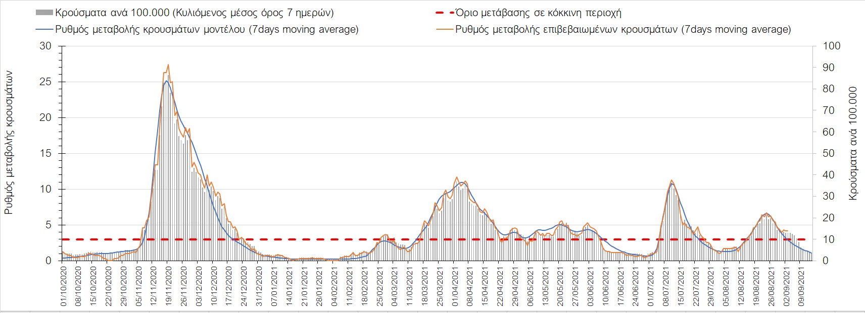 Σε πανελλαδικό επίπεδο ο κυλιόμενος εβδομαδιαίος μέσος όρος του δείκτη θετικότητας διαμορφώθηκε στο 3,0% (η ημερήσια τιμή το Σάββατο είναι 2,5%) ενώ ο κυλιόμενος εβδομαδιαίος μέσος όρος του πραγματικού αριθμού αναπαραγωγής Rt (δηλαδή ο αριθμός των ατόμων που ένας φορέας μπορεί να επιμολύνει) μειώθηκε ελαφρά και διαμορφώθηκε στο 0,86 (Rt κάτω από τη μονάδα υποδηλώνει μείωση της διασποράς του ιού στην κοινότητα). Συνολικά η πορεία της πανδημίας είναι αυξητική από τις 28/6 και μετά, όμως η πτωτική τάση των τελευταίων ημερών αντικατοπτρίζεται και από τον ημερήσιο αριθμό των κρουσμάτων (κυλιόμενος μέσος όρος 7 ημερών), ο οποίος έπεσε κάτω από τα 2800 (2611).