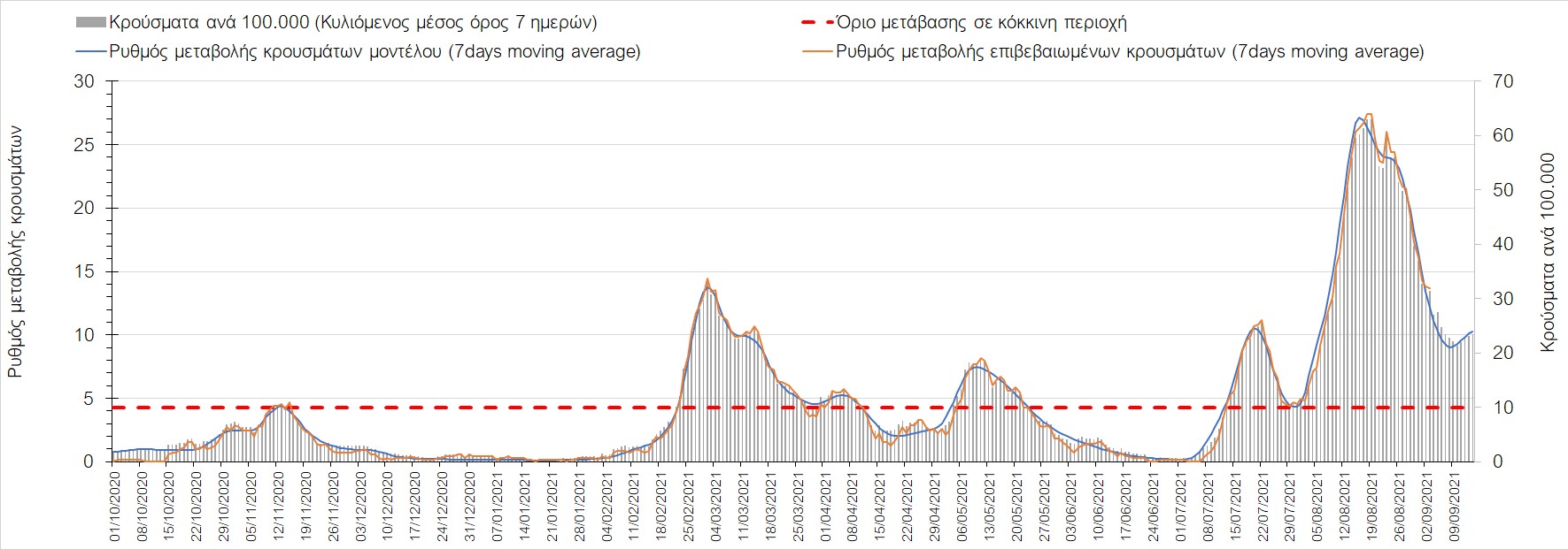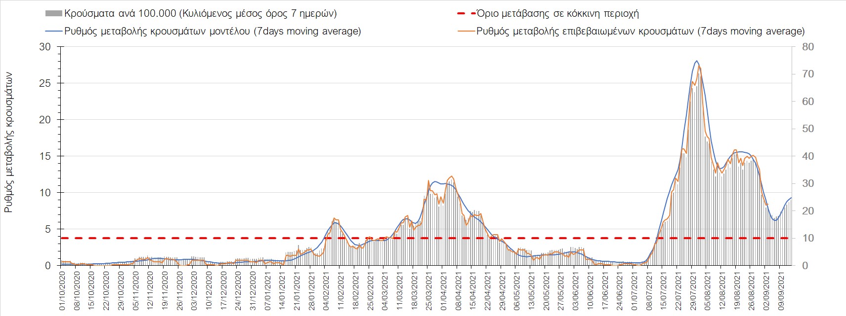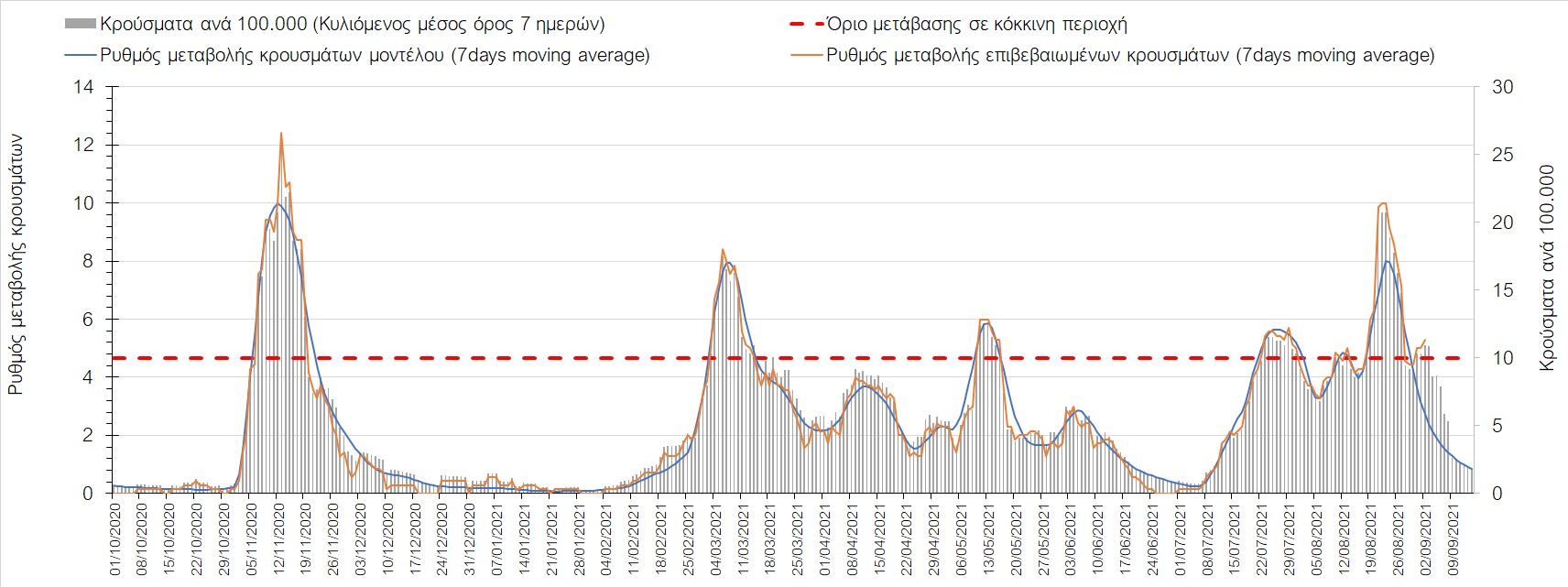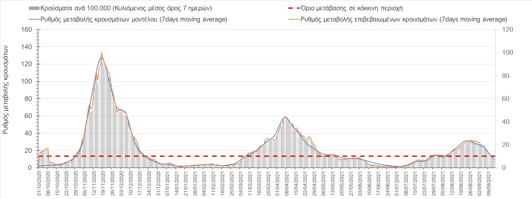 Σε πανελλαδικό επίπεδο ο κυλιόμενος εβδομαδιαίος μέσος όρος του δείκτη θετικότητας διαμορφώθηκε στο 3,0% (η ημερήσια τιμή το Σάββατο είναι 2,5%) ενώ ο κυλιόμενος εβδομαδιαίος μέσος όρος του πραγματικού αριθμού αναπαραγωγής Rt (δηλαδή ο αριθμός των ατόμων που ένας φορέας μπορεί να επιμολύνει) μειώθηκε ελαφρά και διαμορφώθηκε στο 0,86 (Rt κάτω από τη μονάδα υποδηλώνει μείωση της διασποράς του ιού στην κοινότητα). Συνολικά η πορεία της πανδημίας είναι αυξητική από τις 28/6 και μετά, όμως η πτωτική τάση των τελευταίων ημερών αντικατοπτρίζεται και από τον ημερήσιο αριθμό των κρουσμάτων (κυλιόμενος μέσος όρος 7 ημερών), ο οποίος έπεσε κάτω από τα 2800 (2611).